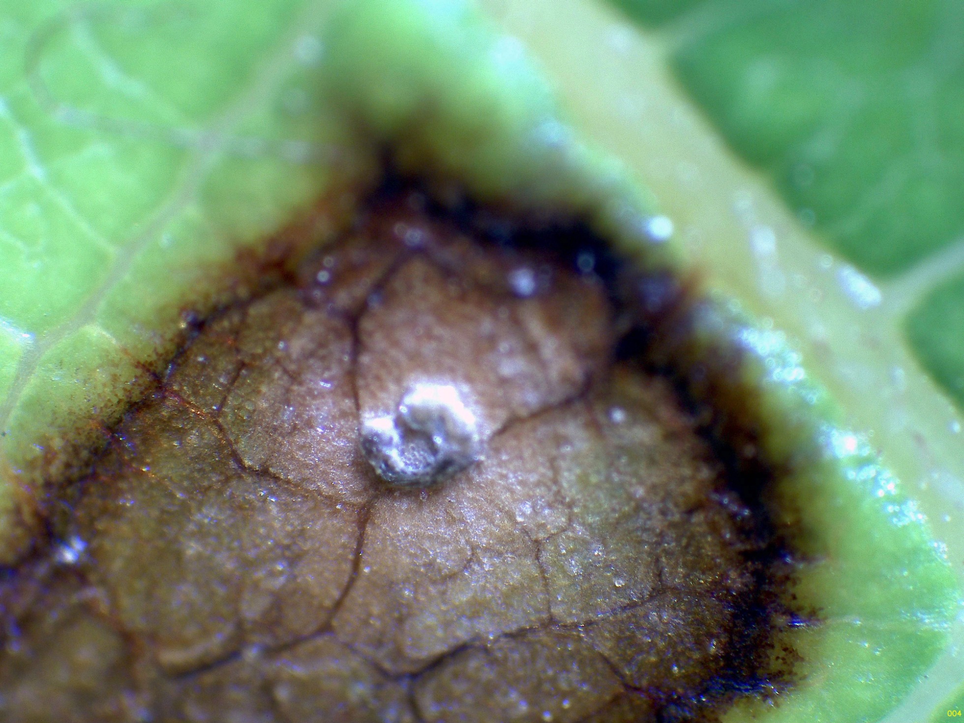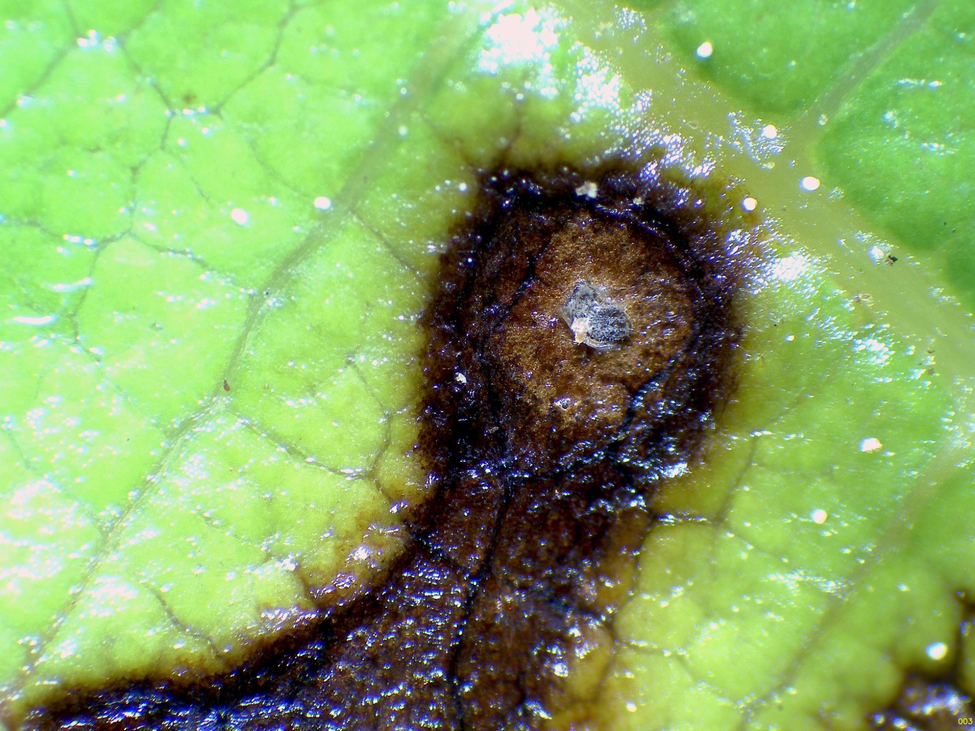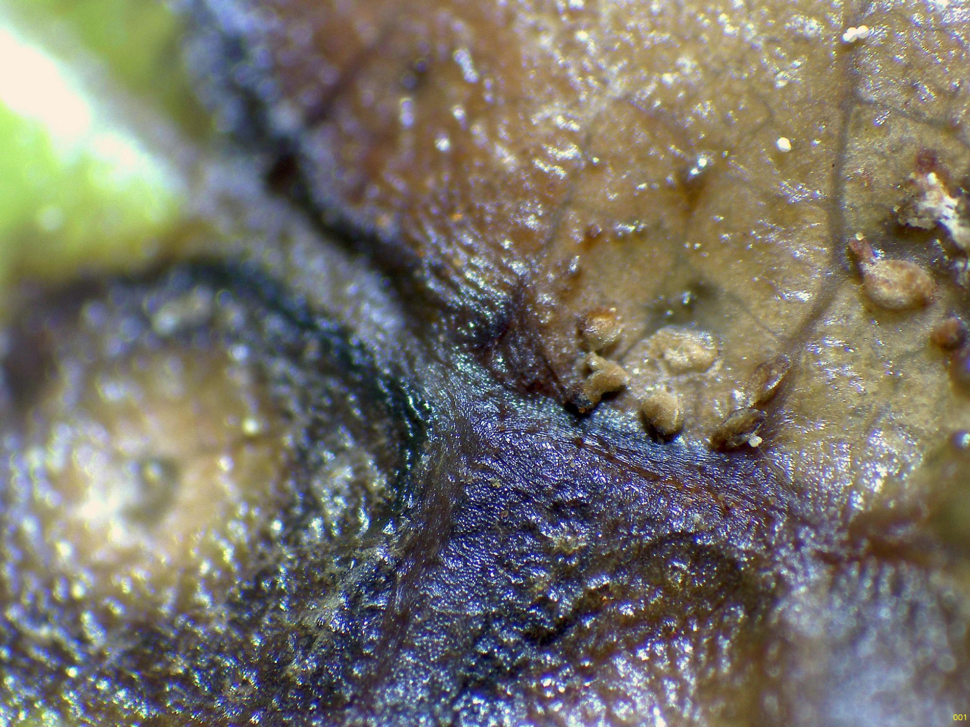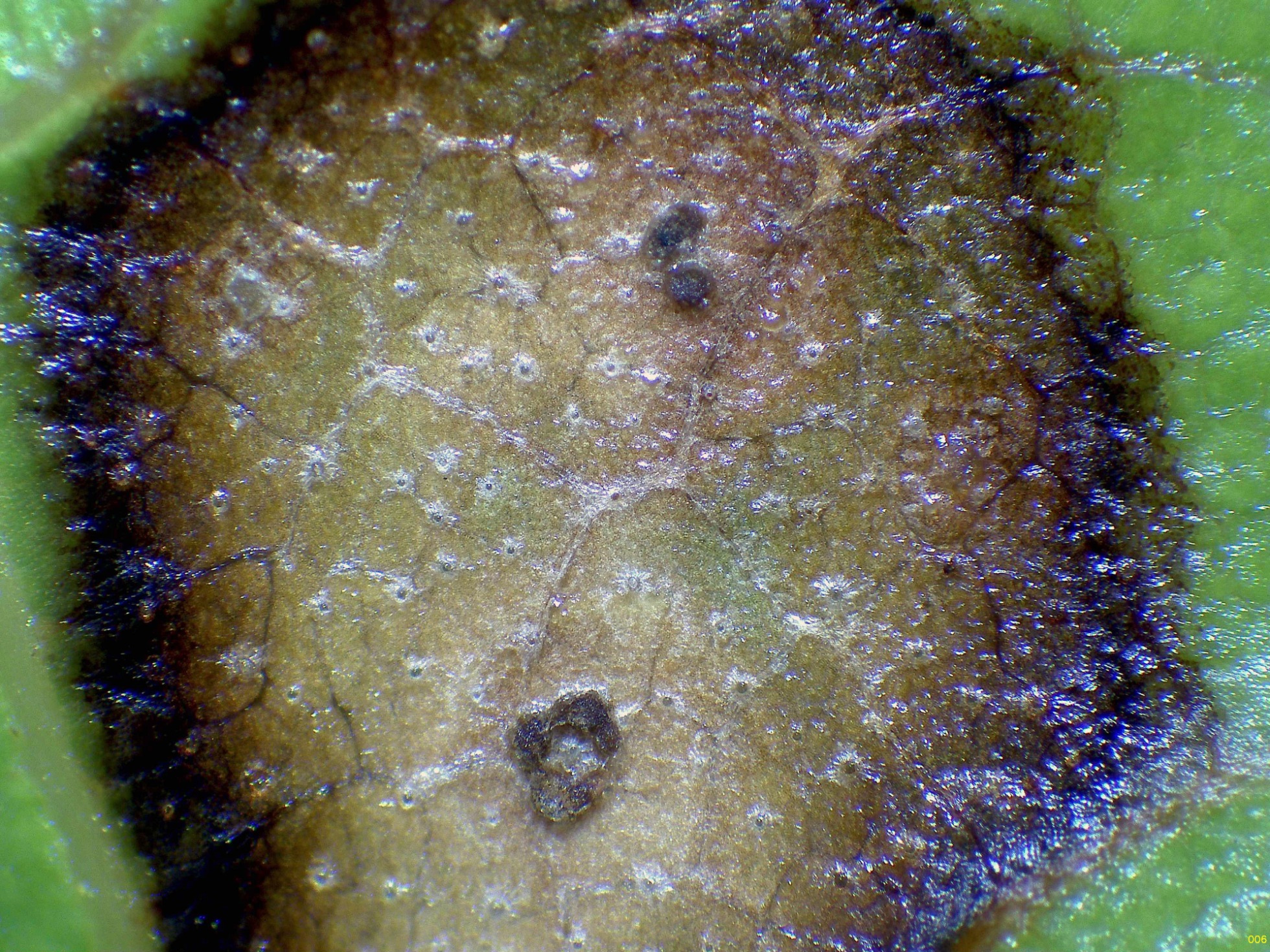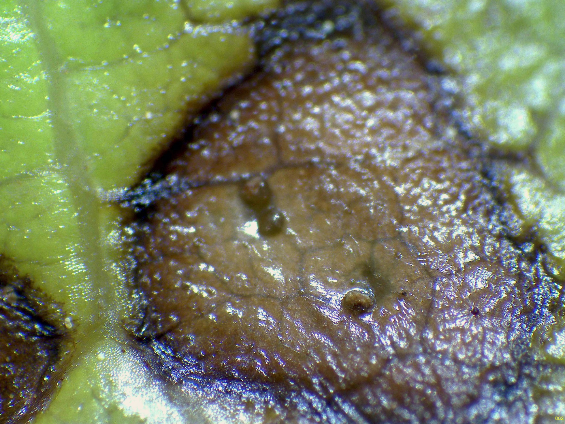 Unos diminutos picnidios brotando sobre unas hojas verdes, aún sujetas al árbol de Morus nigra (Morera negra).
