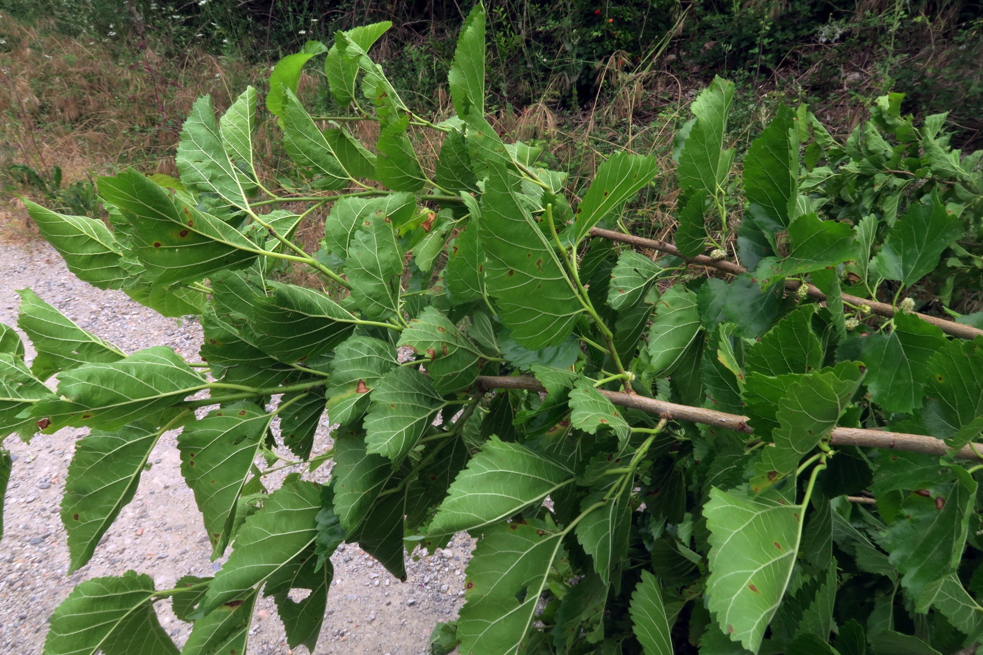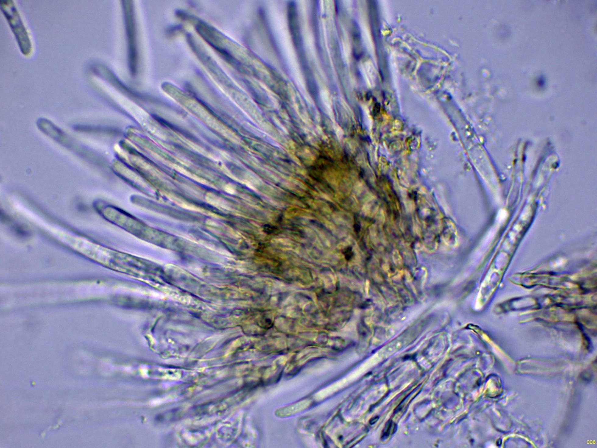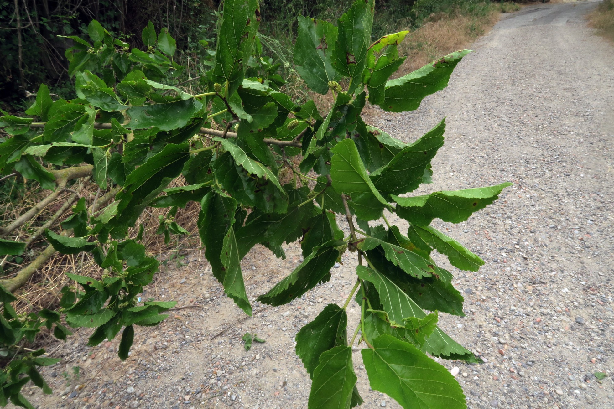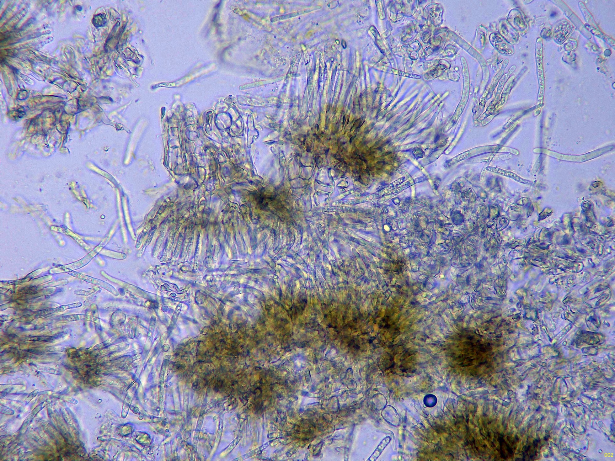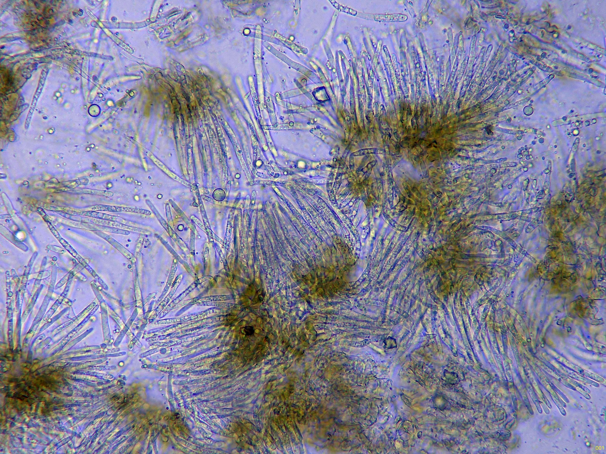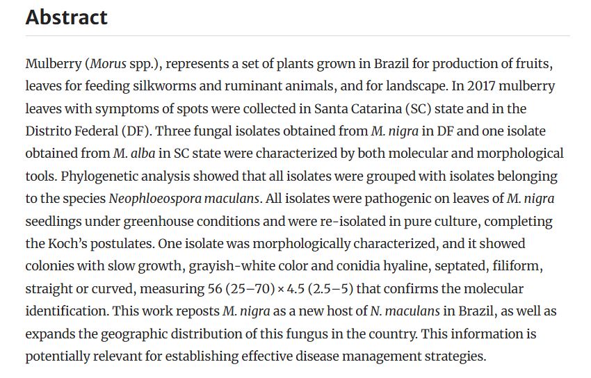 Unos diminutos picnidios brotando sobre unas hojas verdes, aún sujetas al árbol de Morus nigra (Morera negra).