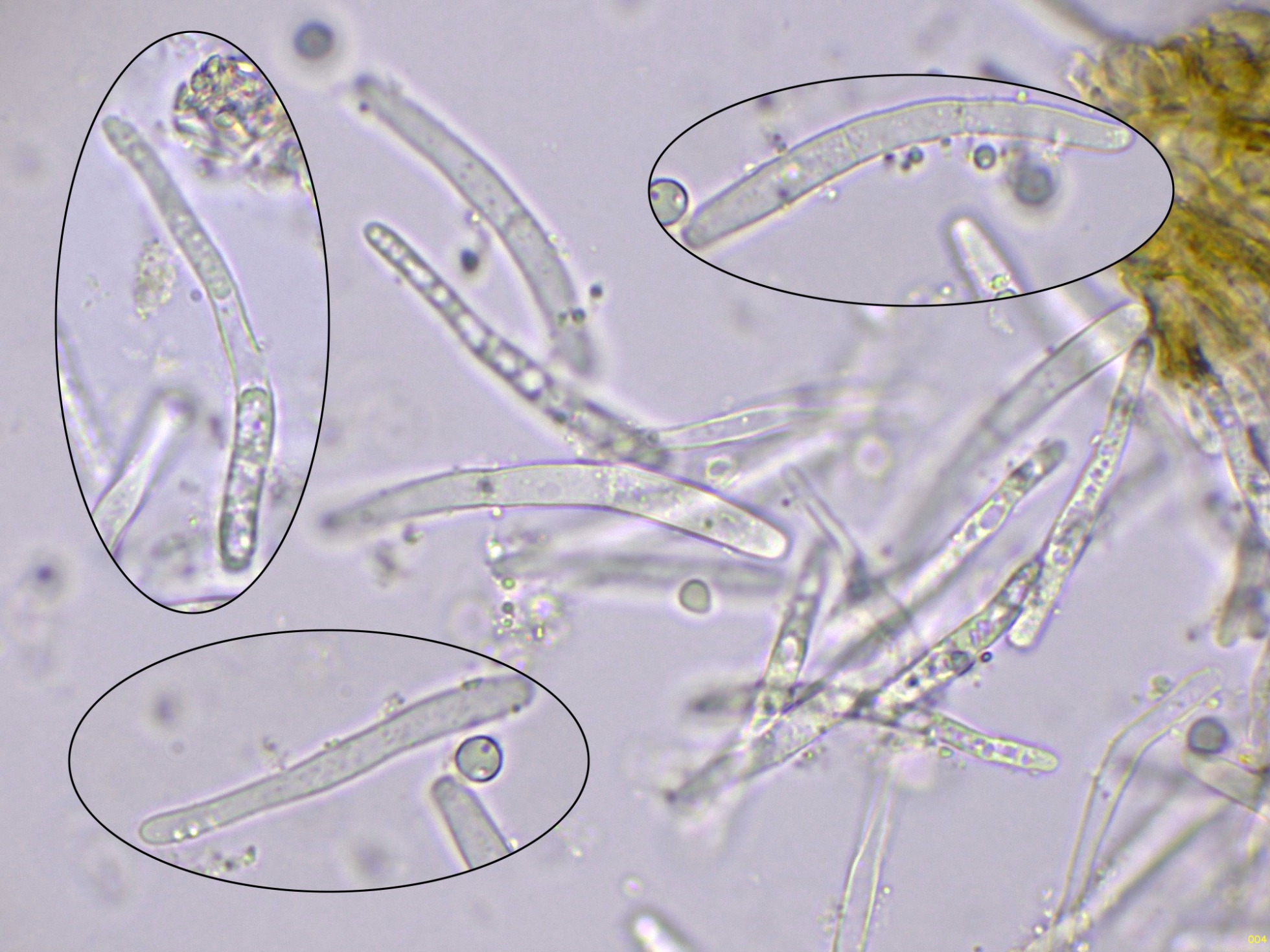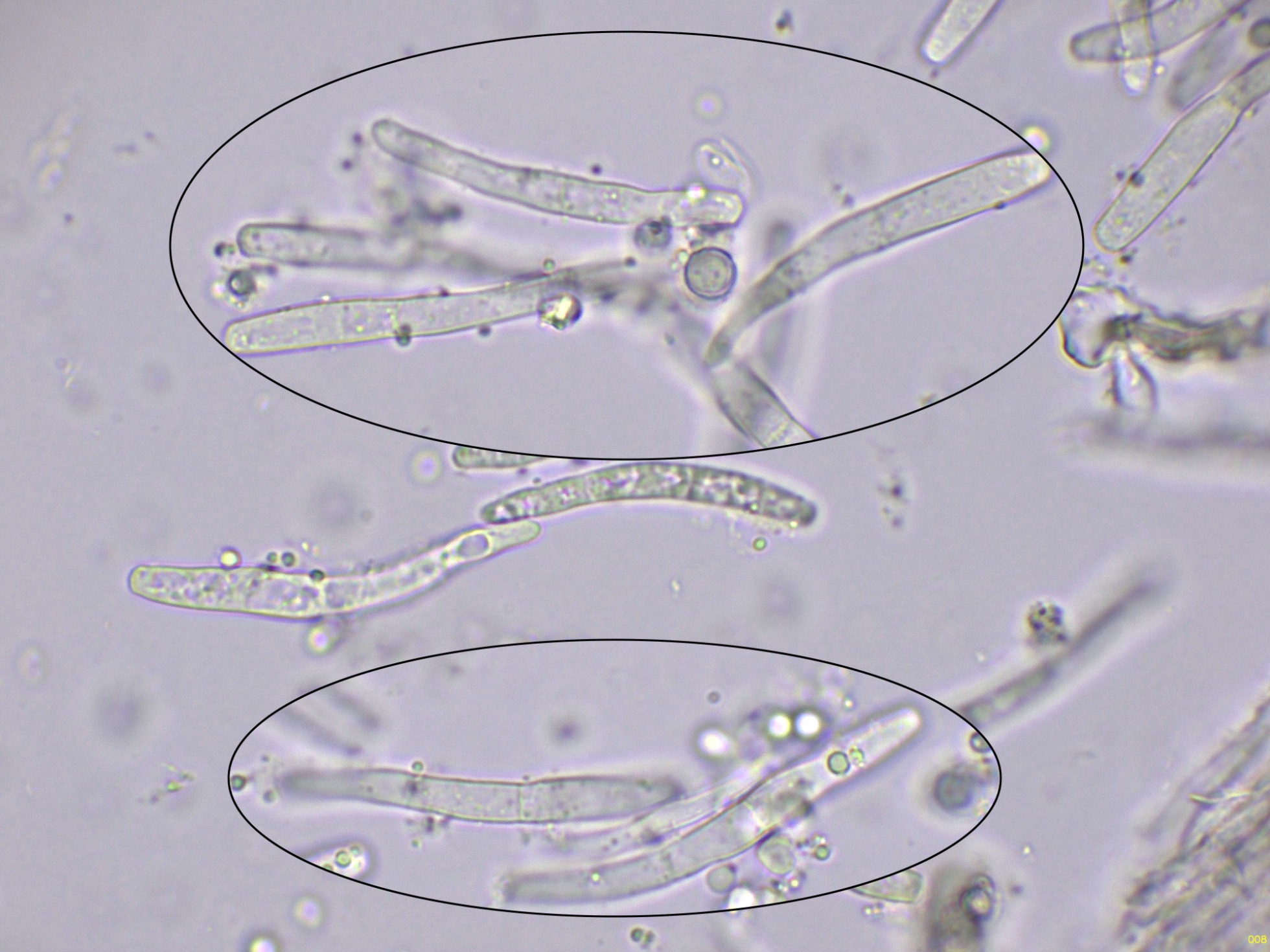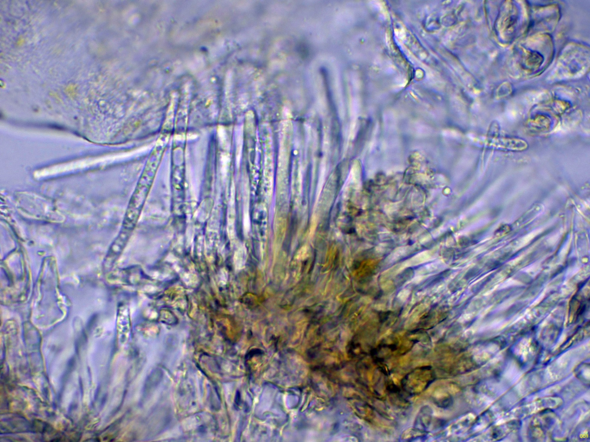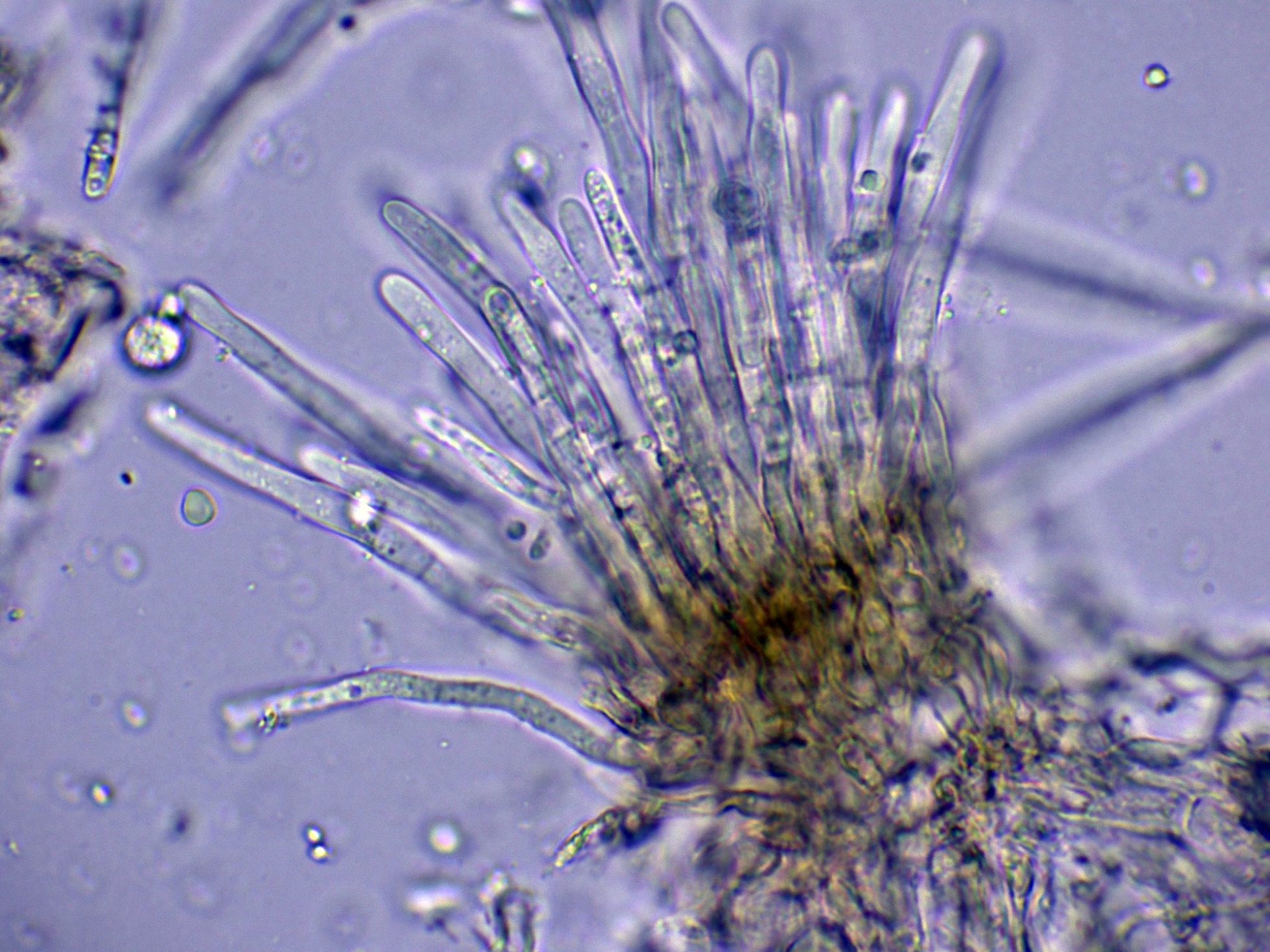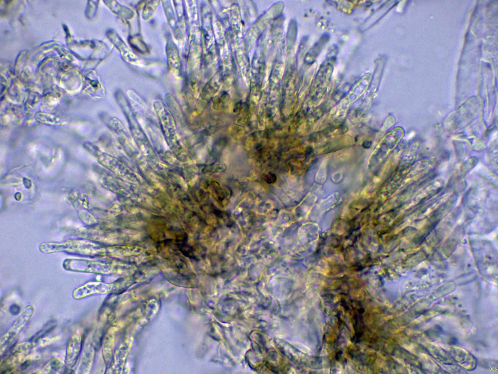 Unos diminutos picnidios brotando sobre unas hojas verdes, aún sujetas al árbol de Morus nigra (Morera negra).