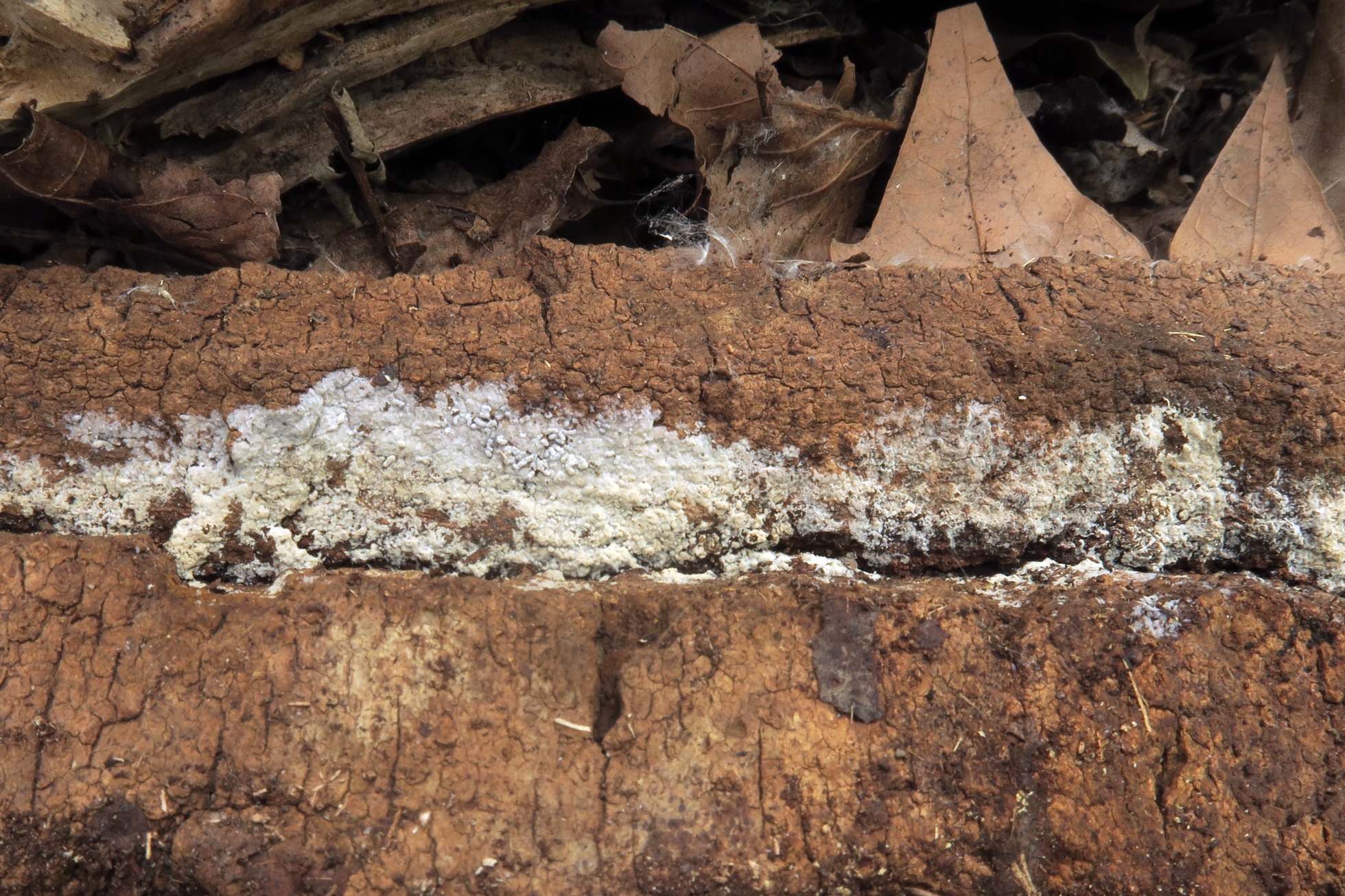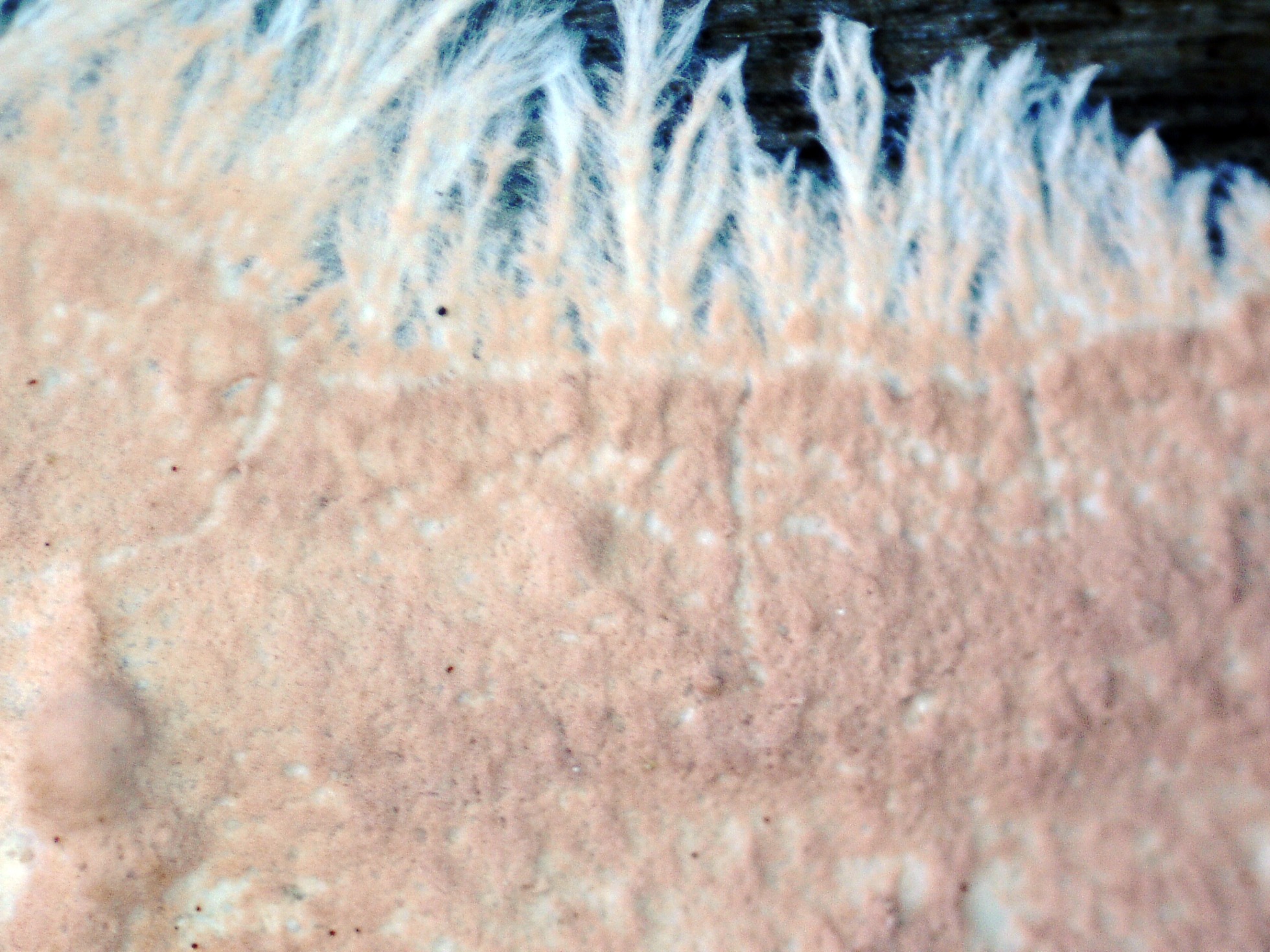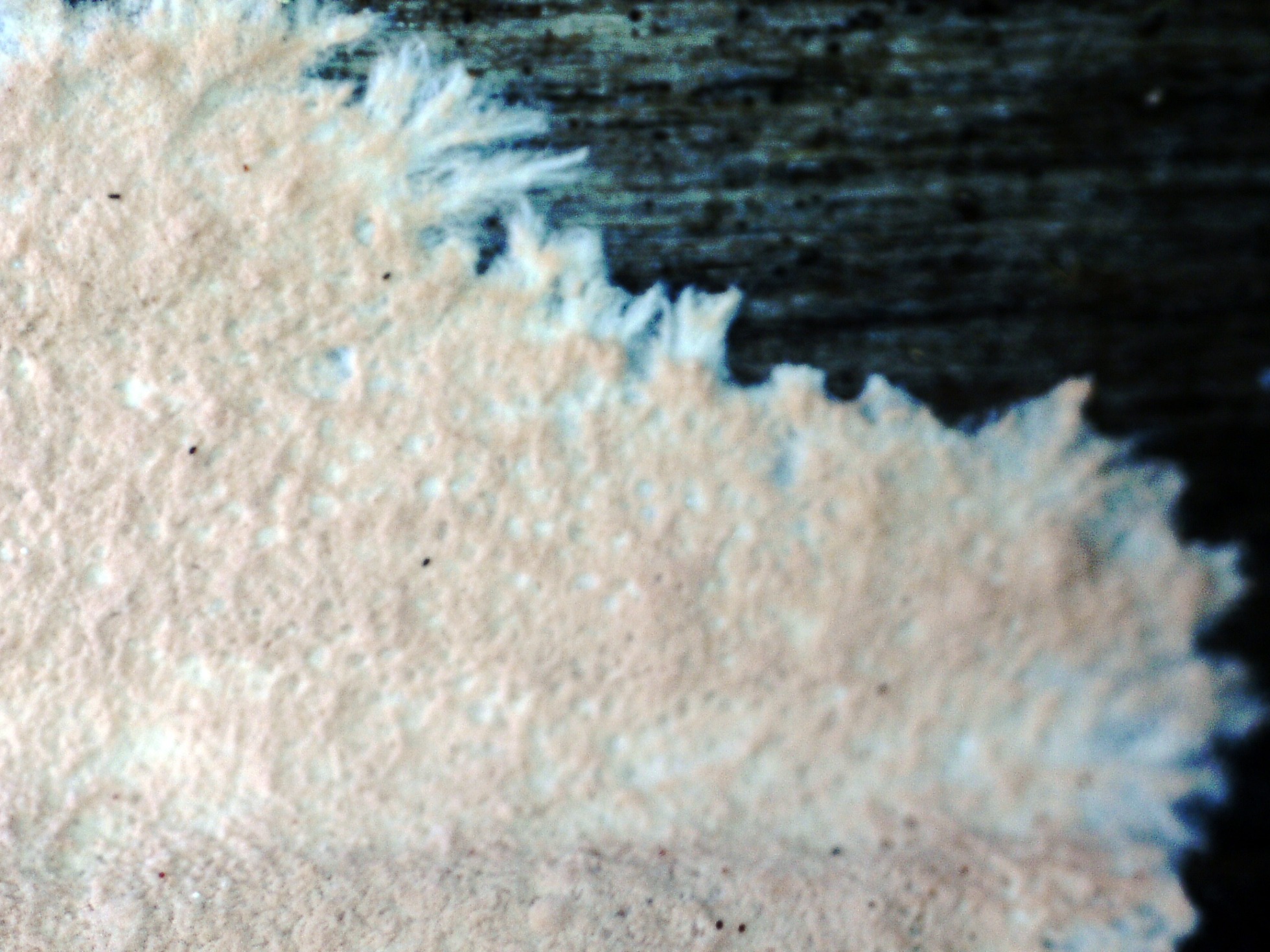 Un Corticial, que no me había encontrado hasta ahora y en un més me lo encuentro en dos ocasiones, en esta ocasión bajo Populus, el Corticium roseum: