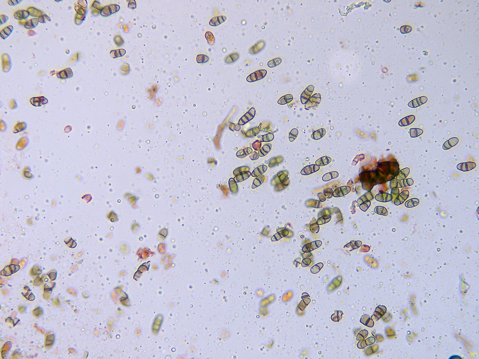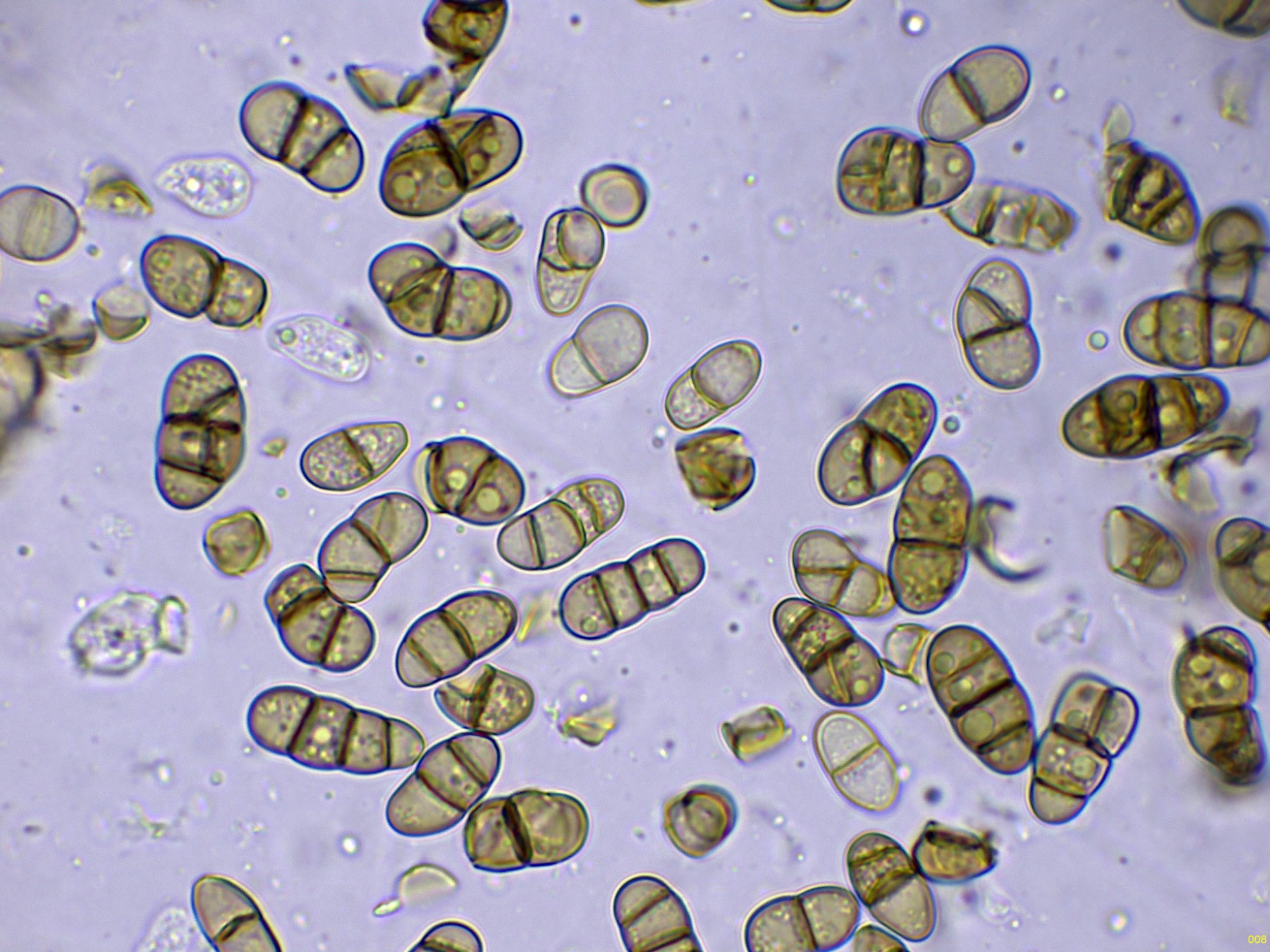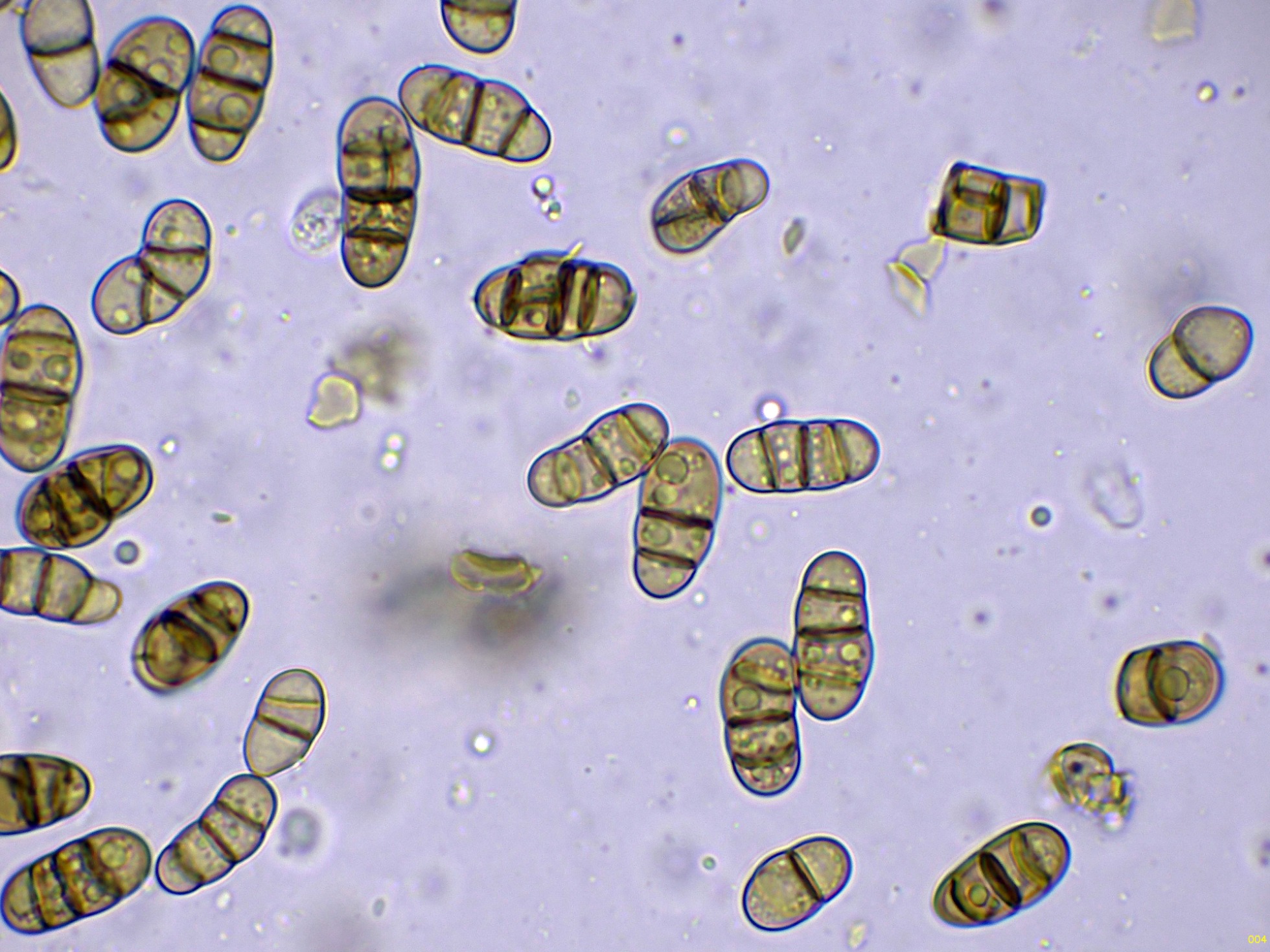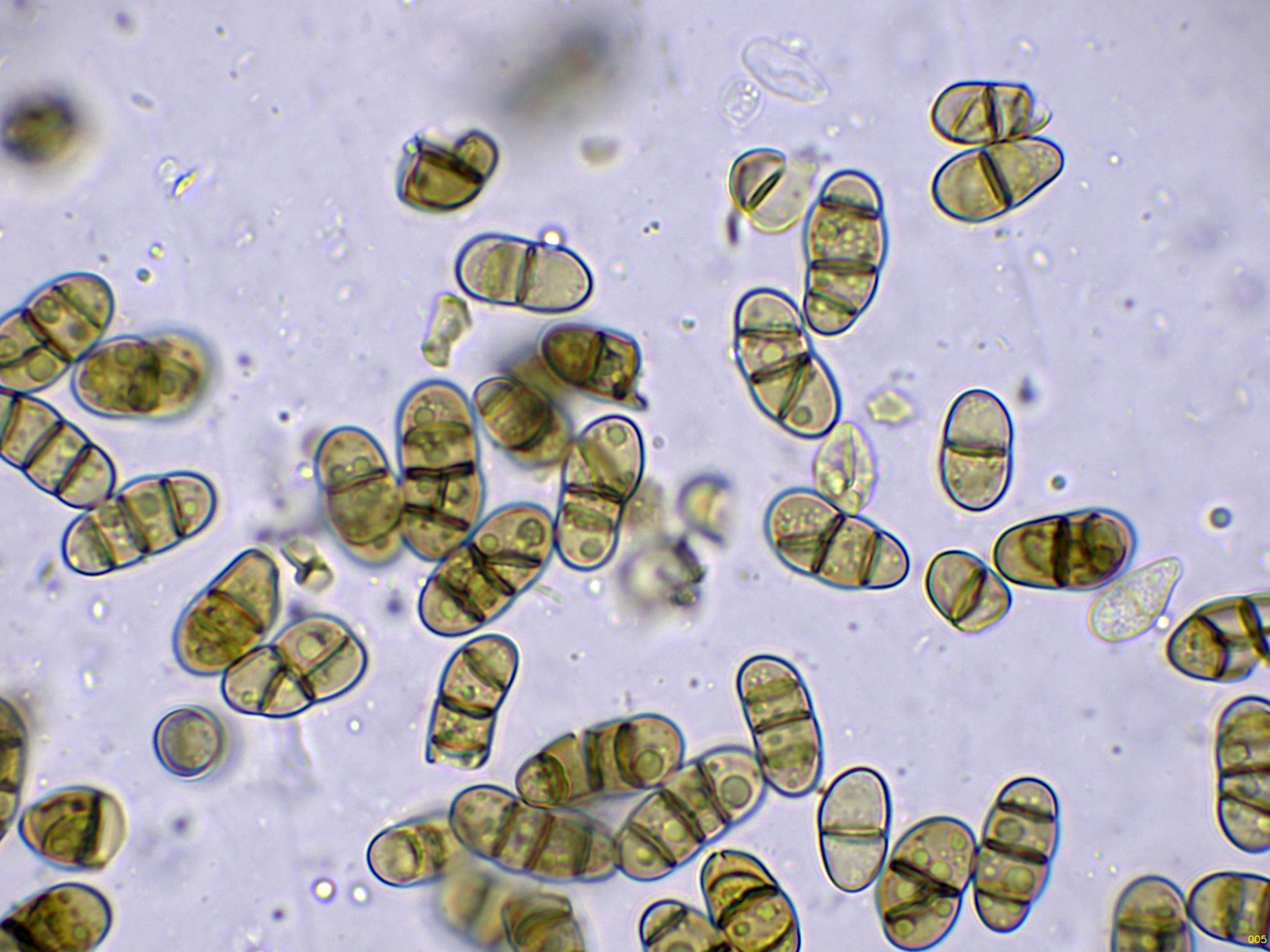 Conidios cilíndricos, con los extremos redondeados, mayoritariamente con tres septos, con constreñimiento en los mismos, con pigmento intracelular pardo y con abundantes gotas lípidas en su interior, con unas medidas en agua de: