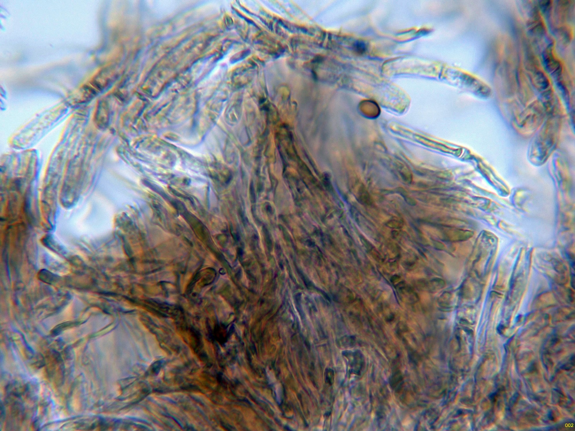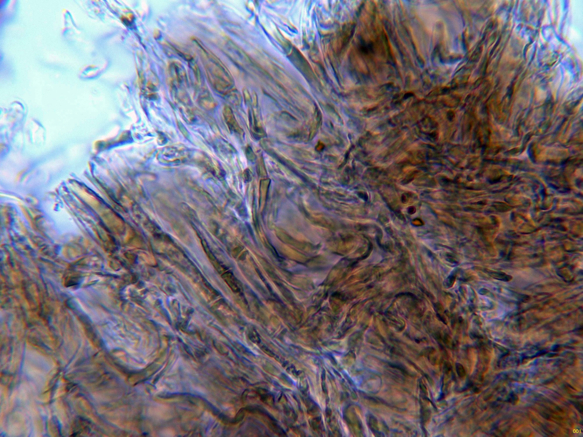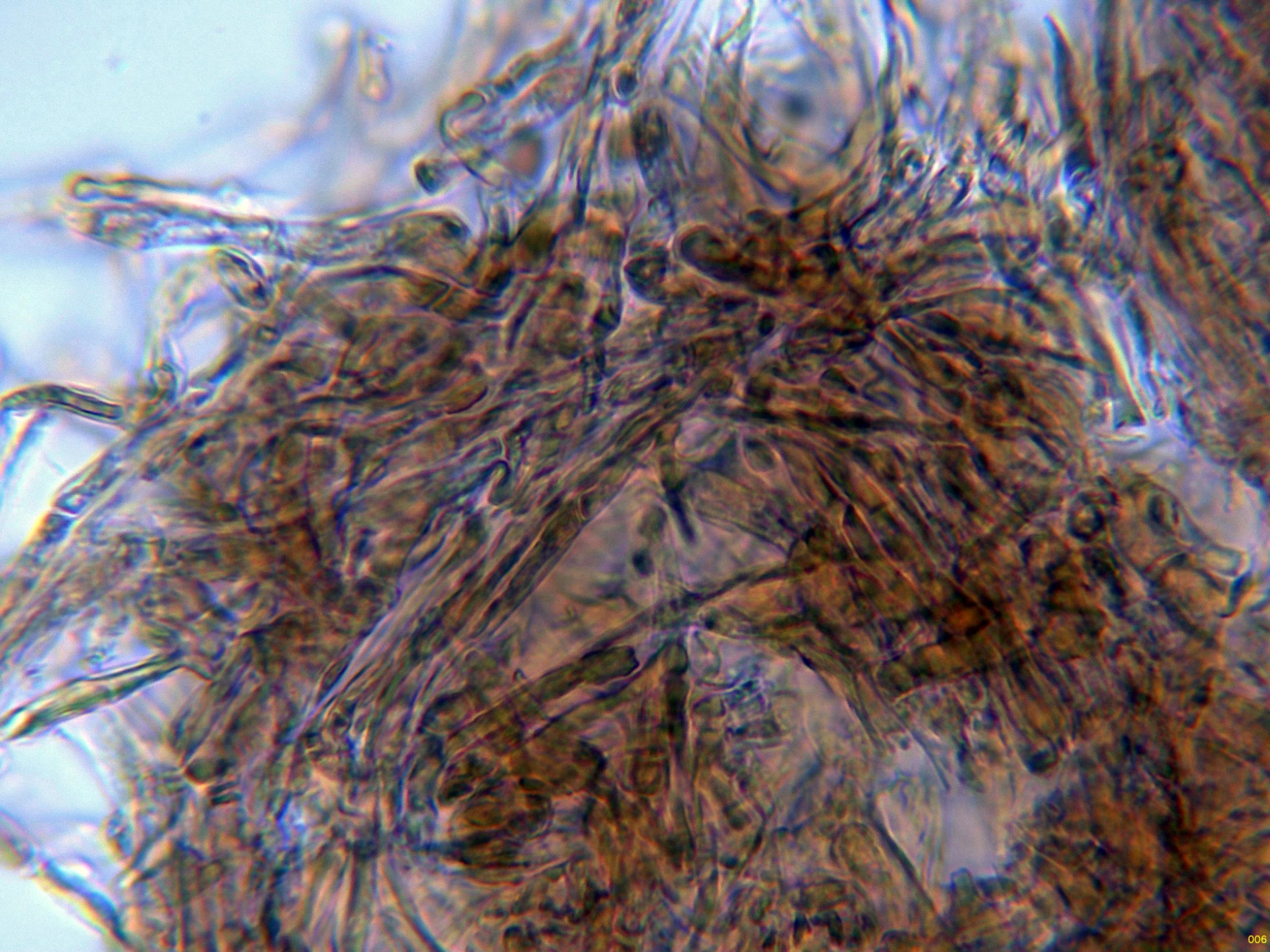 Las hifas de la suprapellis en agua, fuertemente pigmentadas, y al igual que el resto de Agaricus, sin fíbulas: