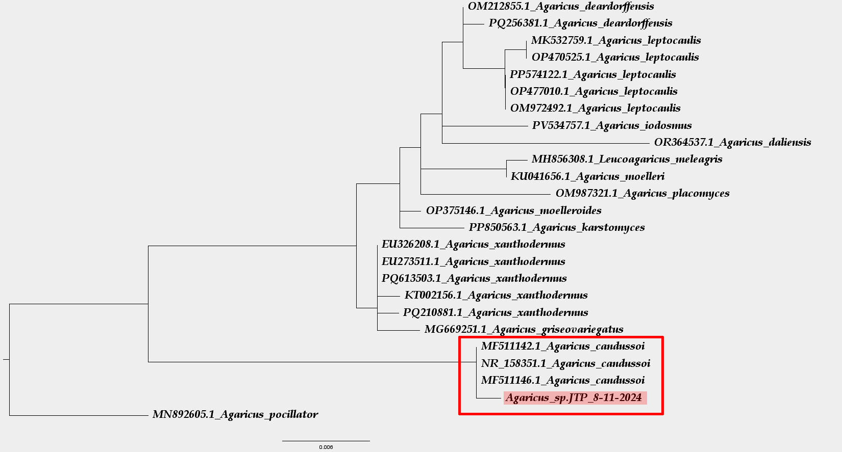 Mi especie (el Agaricus sp. JTP 8-11-2024), aunque se encuentra dentro del Clado de lo que se puede considerar como Agaricus candussoi, si que muestra en la rama una cierta pequeña diferencia con las tres secuencias del Agaricus candussoi, que he utilizado para confeccionar el árbol, en estos casos y en opinión de Luís Alberto Parra (el autor que dio de alta la especie), para poder concretar algo ya resulta imprescindible el probar con otros genes como el tef1 o el rbp2, en este caso no voy a gastar más dinero con la especie, aunque admito que si no se trata del Agaricus candussoi propuesto ya se trataría de una nueva especie aún no descrita, eso sí muy cercana molecularmente al Agaricus candussoi.