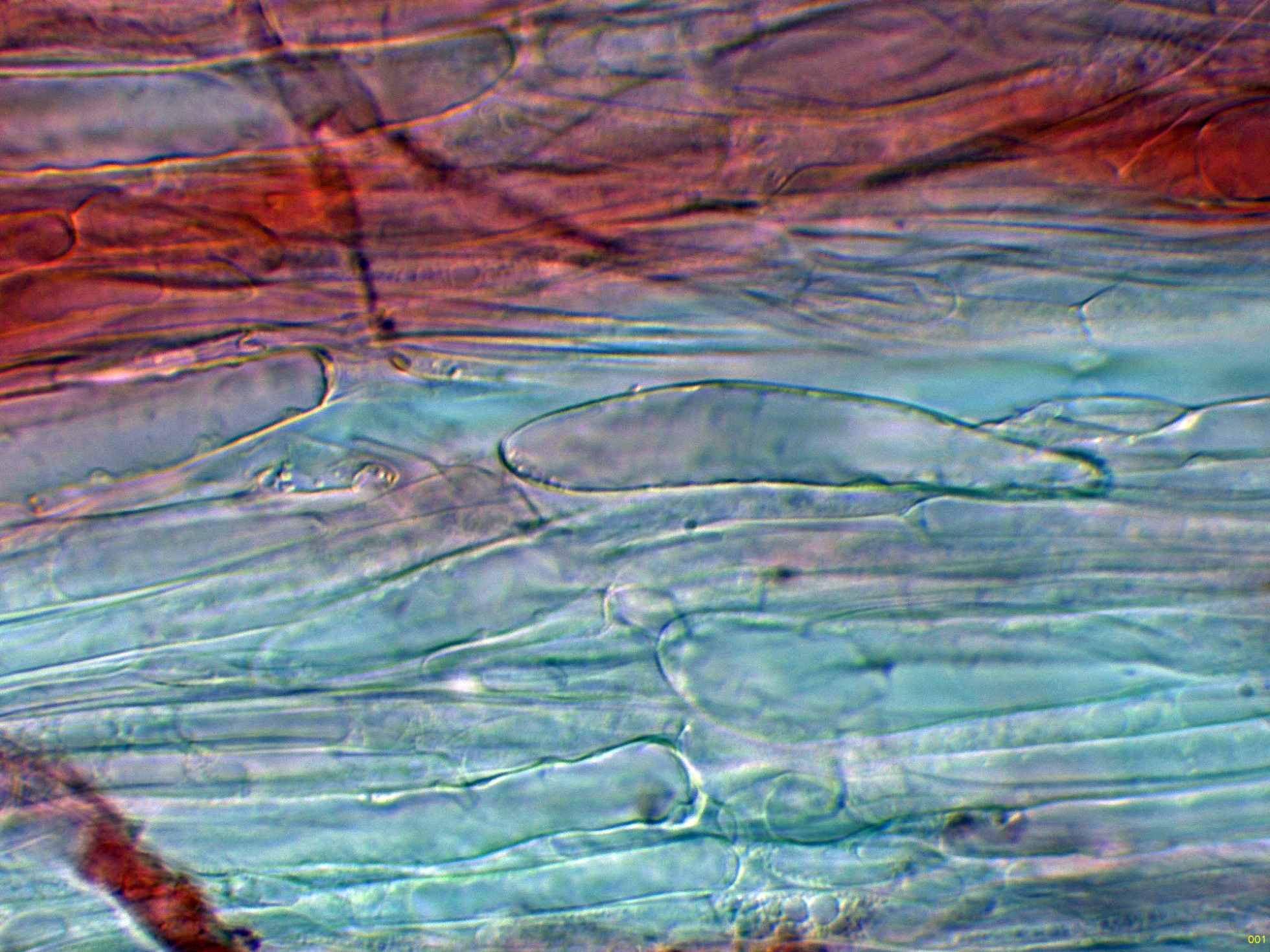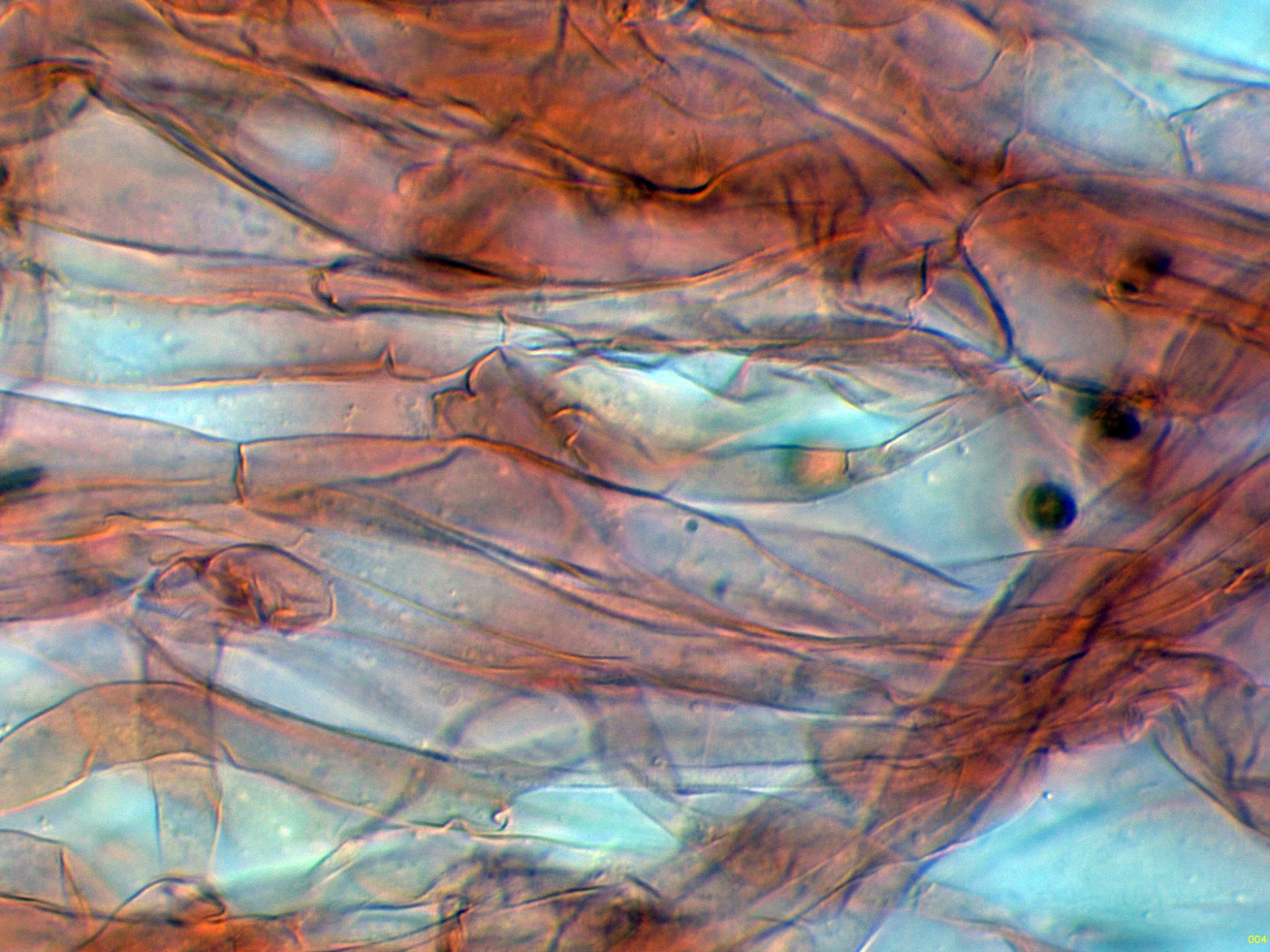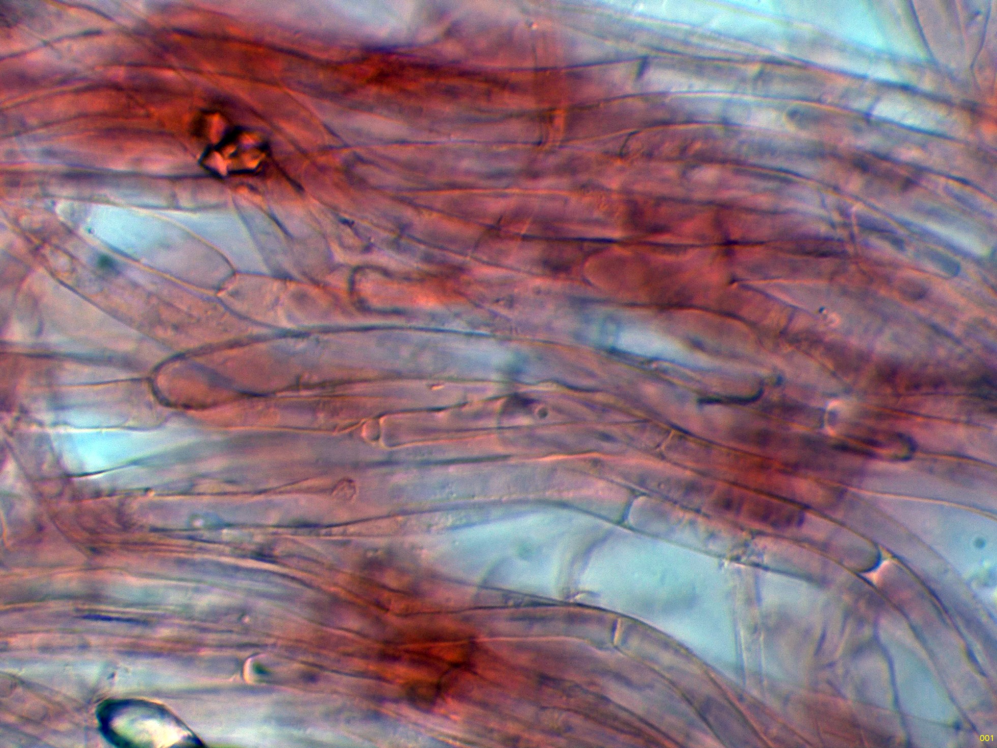 Hifas de la estipitipellis en solución de Rojo Congo, sin caulocistidios observados: