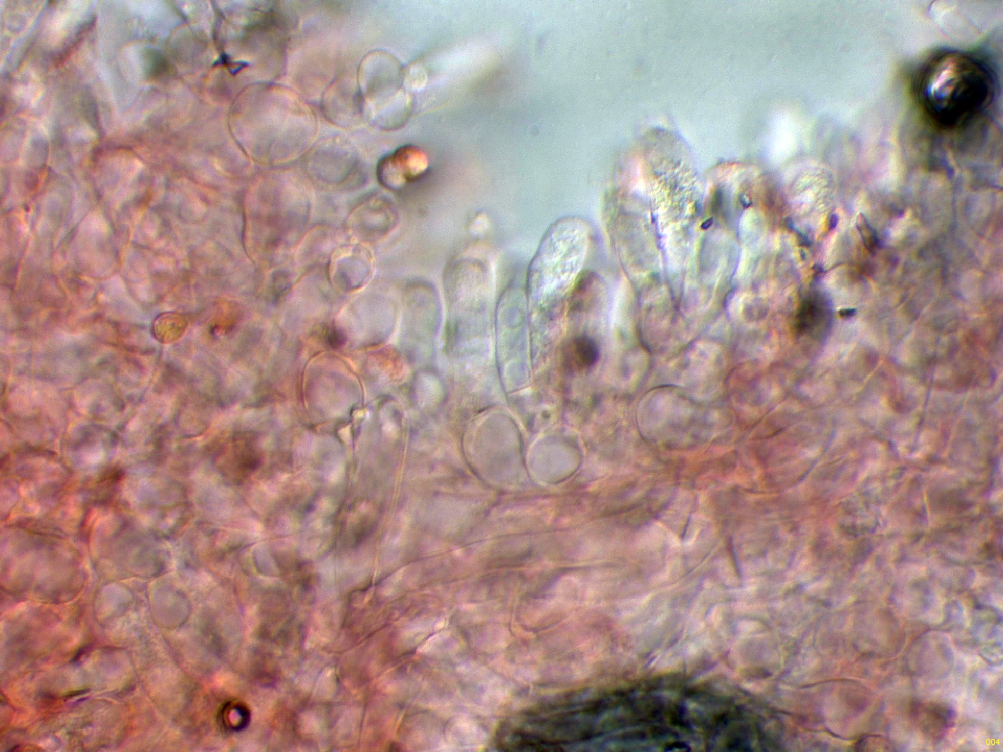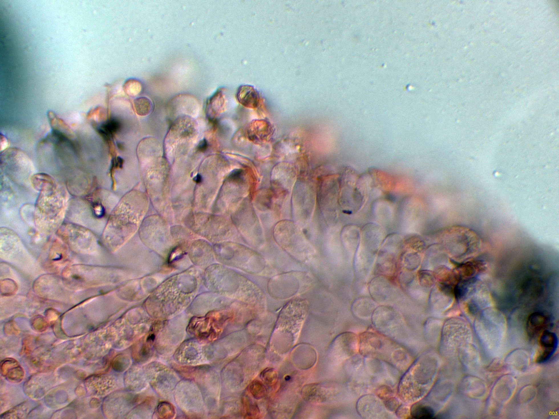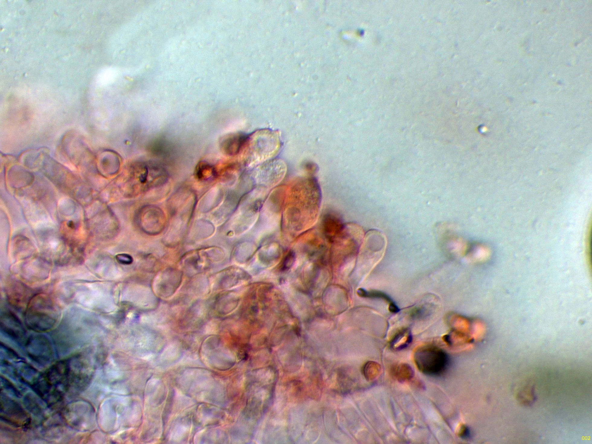 Hifas de la estipitipellis en solución de Rojo Congo, sin caulocistidios observados: