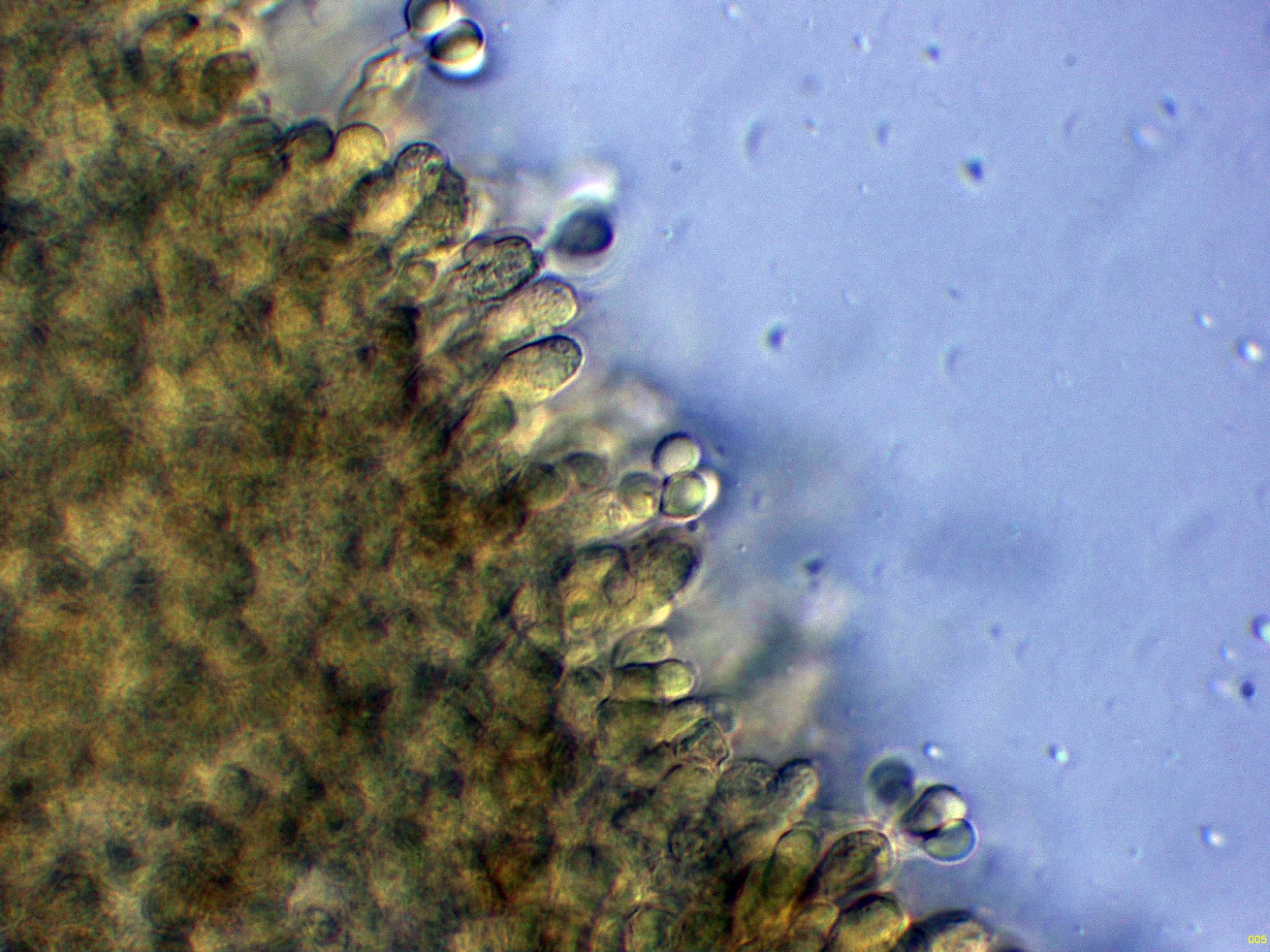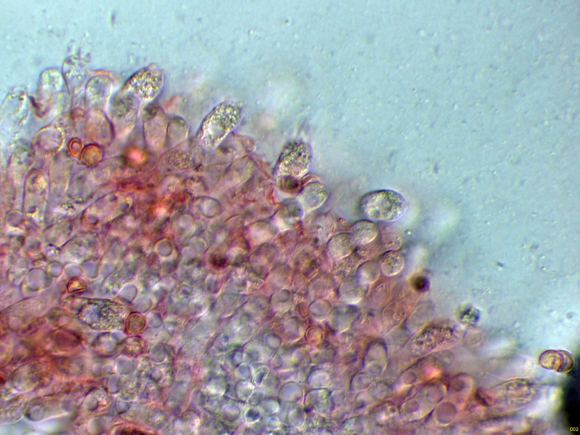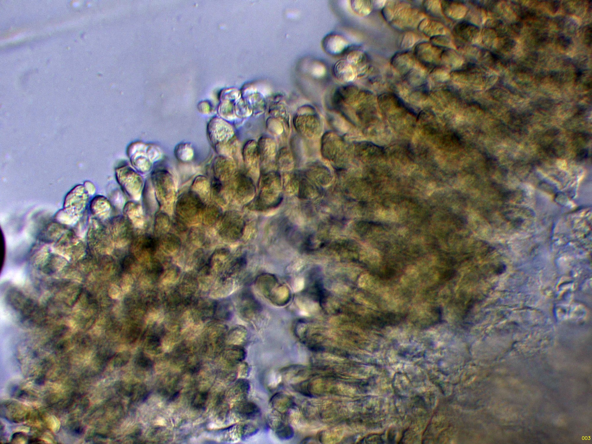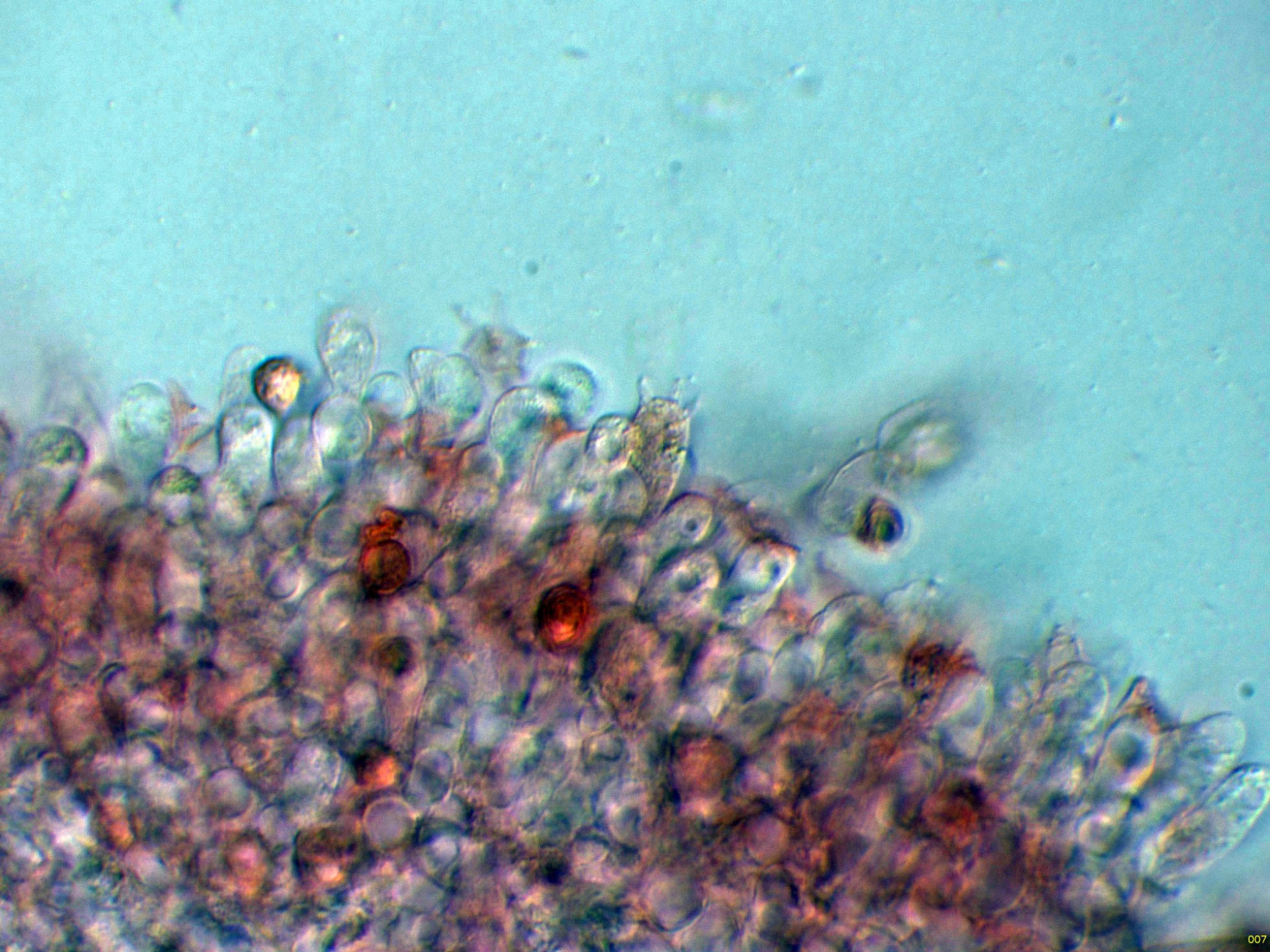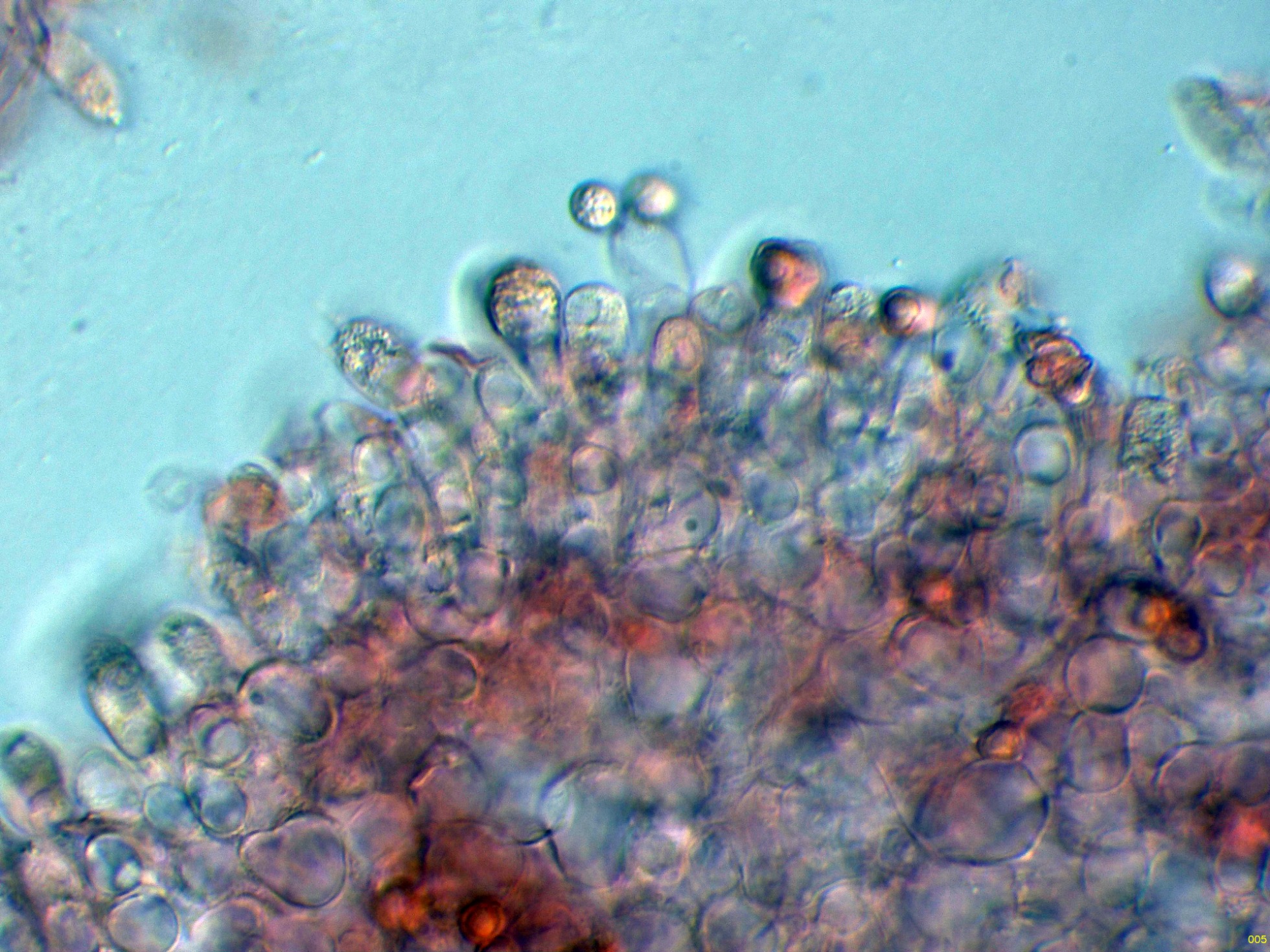 Las esporas en Reactivo de Melzer, con un comportamiento dextrinoide: