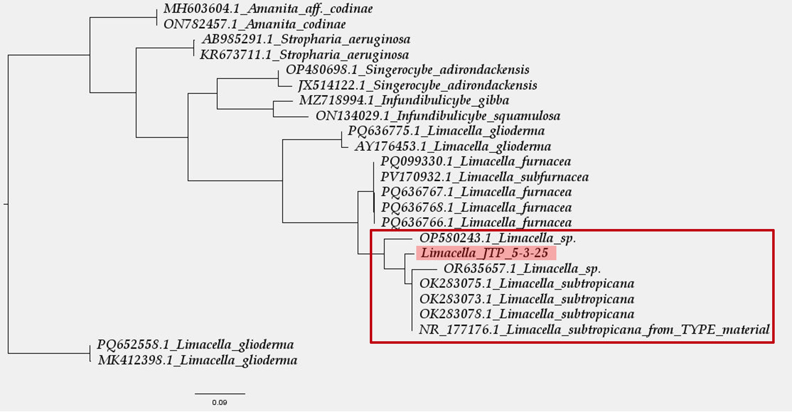 En el árbol mi especie la "Limacella_JTP_5-3-25", aunque bien alineada dentro del Clado de lo que se podría considerar como Limacella subtropicana, se encuentra un poco alejada de la secuencia del material tipo, y compartiendo espacio con un par de Limacellas sp., de ahí que haya preferido archivar el tema como lo más parecido, es decir Limacella aff. subtropicana.