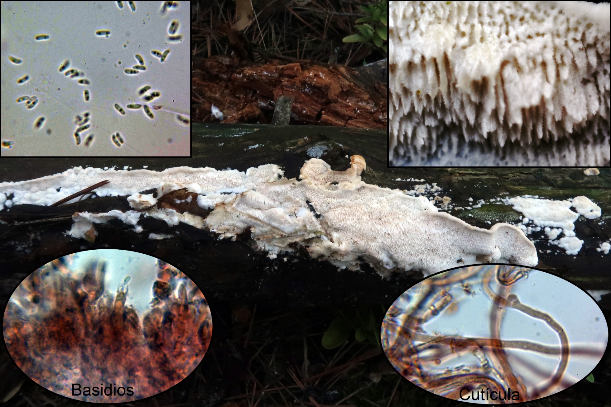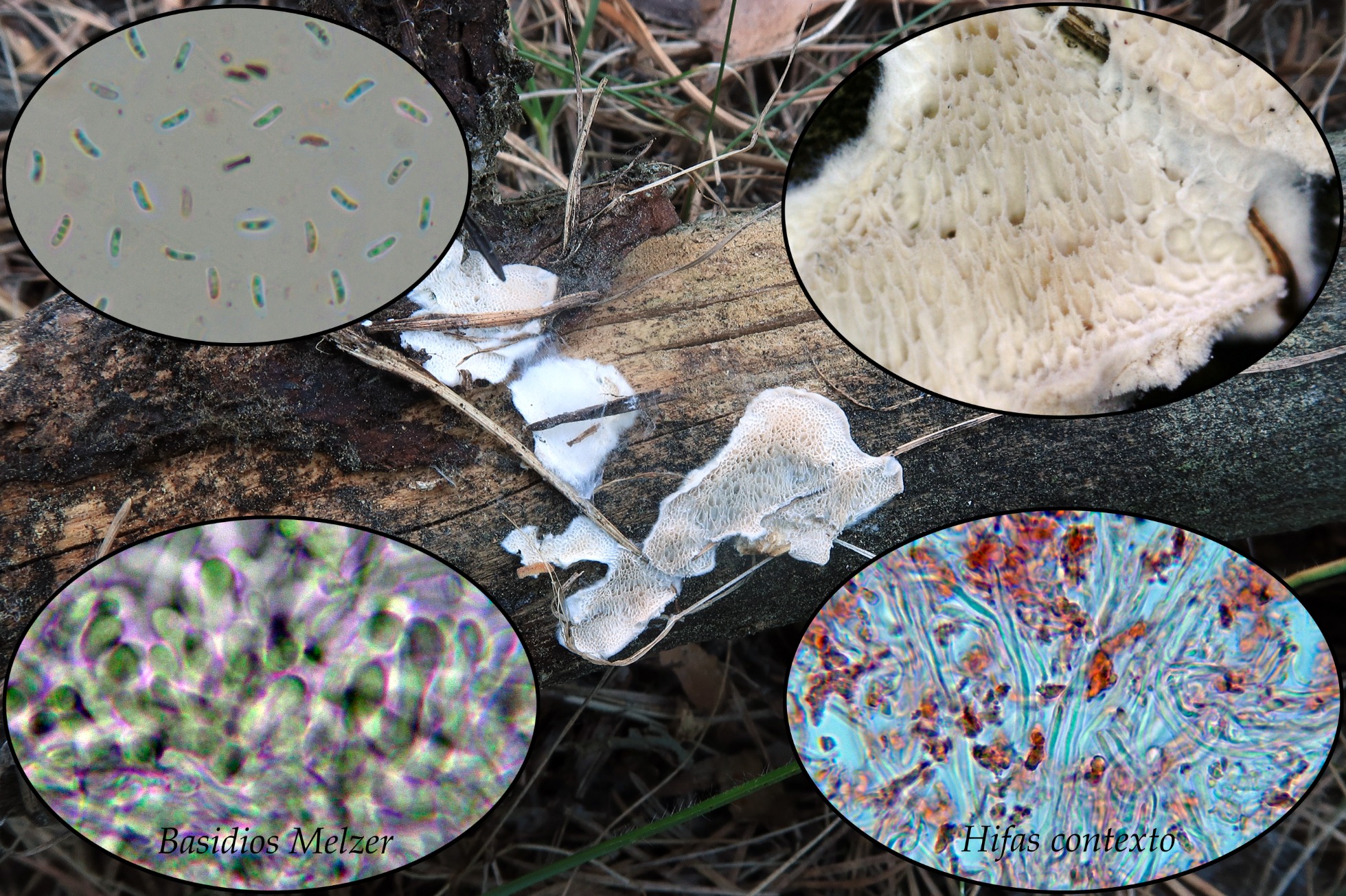 Para poder comparar, añado unas imágenes correspondientes a 4 estudios míos anteriores realizados a lo que en su momento y atendiendo al criterio de Ryvarden, consideré como Antrodia sinuosa, todas recolectadas sobre madera de pino.