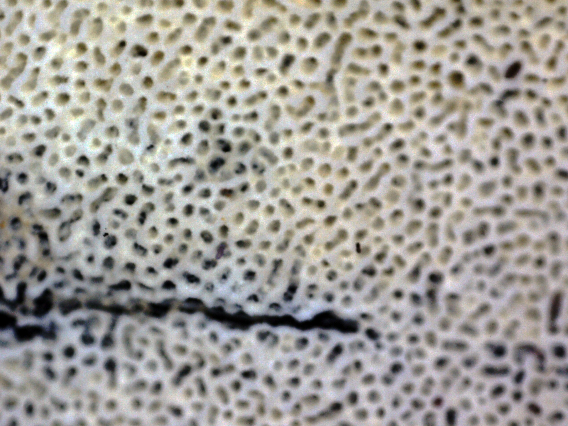 Superficie poroide a 20 aumentos, con 4 a 5 poros por mm., con poros de pared gruesa, con el borde liso, no dentado.