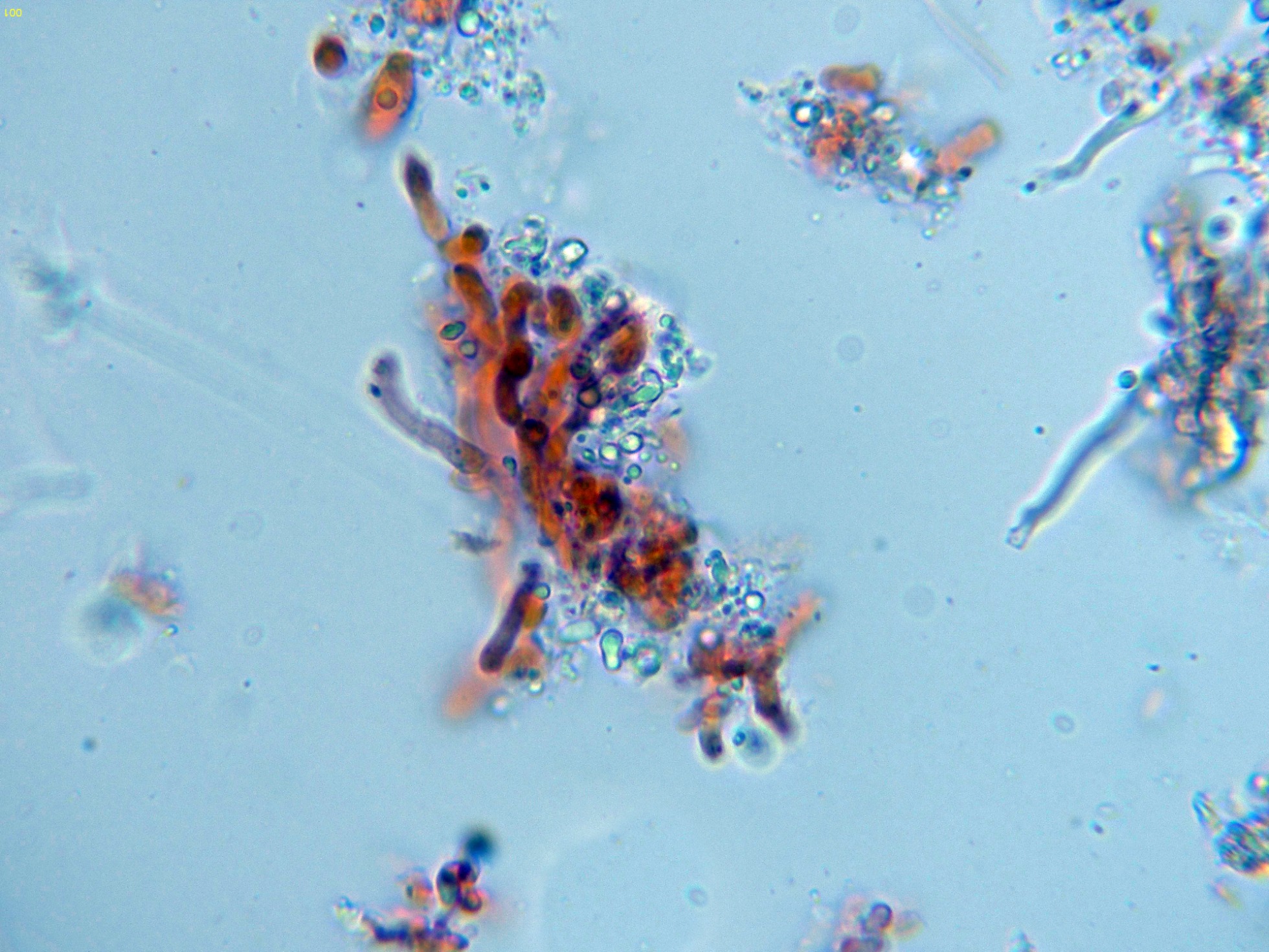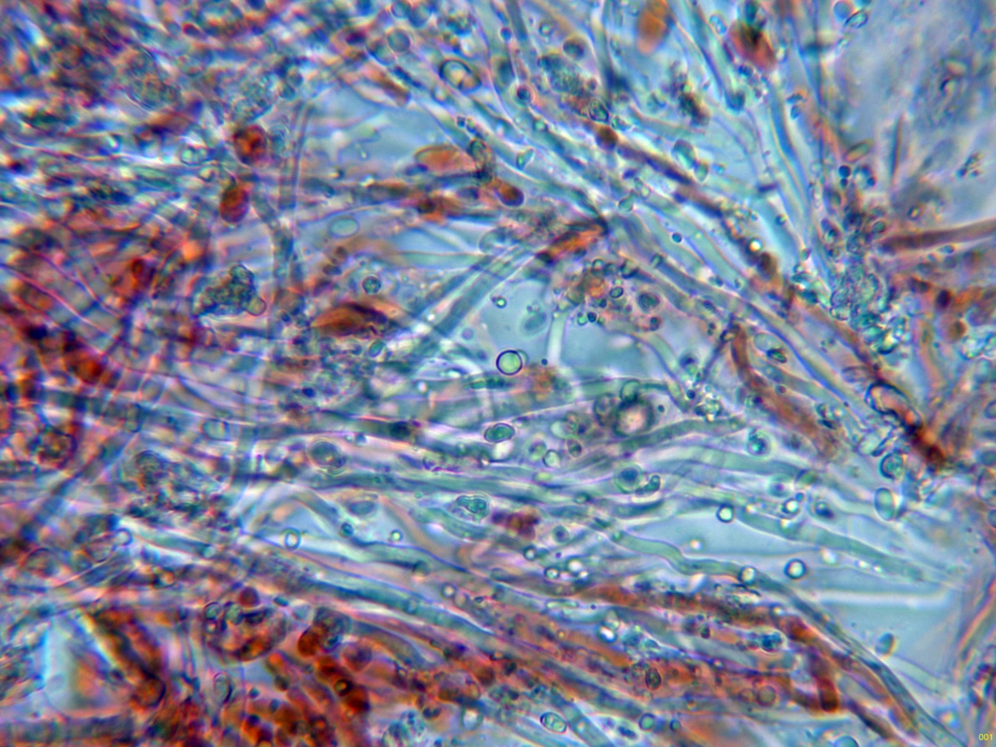 En este estudio los basidiomas ya estaban bastante resecos y soltaron pocas esporas por medio de la esporulación natural, añado una imágen: