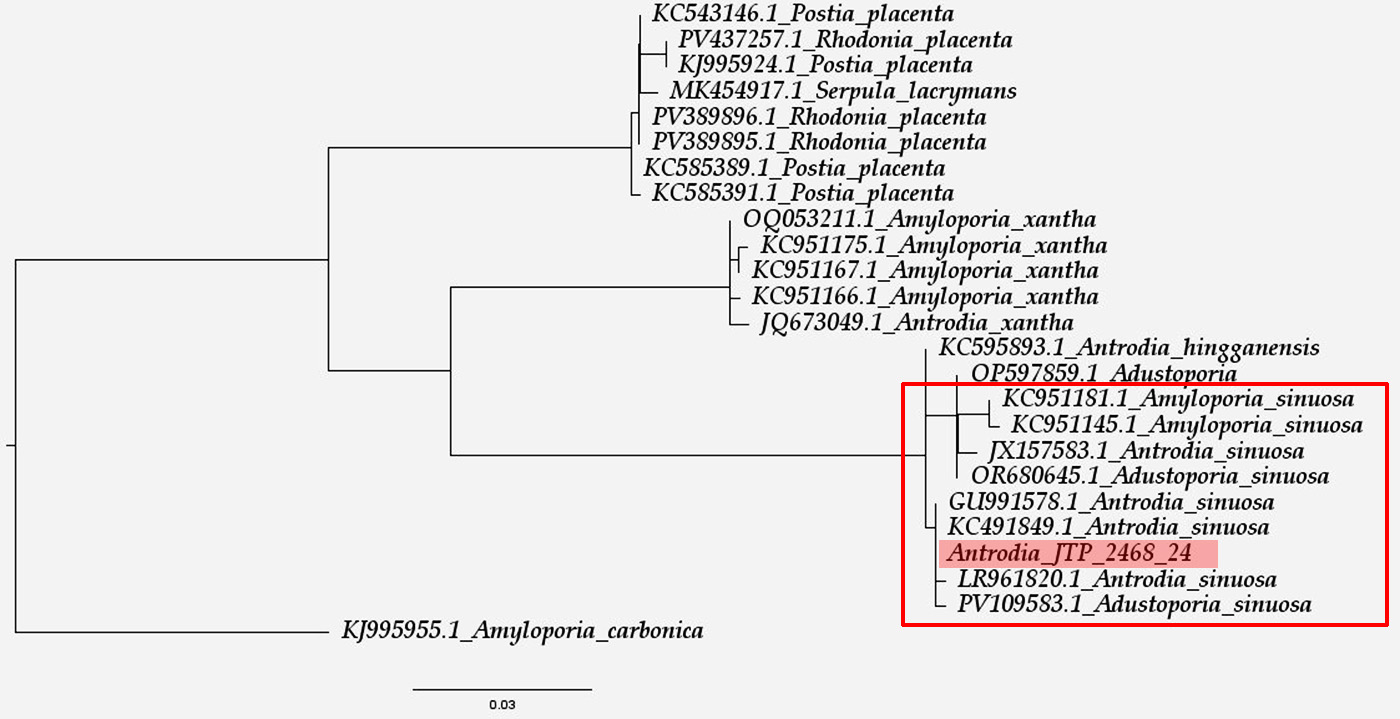 Aquí mi especie la "Antrodia JTP 2468/24", se encuentra perfectamente alineada dentro del Clado de lo que podemos considerar como Antrodia sinuosa = Amyloporia sinuosa = Adustoporia sinuosa.