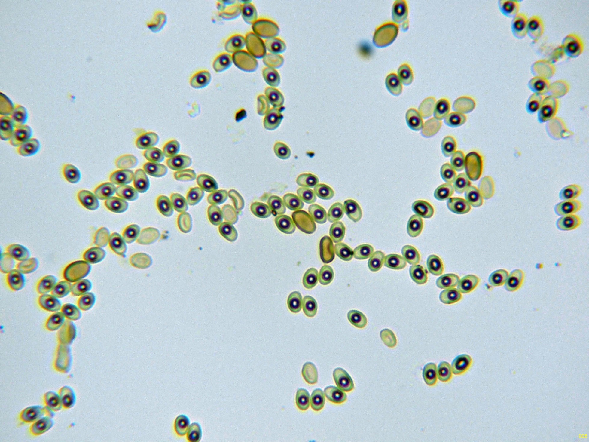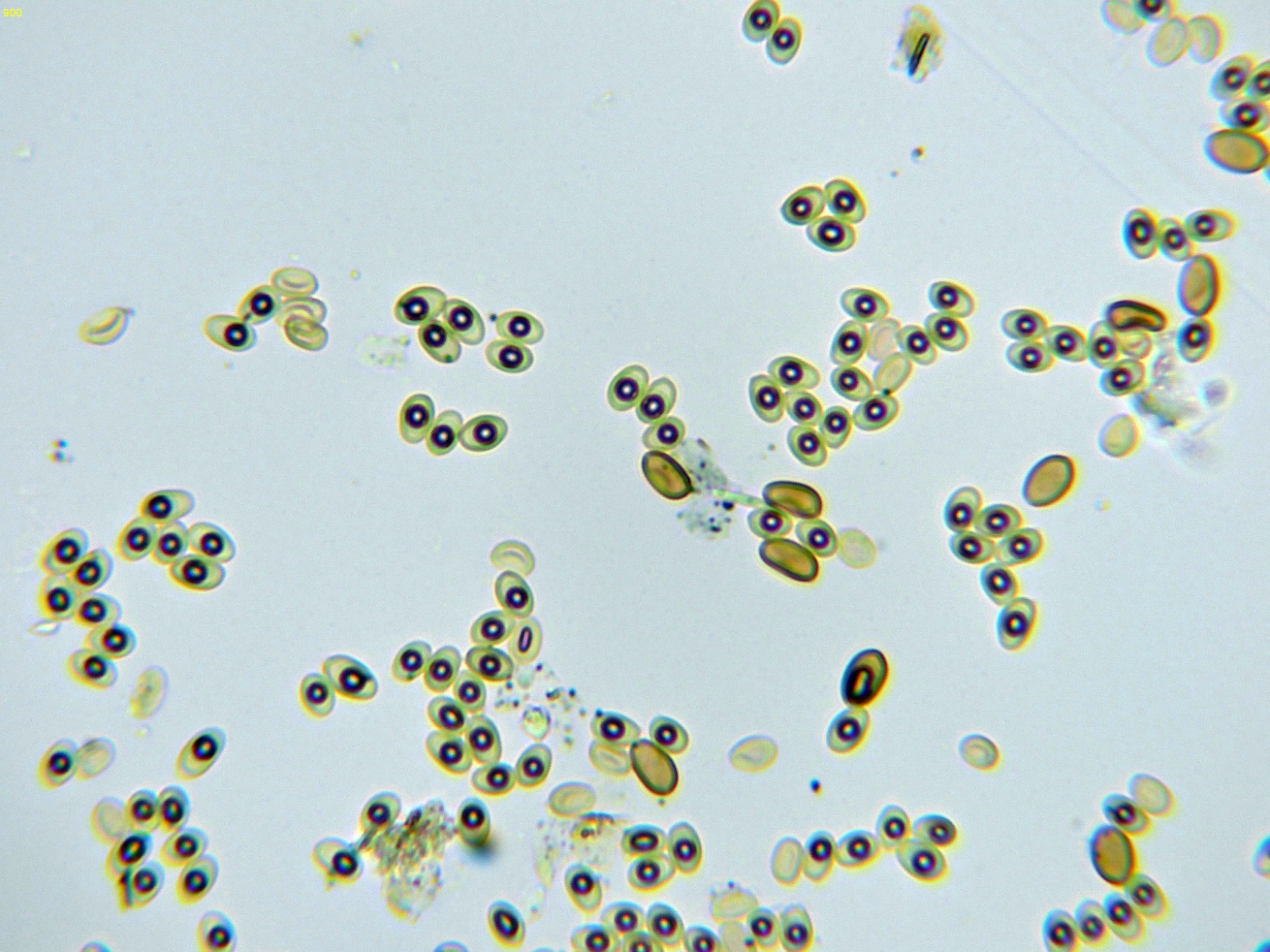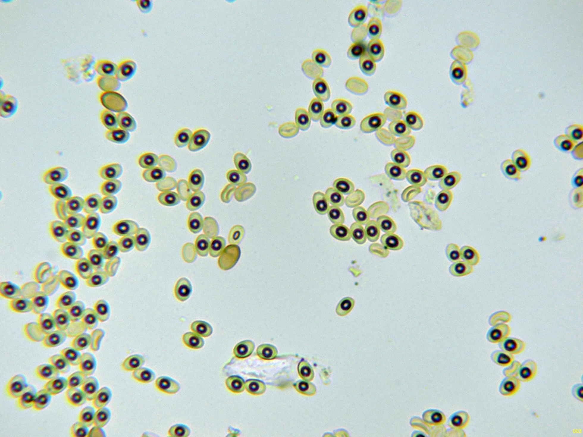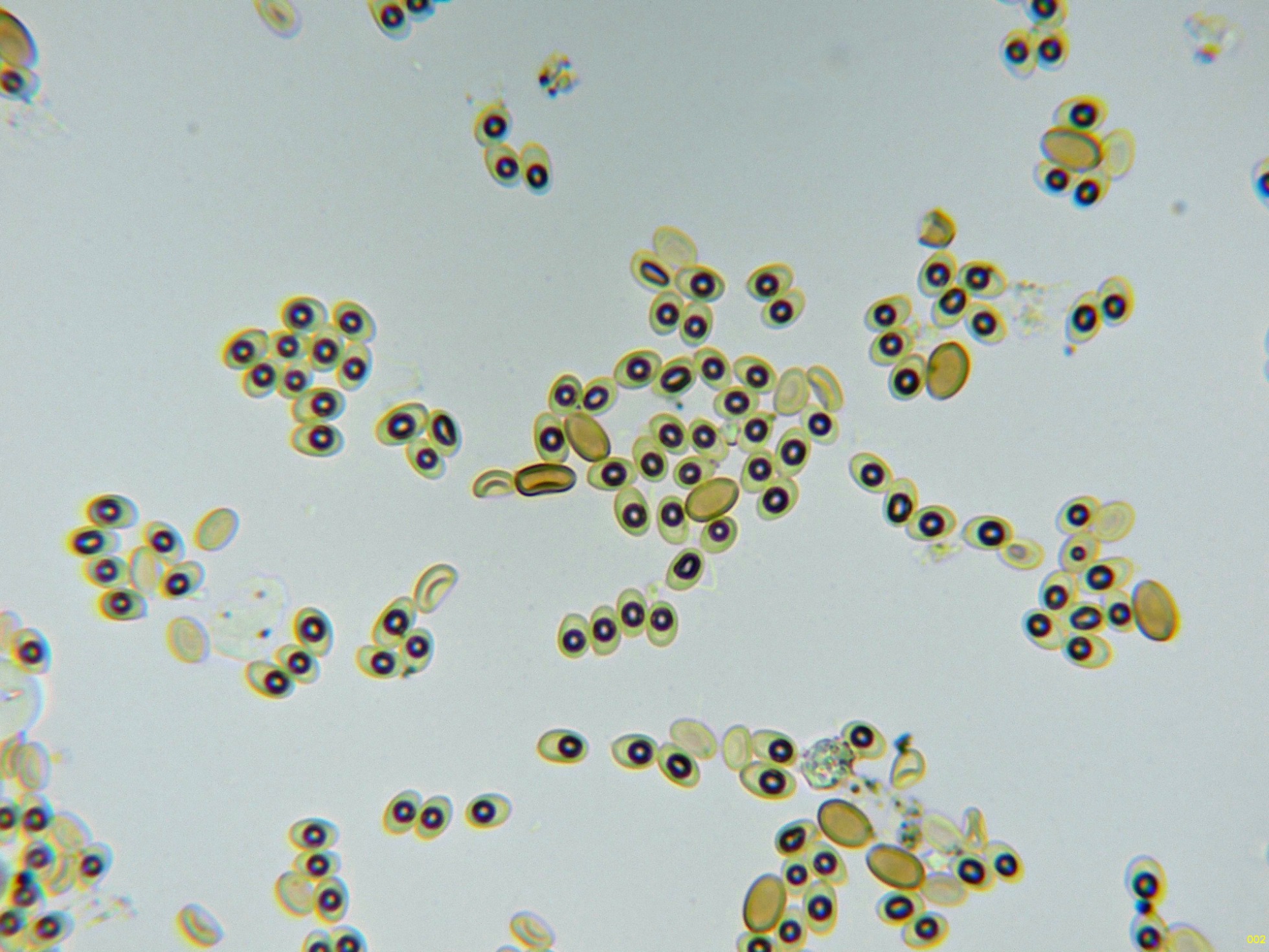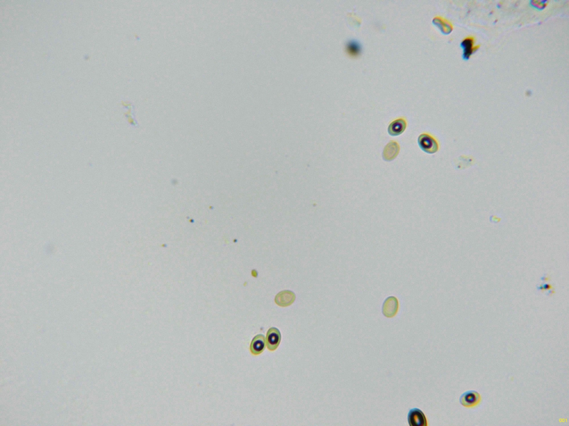 En las imágenes se pueden observar dos clases de esporas distintas, por un lado unas esporas muy numerosas, entre ovoides y elipsoides, de pared fina, con una gran gota lípida en su interior y con unas medidas en agua de: