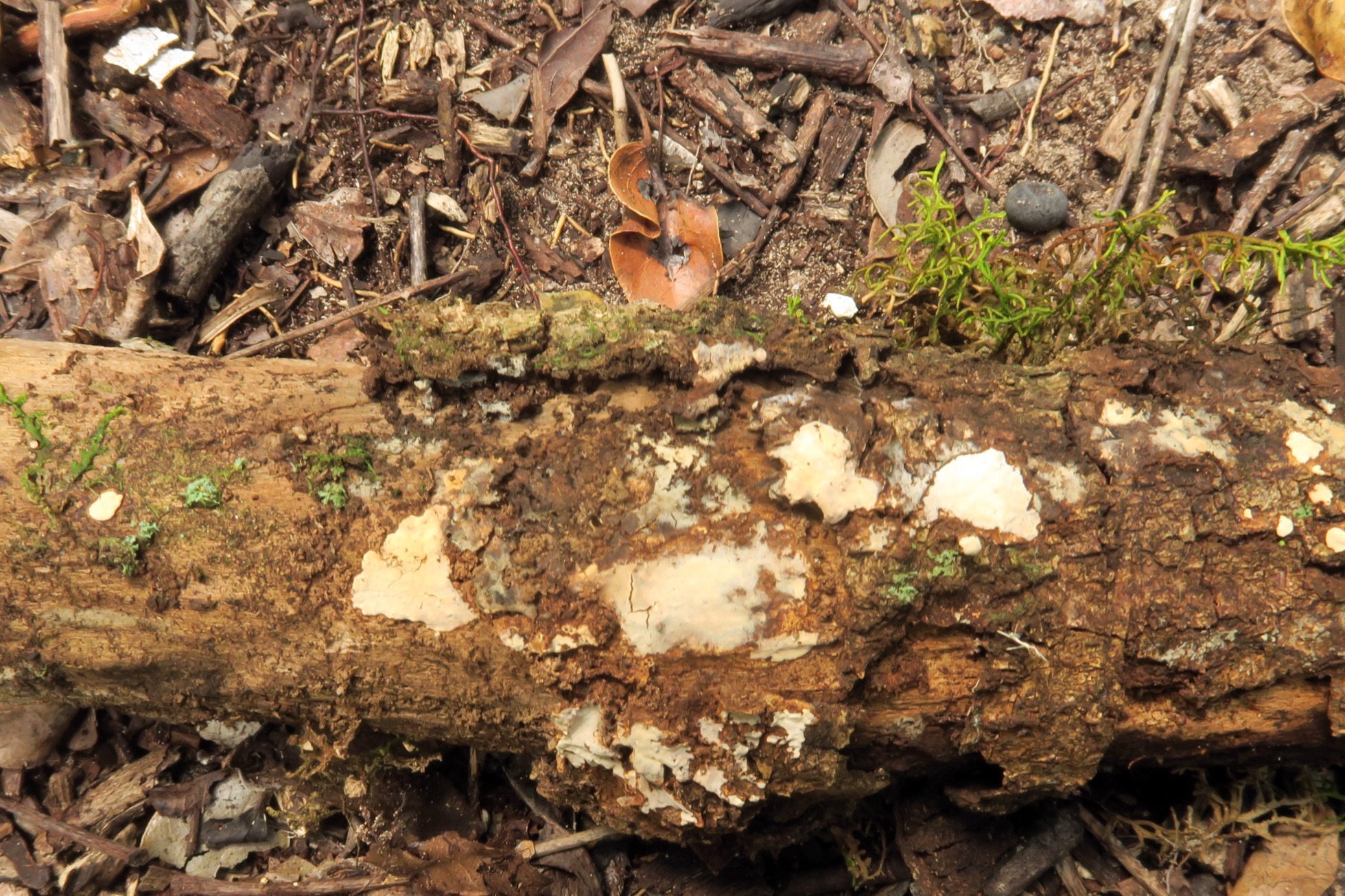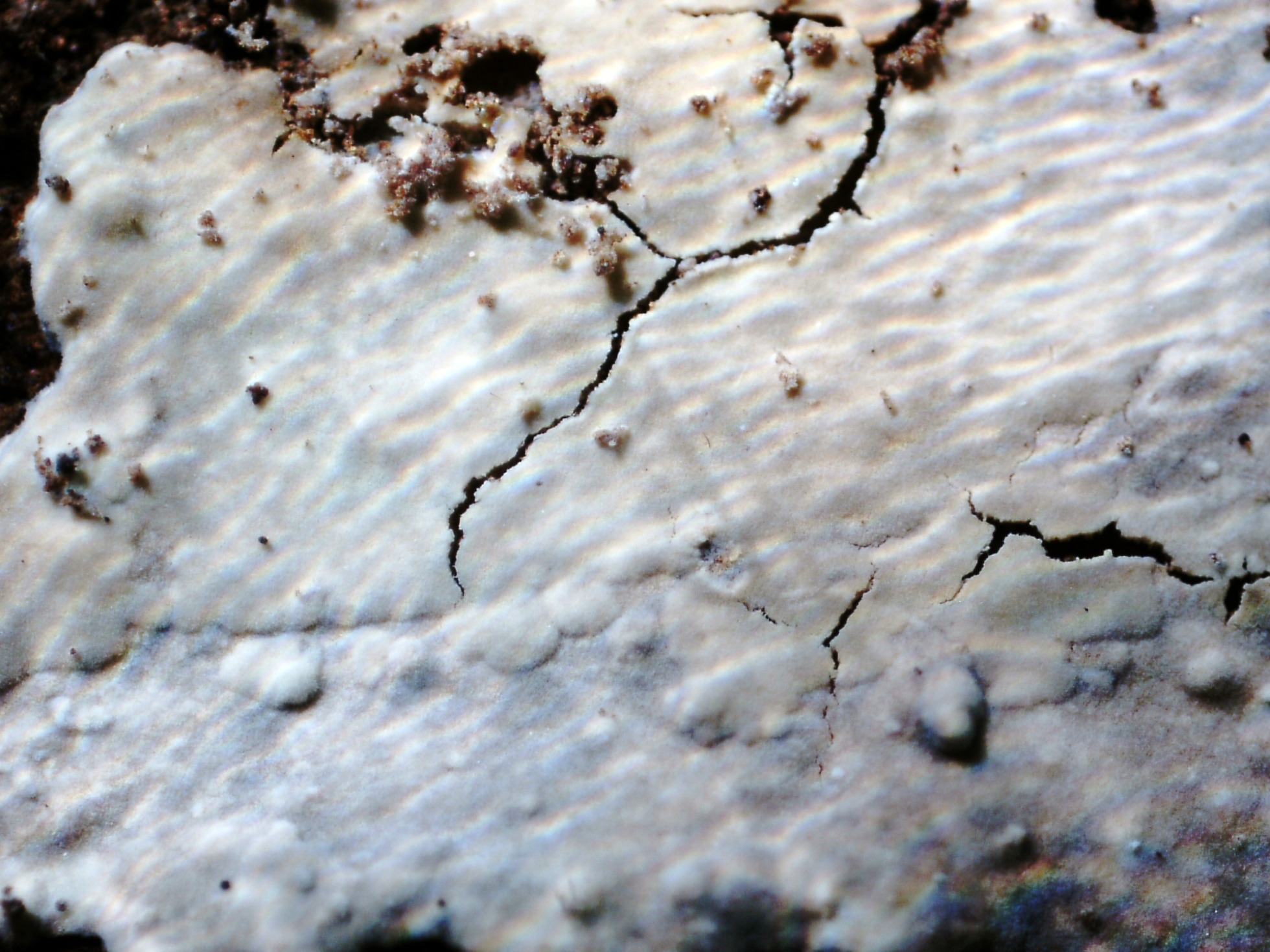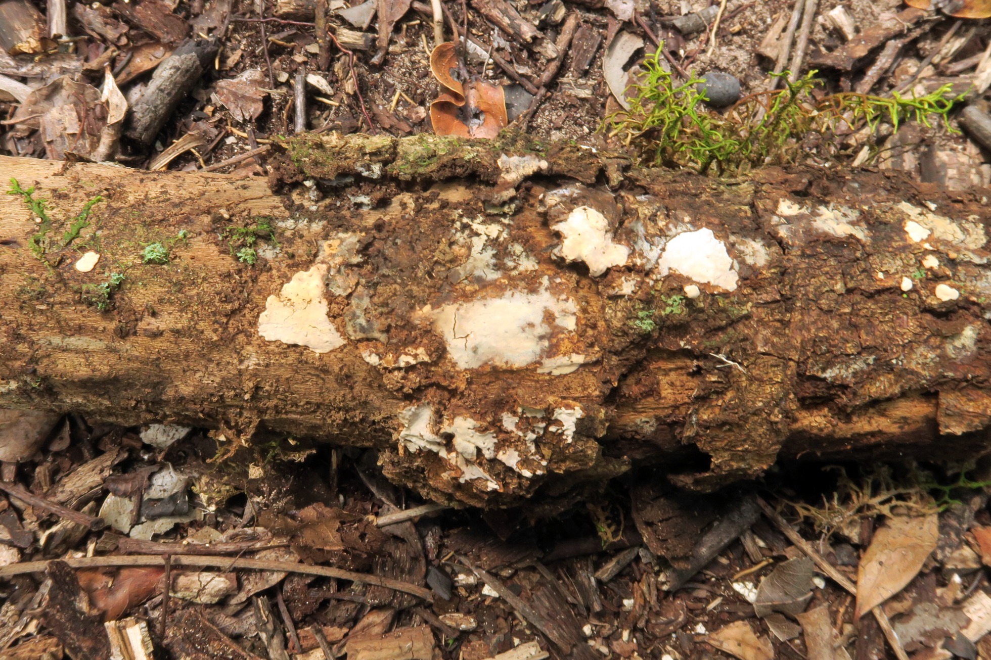 Un Corticial resupinado localizado y fotografiado el 2 de marzo, en una zona ajardinada de la República Dominicana, brotando sobre la superficie de un tronco de planifolio tropical del suelo.