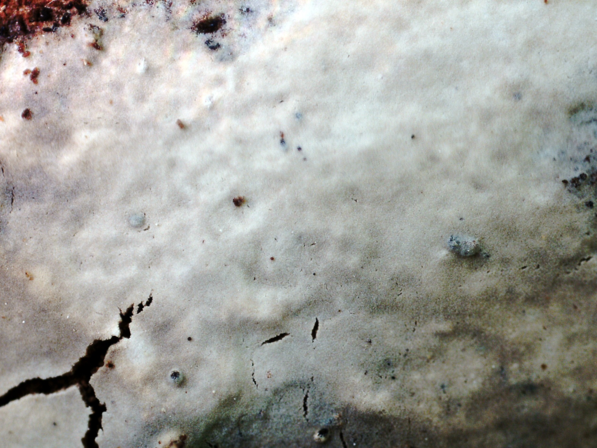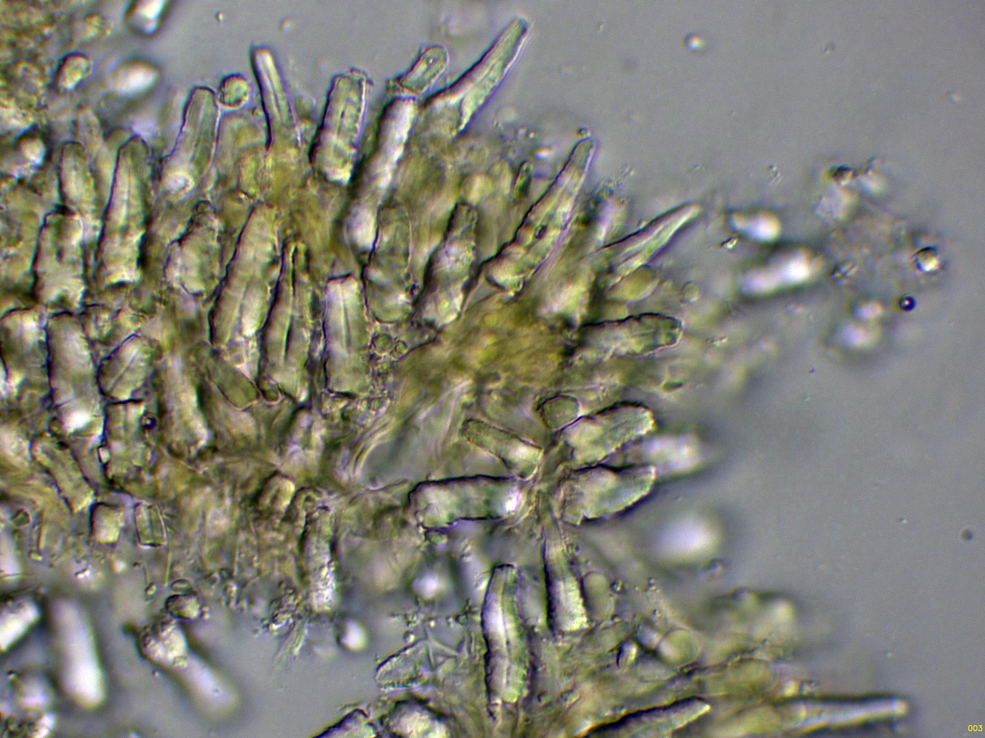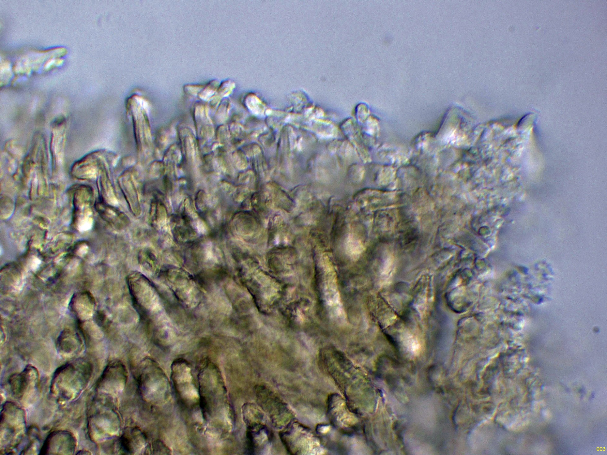 Superficie himenial lisa, blanquecina en fresco, que no cambia mucho al secarse; márgenes adelgazados, concoloros más pálidos o indeterminados. Sistema hifal monomítico. Hifas generativas con septos simples, densamente compactas y difíciles de discernir; hifas basales ≤4,6 μm de ancho, aglutinadas y formando una fina capa de hifas paralelas al sustrato, de paredes delgadas a algo gruesas; hifas del contexto y subhimeniales ≤3,3 μm de ancho, orientadas verticalmente, densamente unidas y ricamente ramificadas, de paredes delgadas. Hifas basales y parte inferior del contexto claras. Cistidios de 20–36 × 7–9,8 μm, subfusiformes, de paredes gruesas, sin fíbulas basales, recubiertos de materia cristalina. Basidios de 14–26 × 4–4,5 μm, clavados a subcilíndricos, con 4 esterigmas, sin abrazadera basal. Basidiosporas de 5,3–8,5 × 2,5–4 μm, elipsoides a subcilíndricas, lisas, inamiloides, acianófilas."