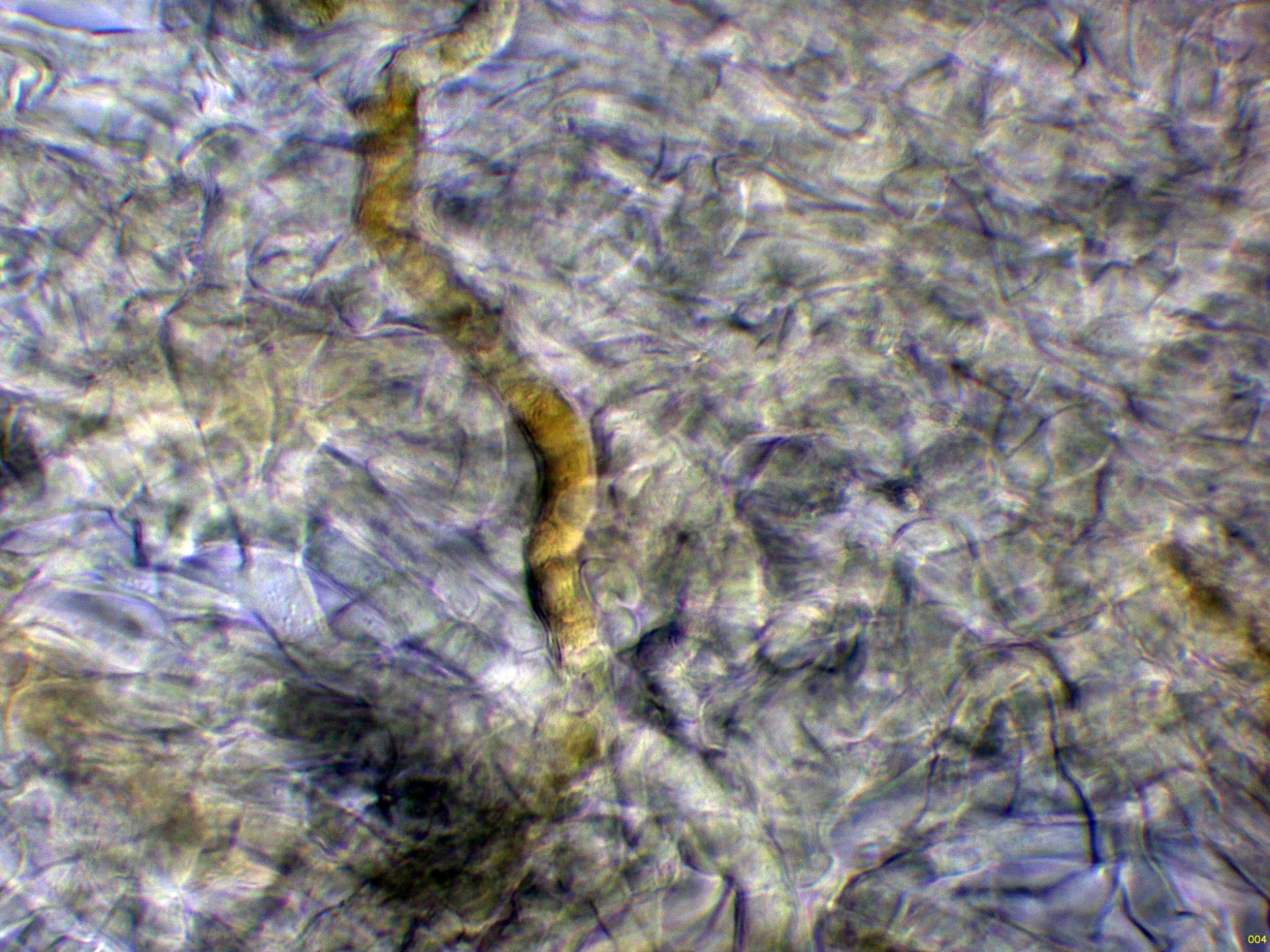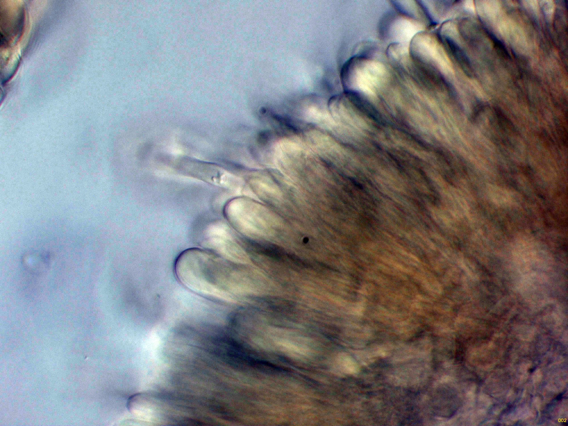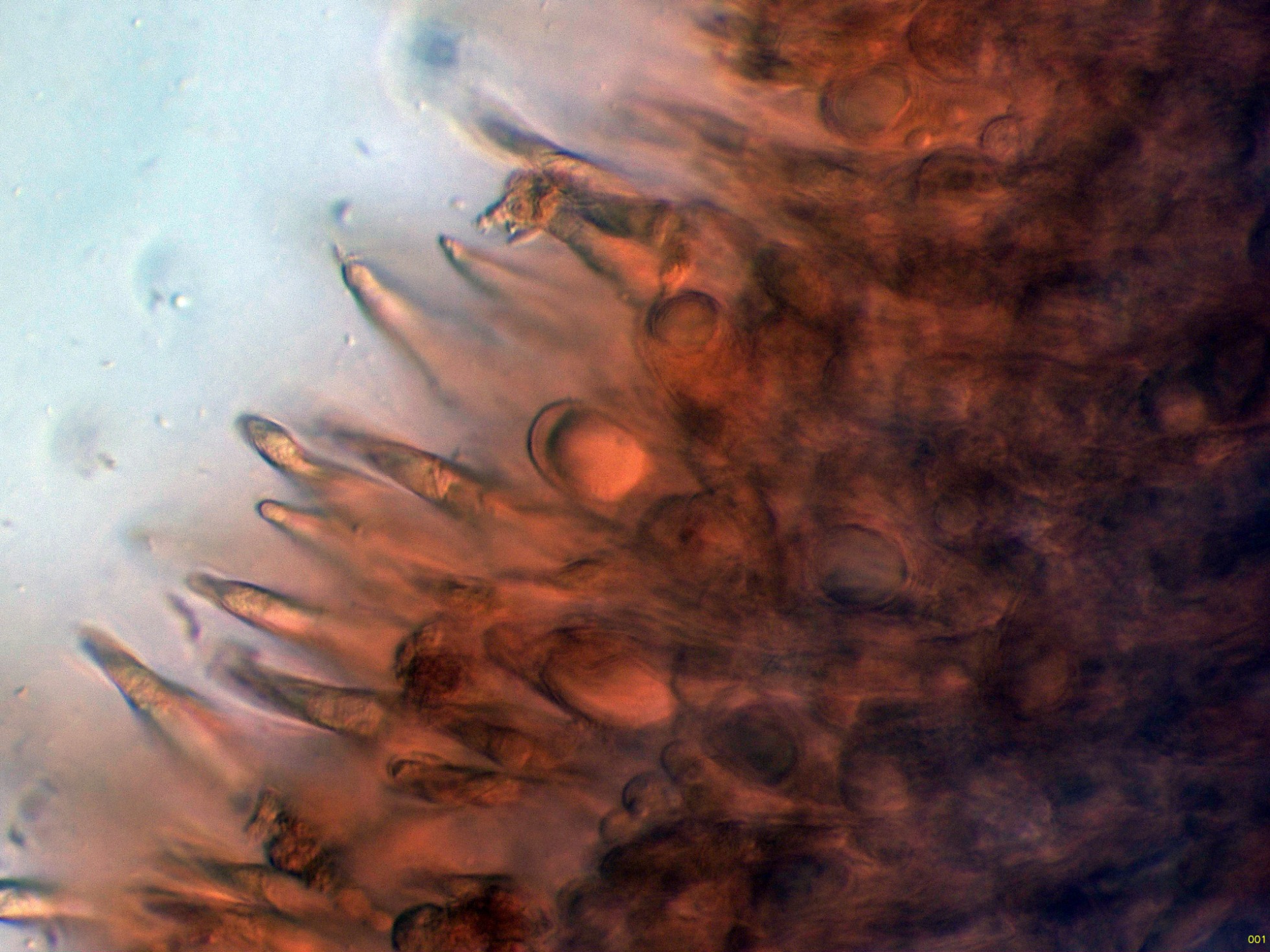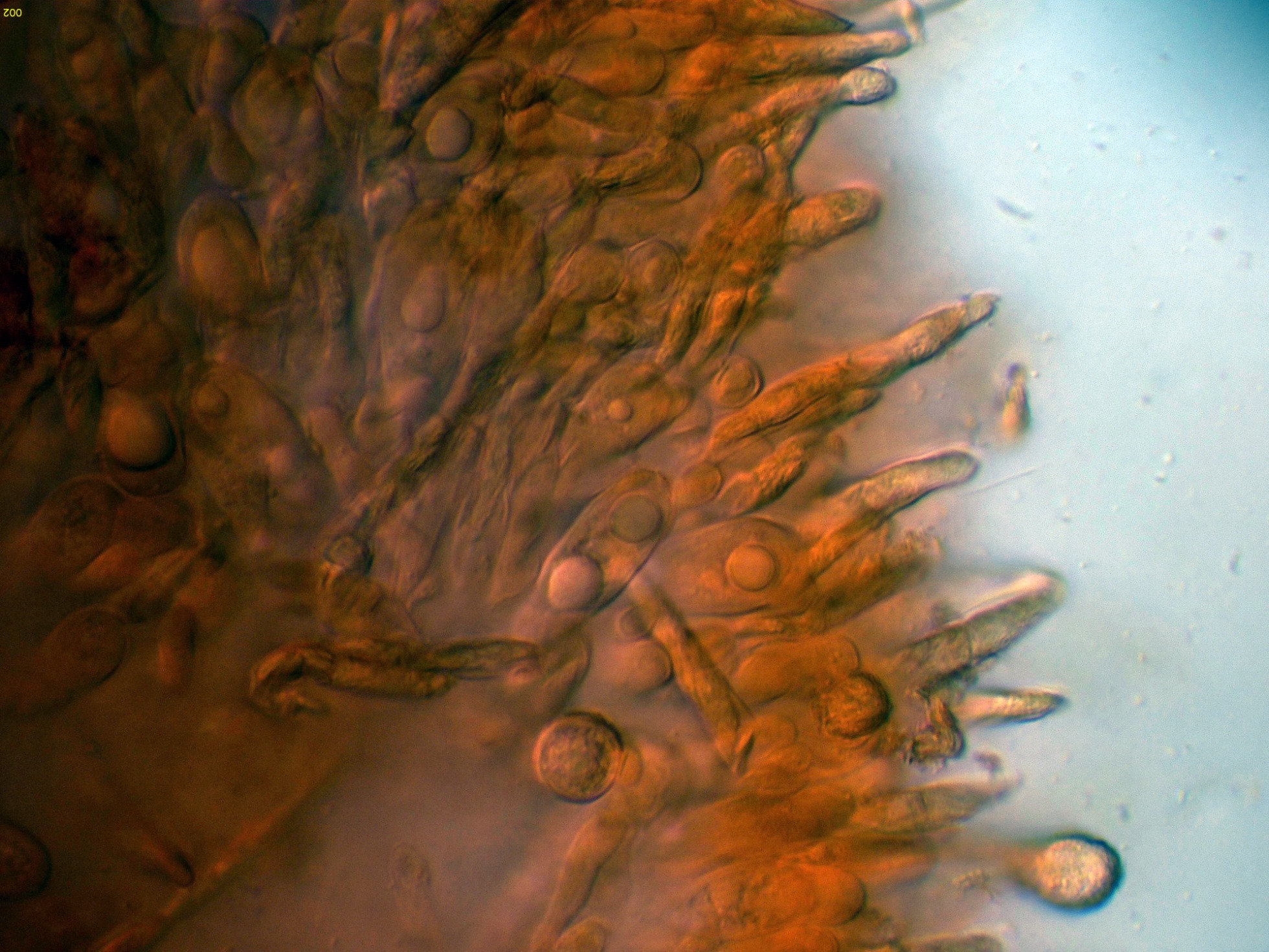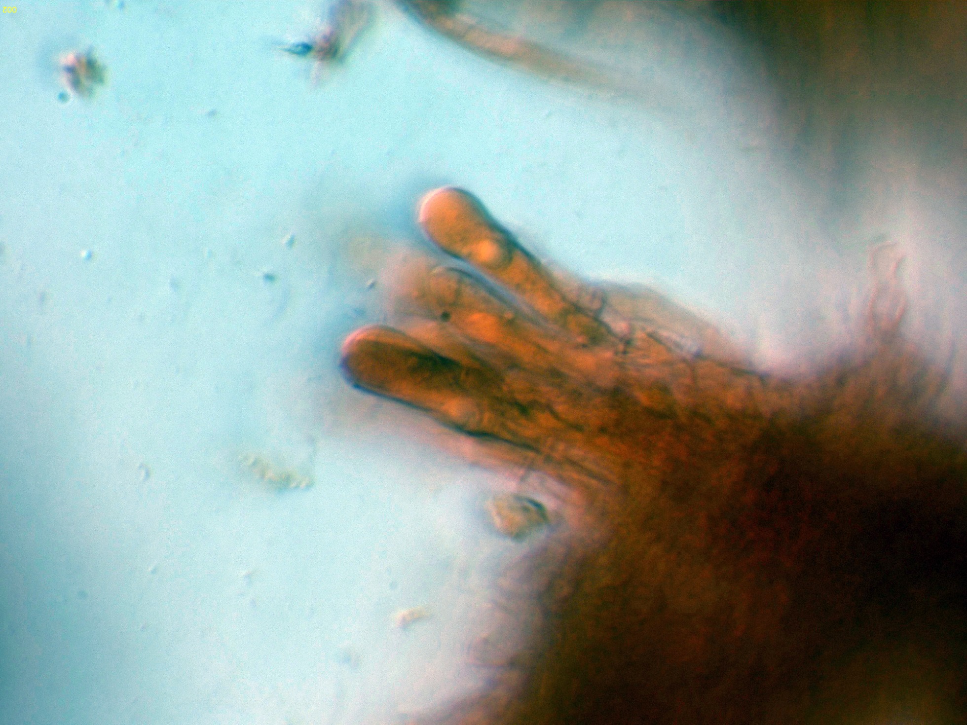 Aunque no pude observar dermatocistidios, si que presentaba en la suprapellis unas hifas primordiales con contenido, que según la bibliografía se deberían teñir con la Sulfovainillina (aquí en la Isla no dispongo de ella, para poder confirmar este punto).