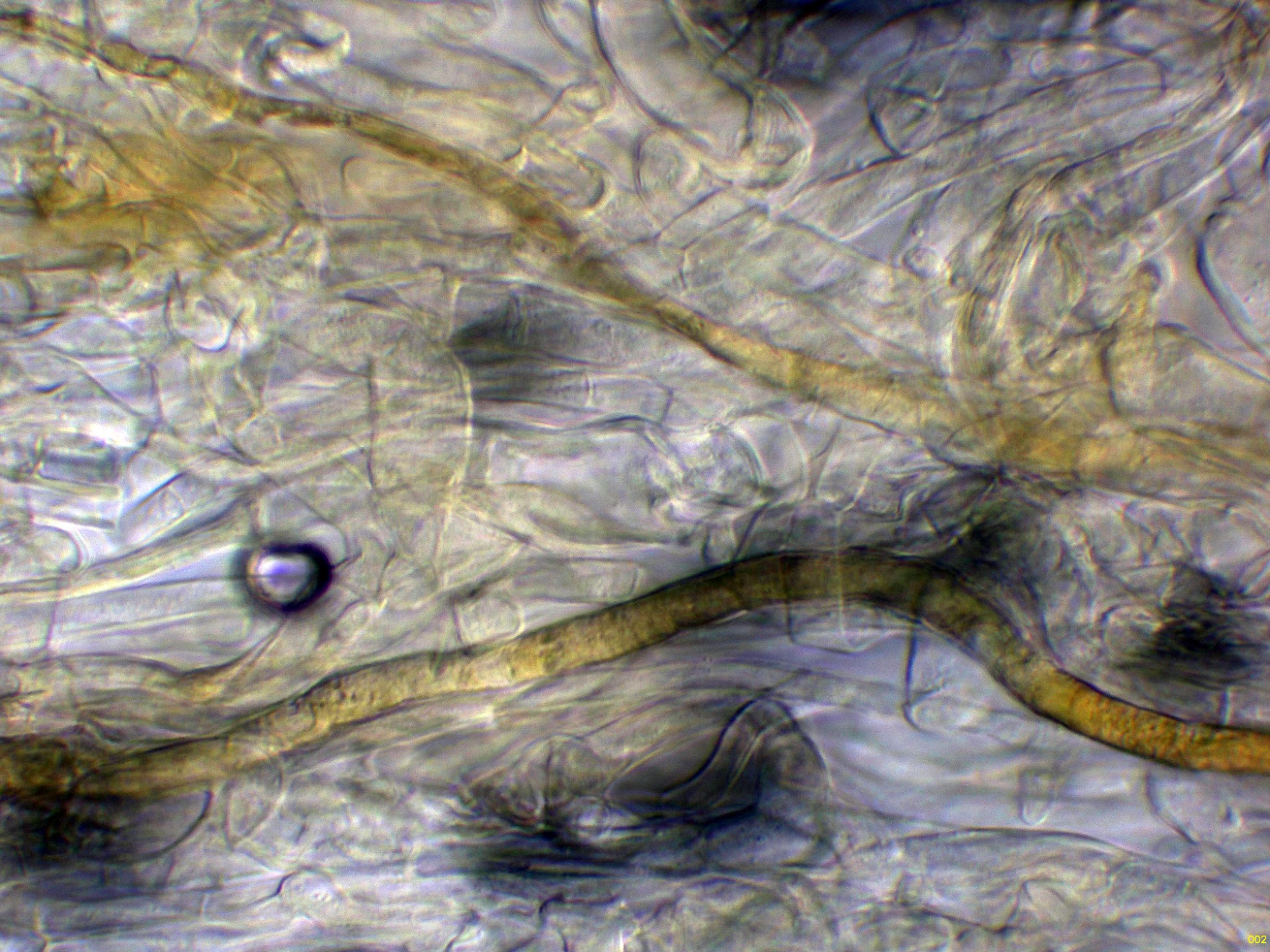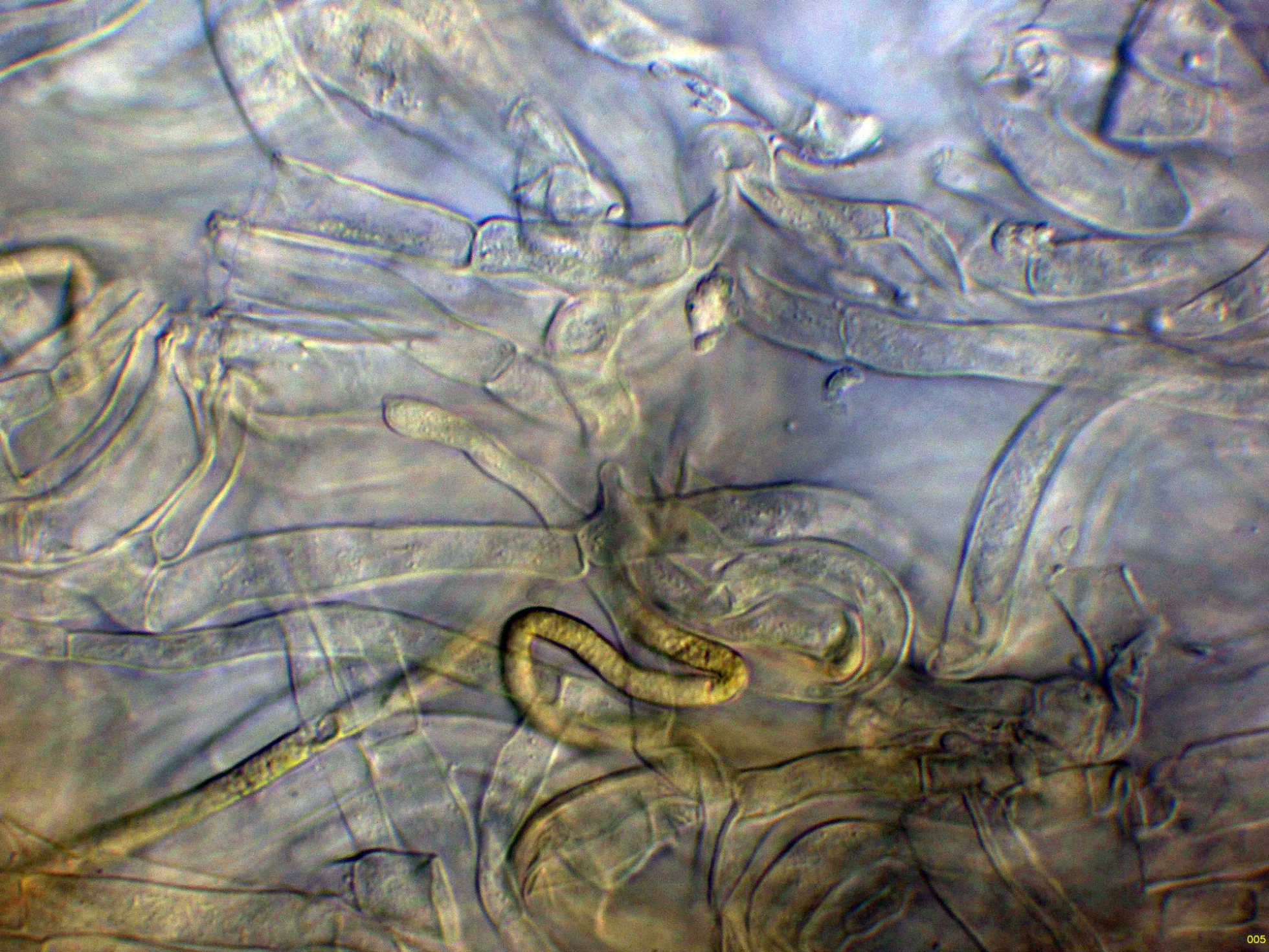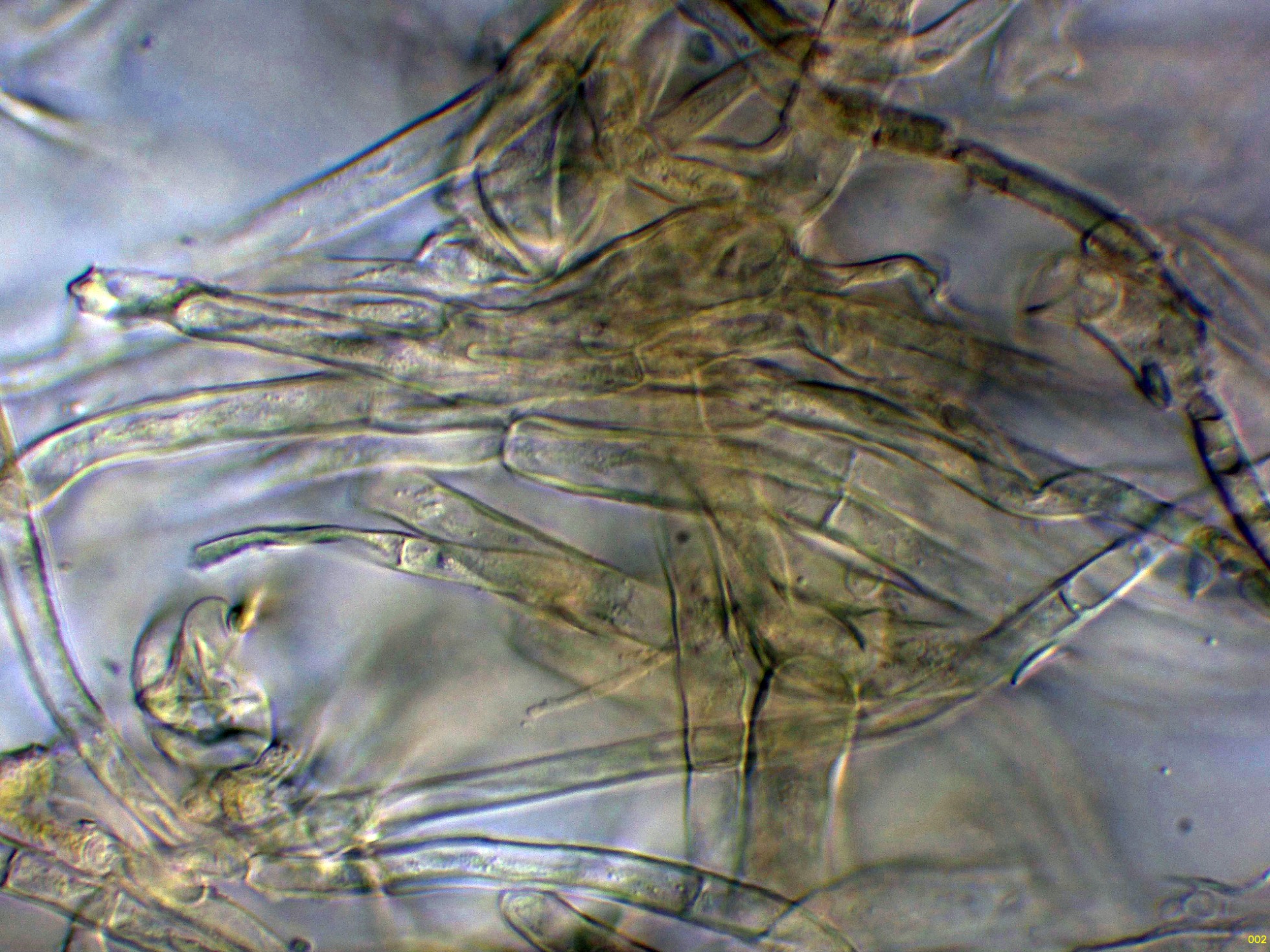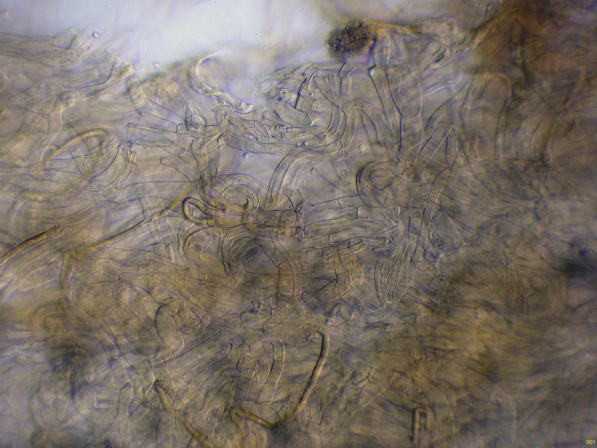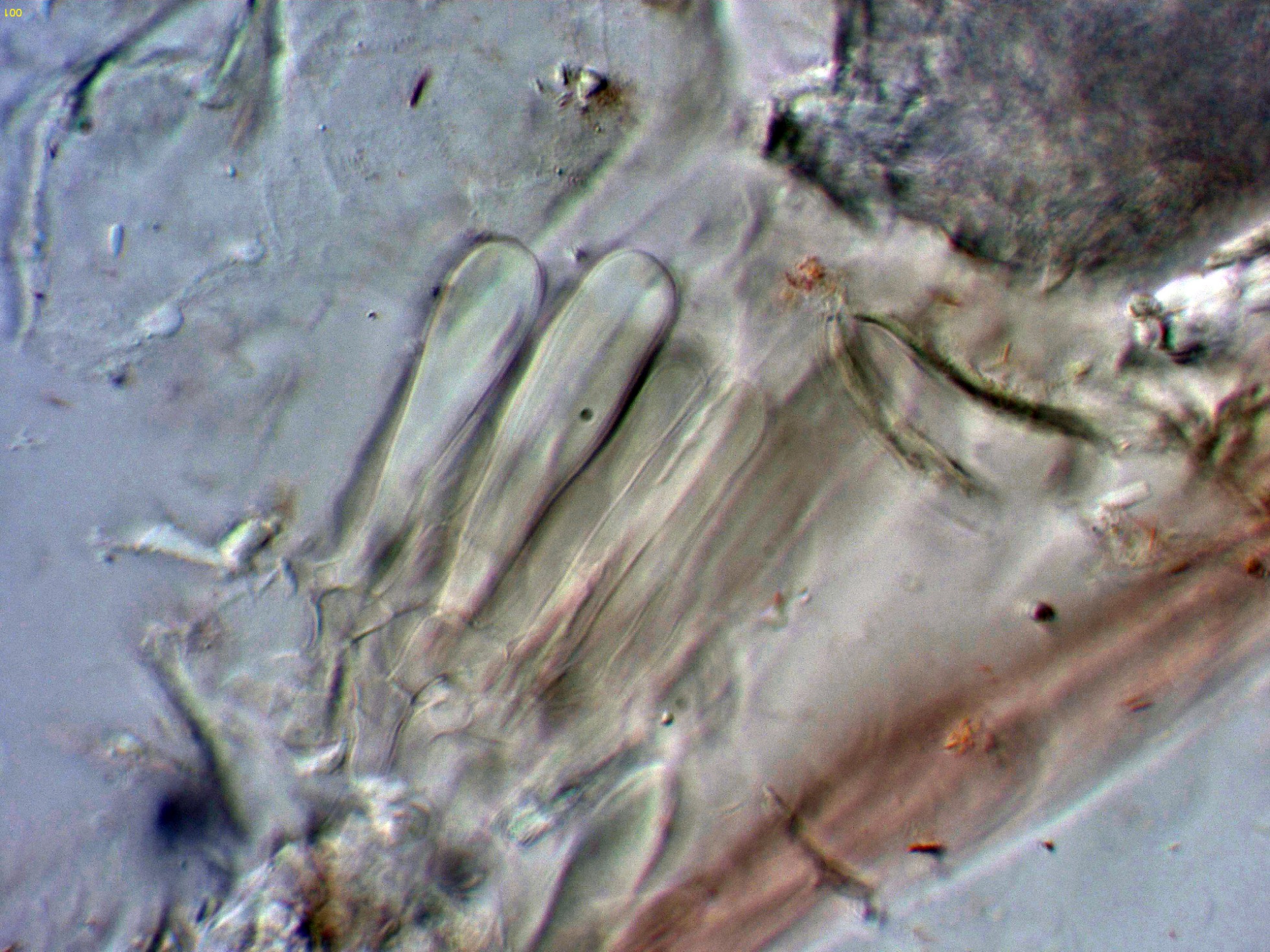 Aunque no pude observar dermatocistidios, si que presentaba en la suprapellis unas hifas primordiales con contenido, que según la bibliografía se deberían teñir con la Sulfovainillina (aquí en la Isla no dispongo de ella, para poder confirmar este punto).