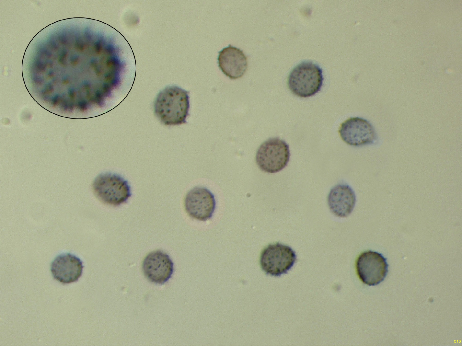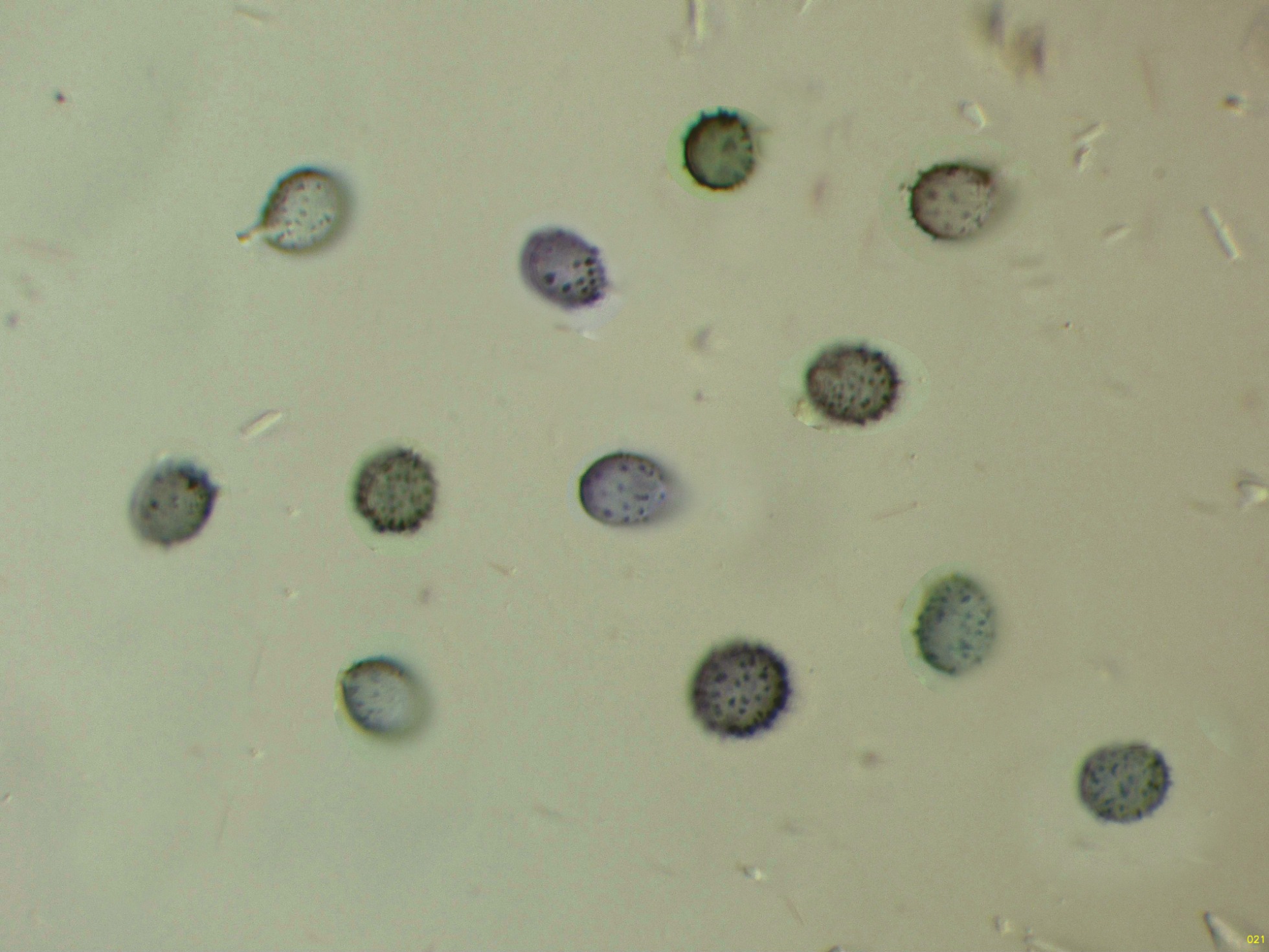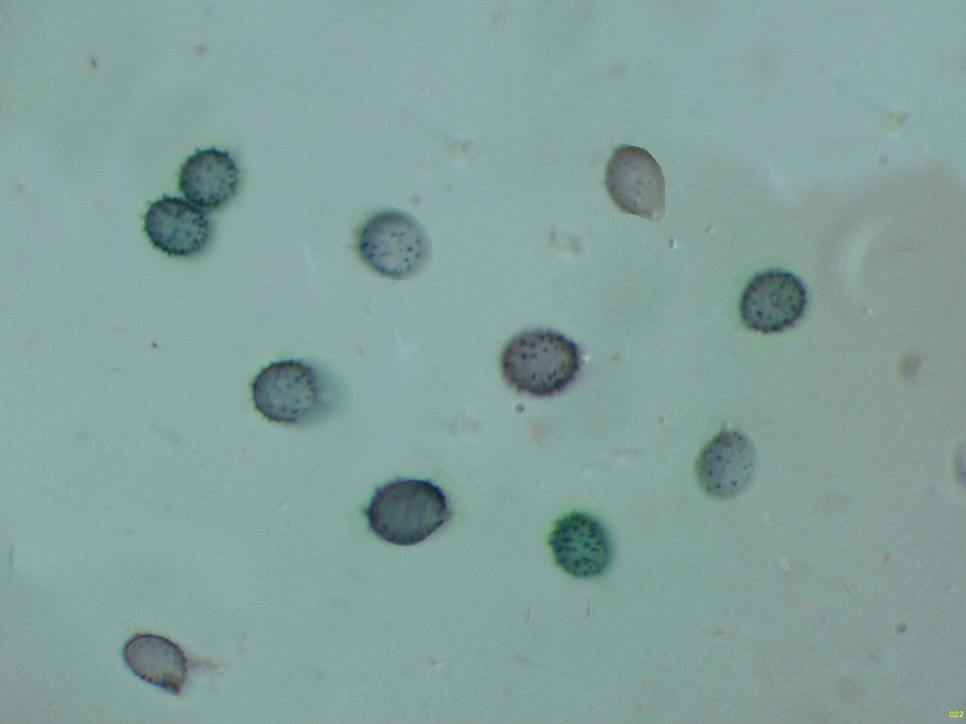 Las esporas en Reactivo de Melzer, estas esporas con verrugas dispersas sin líneas de conexión (crestas) entre ellas: