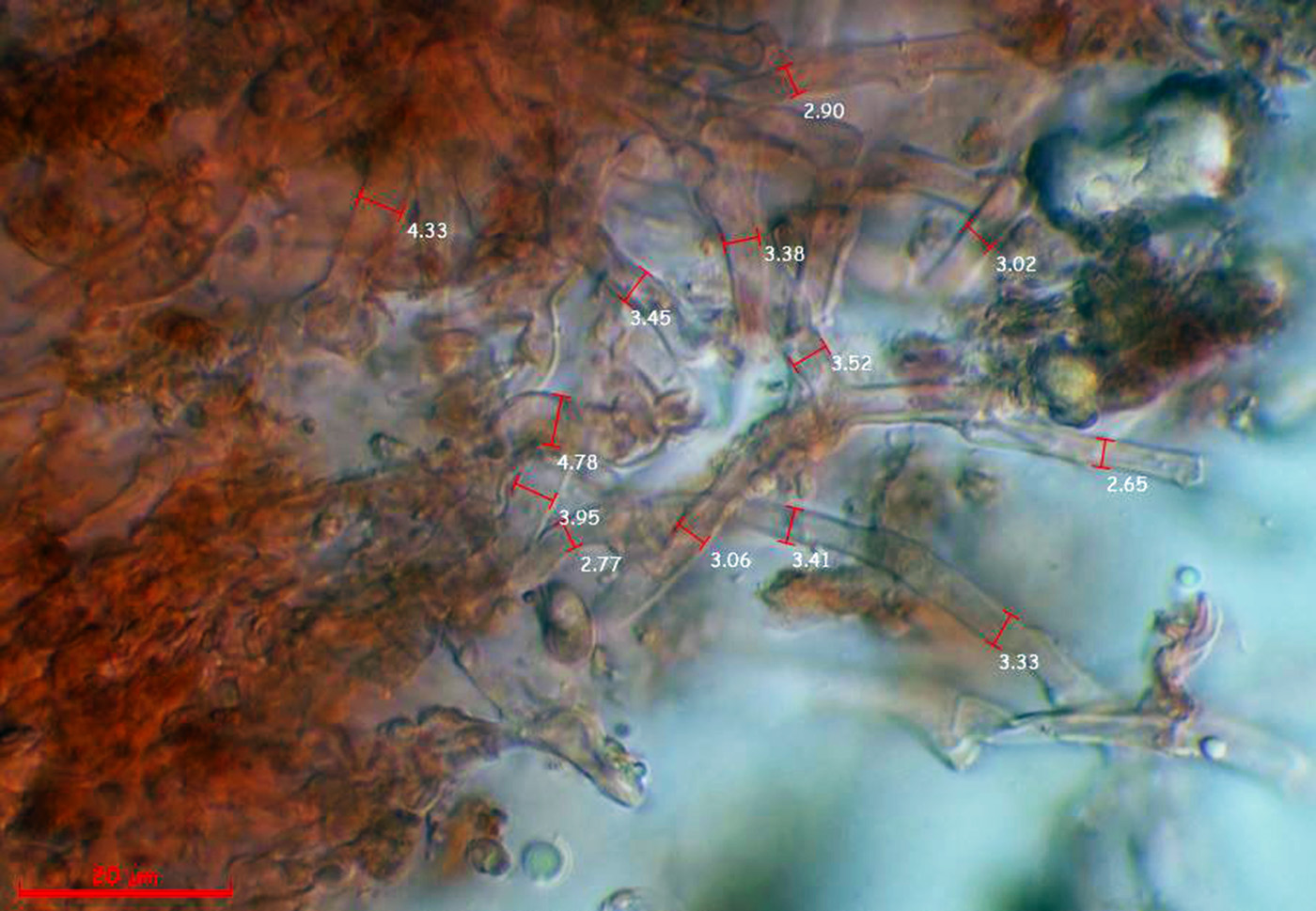 Las hifas subiculares con sus medidas en anchura: