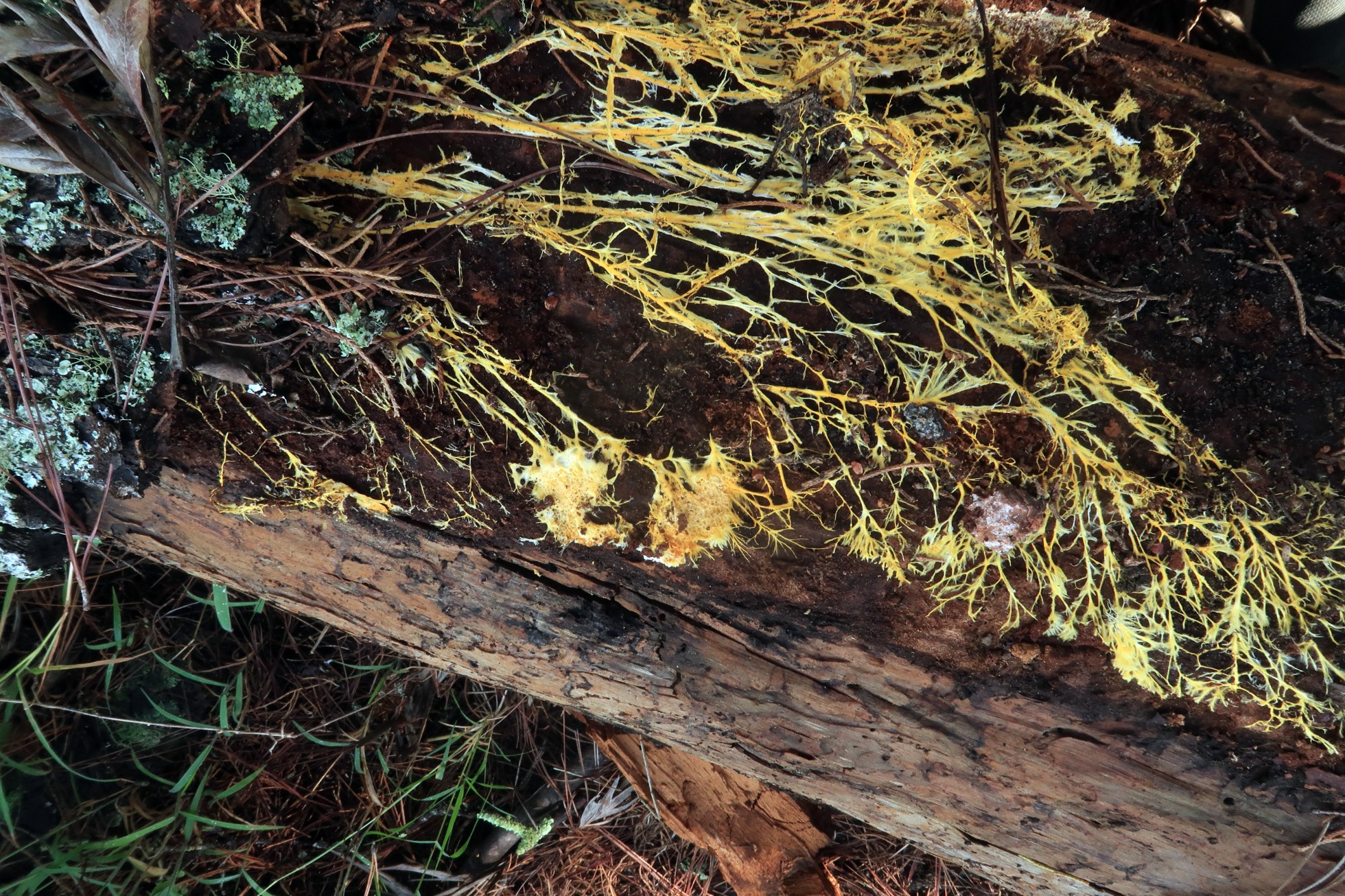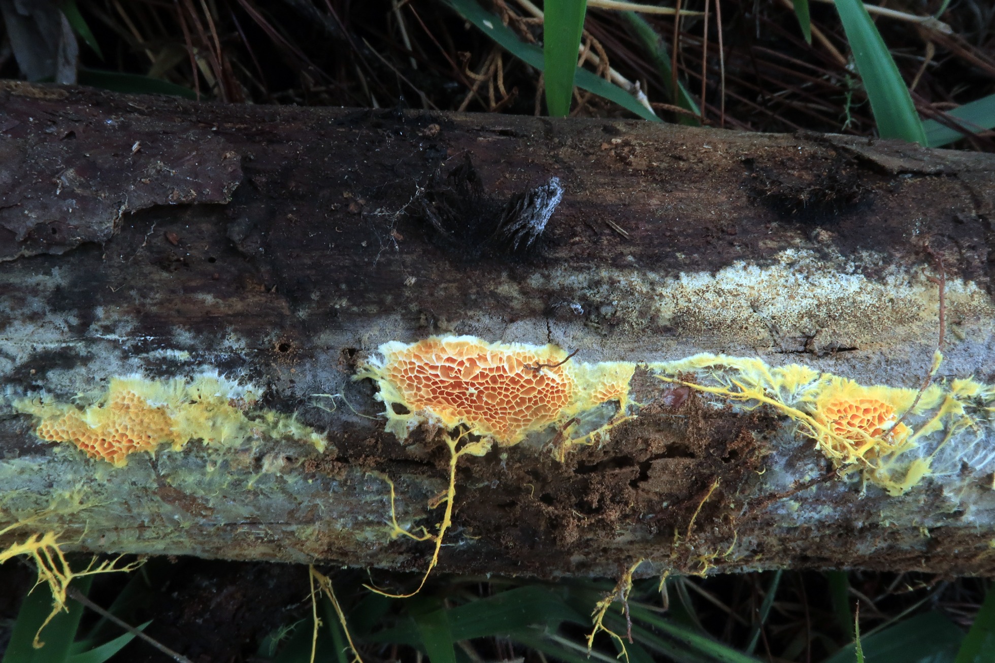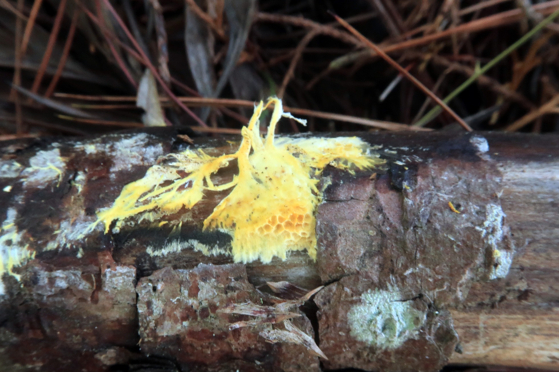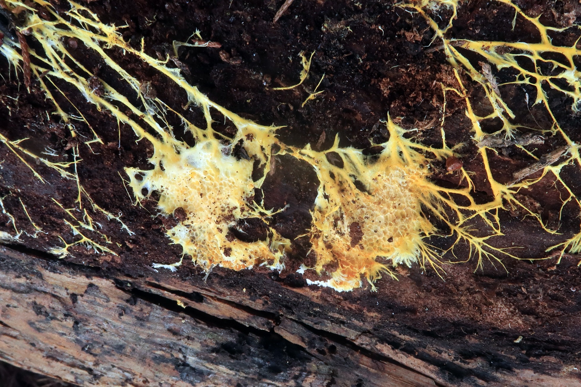 A destacar el micelio superficial de un color amarillo vivo: