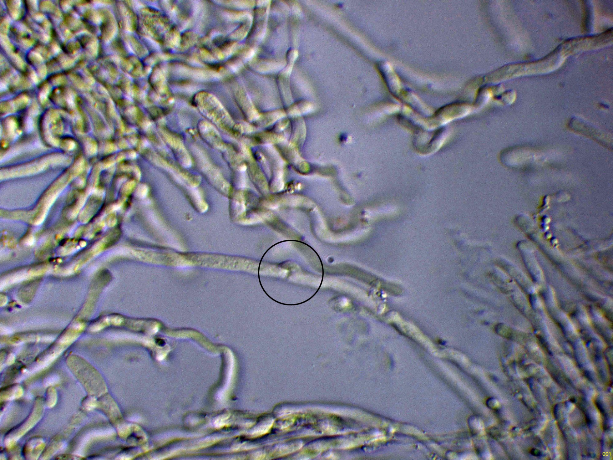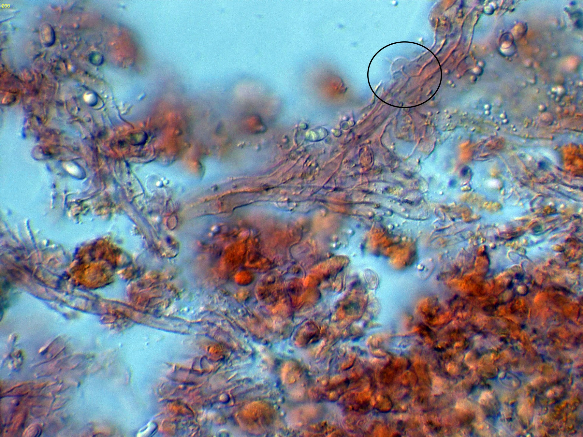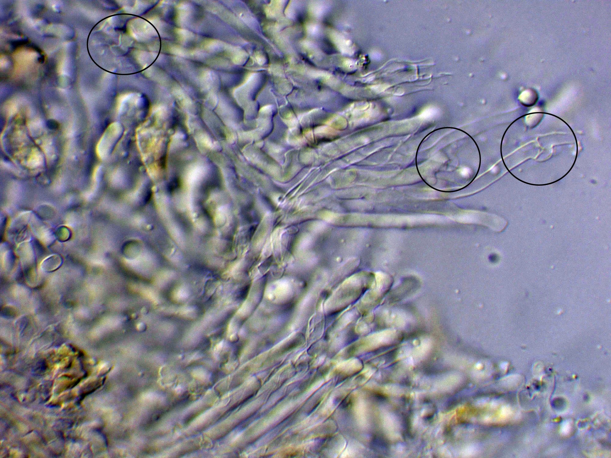 Hifas generativas fibuladas, bastante escondidas en el subhimenio.