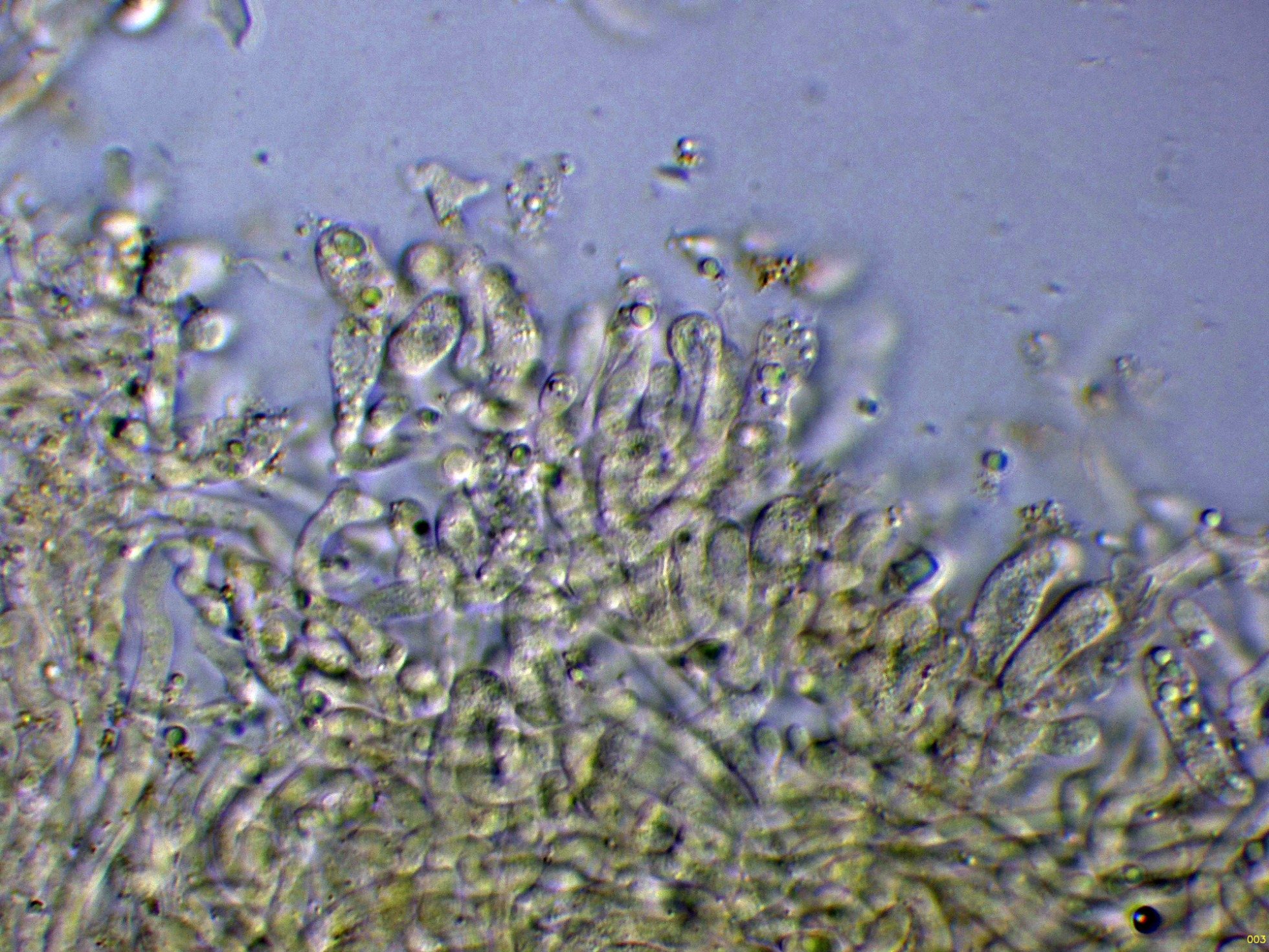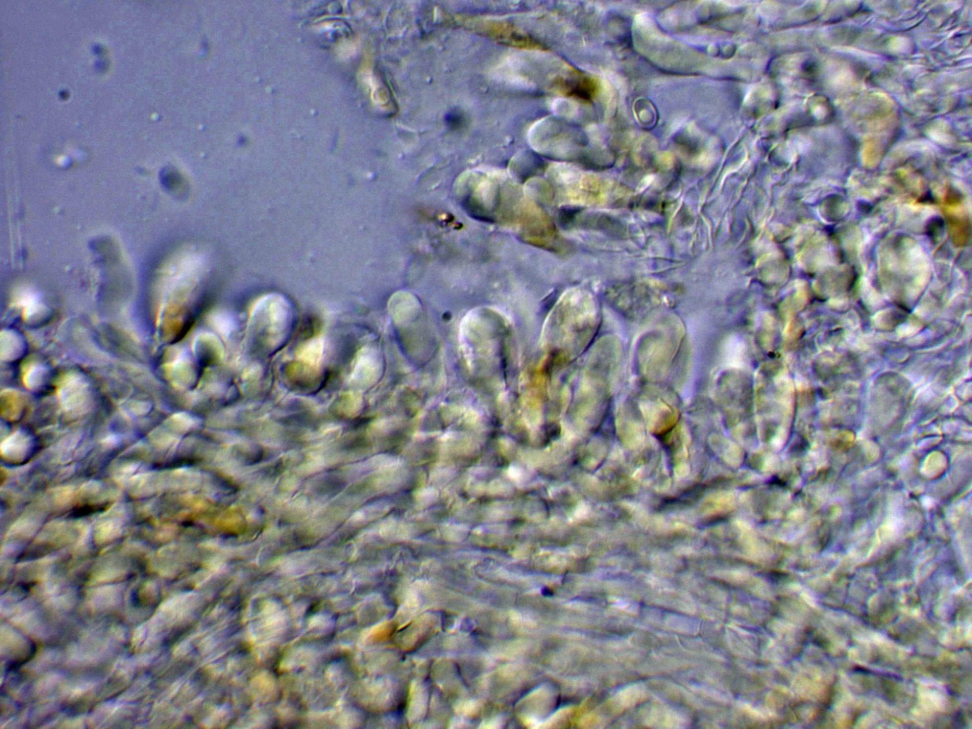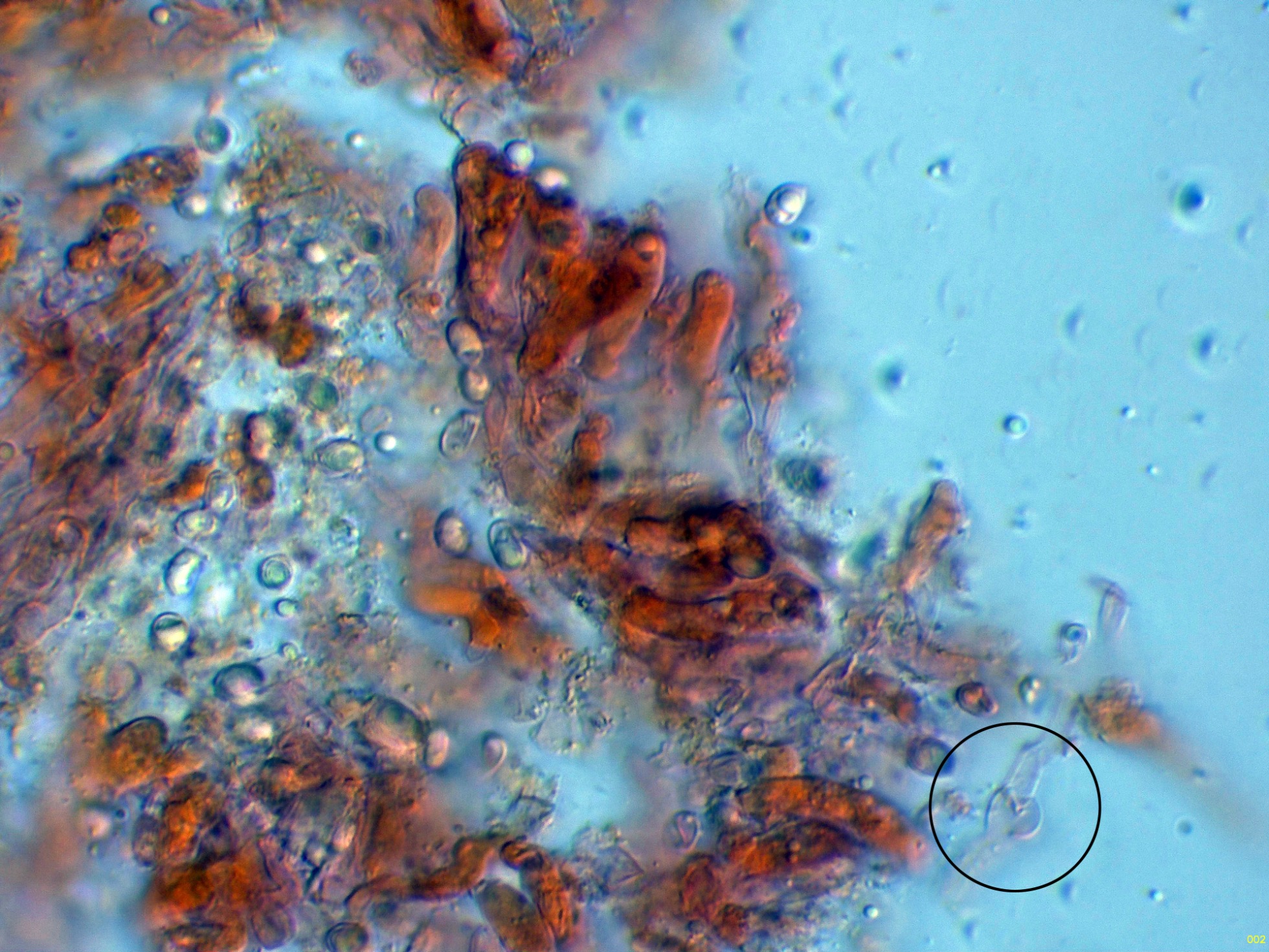 Aunque la especie no presenta cistidios, si que se pueden observar en el himenio algunos cistidiolos fusiformes dispersos, con unas medidas parecidas a los basidios.