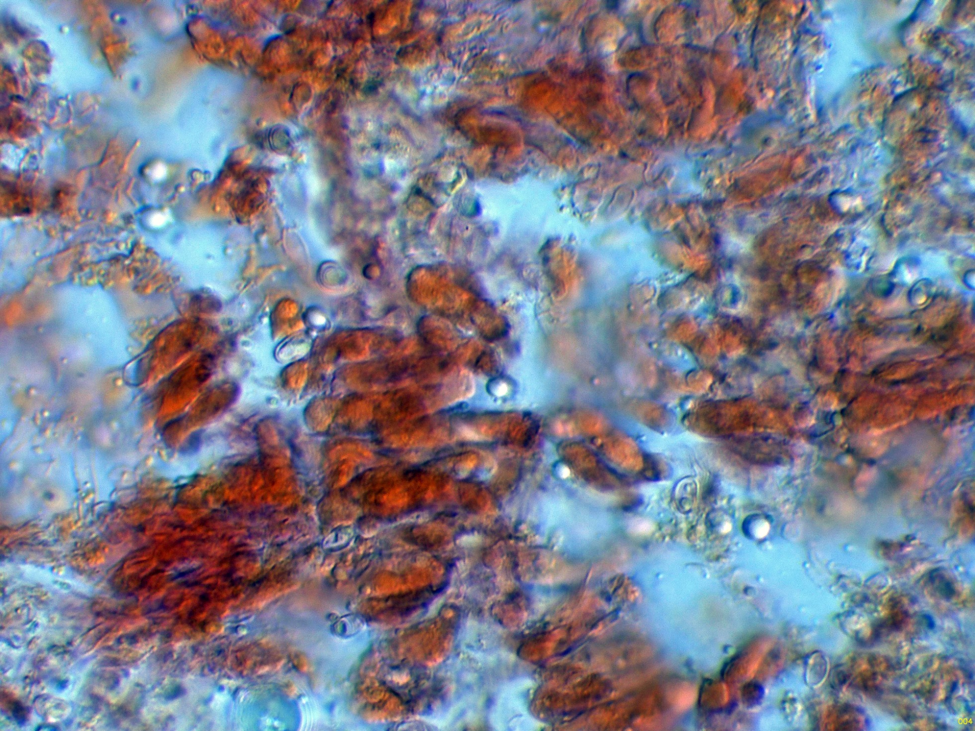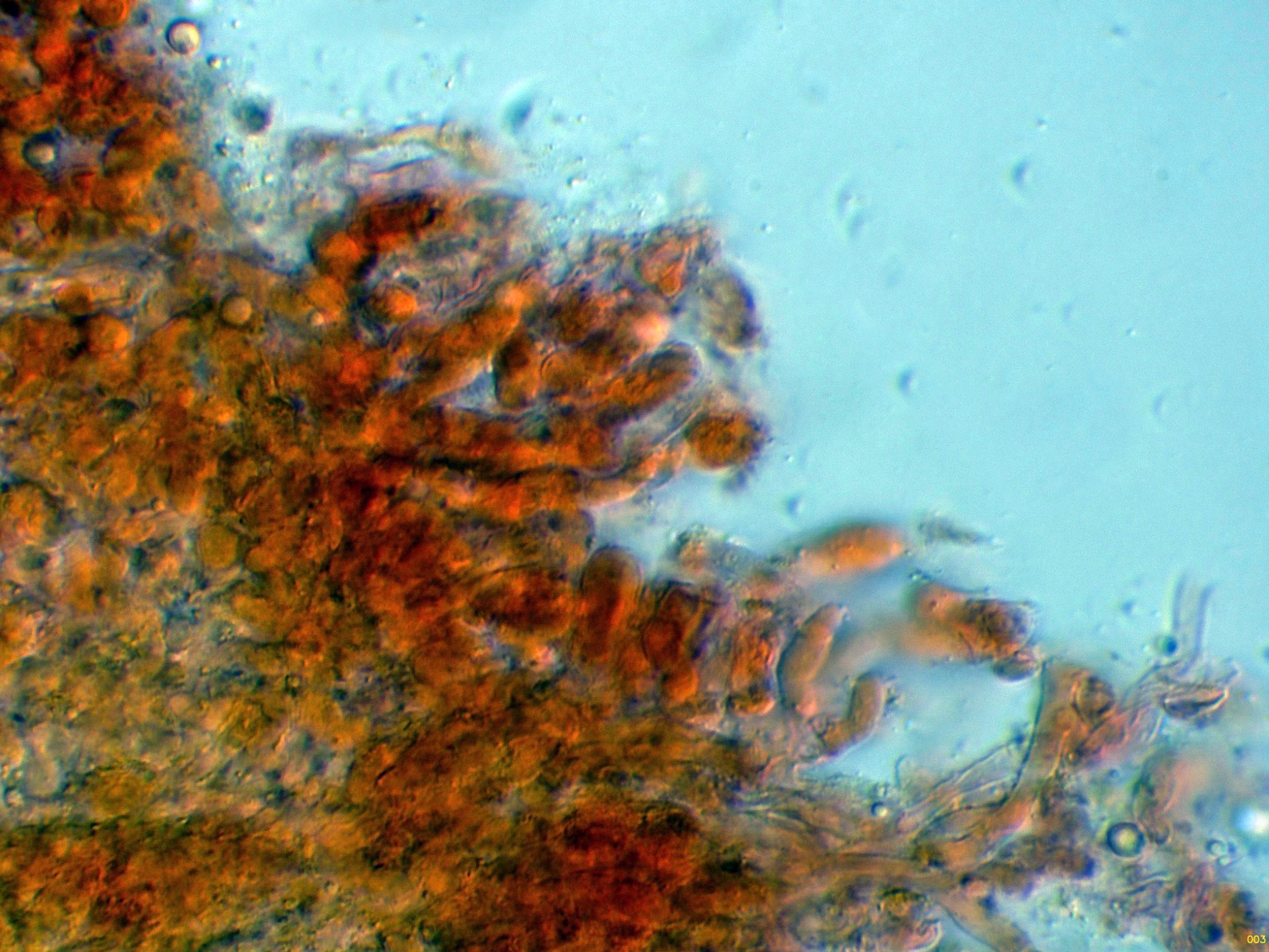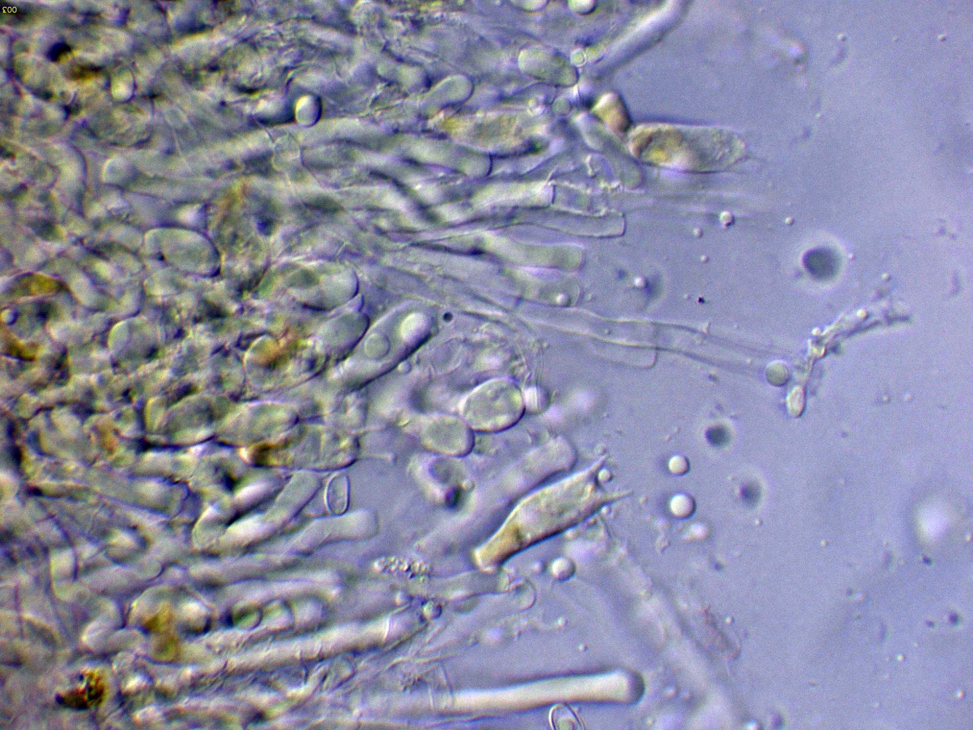 Aunque la especie no presenta cistidios, si que se pueden observar en el himenio algunos cistidiolos fusiformes dispersos, con unas medidas parecidas a los basidios.