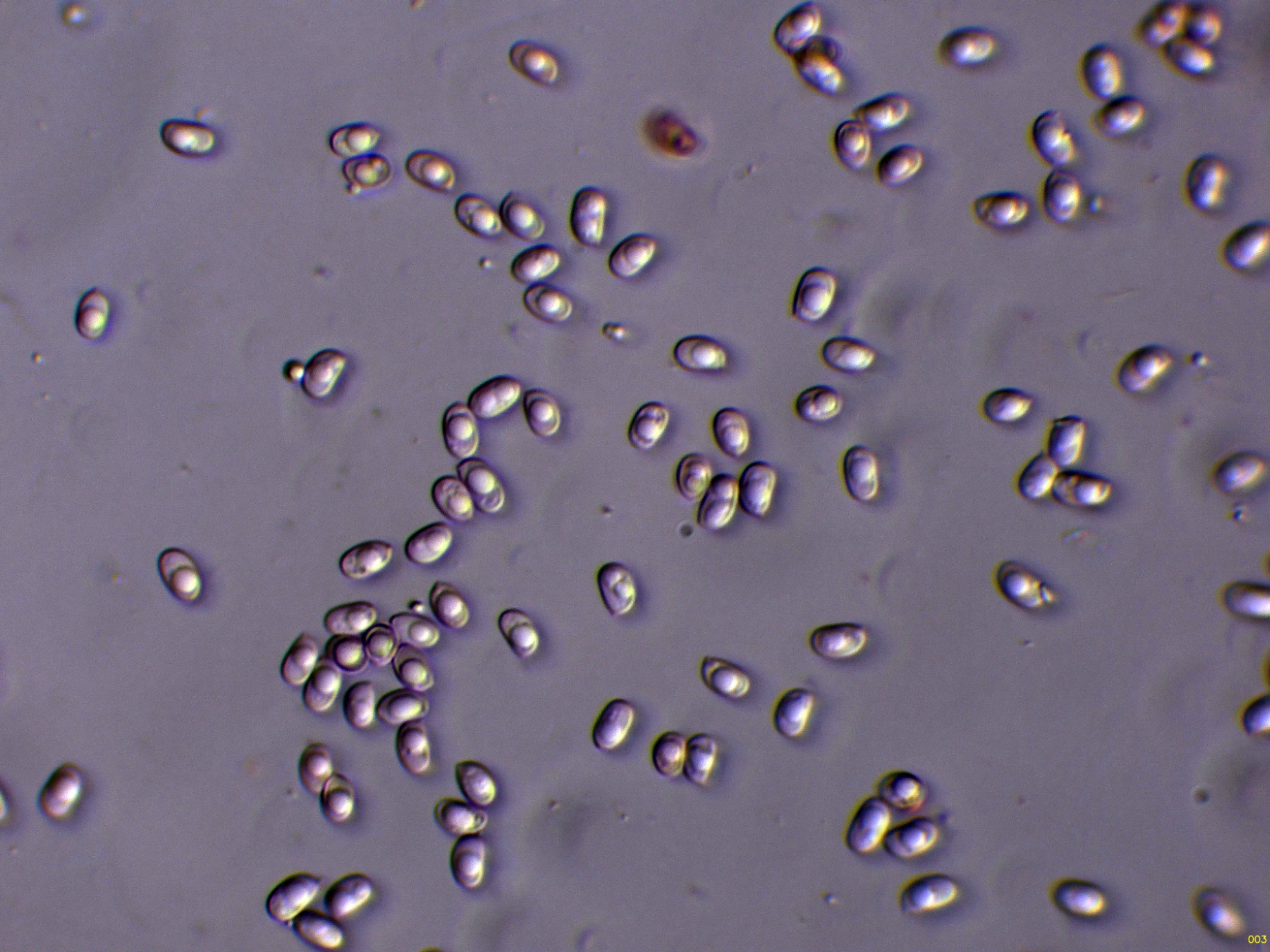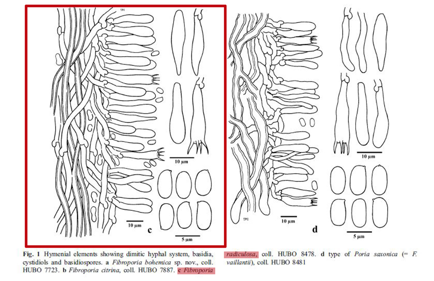 Observaciones: Estudio contrastado con el trabajo de 2010 de Annarosa Bernicchia & Ryvarden, con el título de "A phylogenetic analysis of Antrodia s.l. based on nrDNA ITS sequences, with emphasis on rhizomorphic European species", que citan unas medidas esporales para la versión americana de la Fibroporia radiculosa de 6–8 × 3–4 μm., ligeramente por encima en cuanto a la longitud, no así en lo que se refiere a la anchura.
