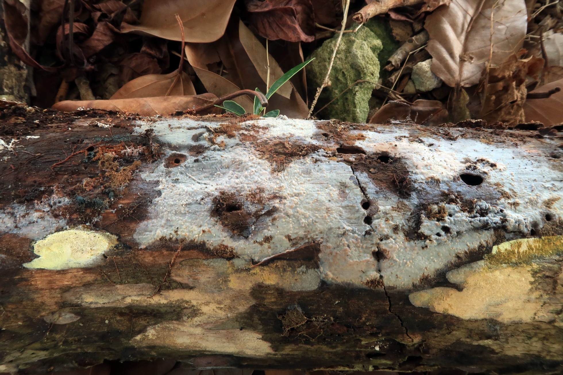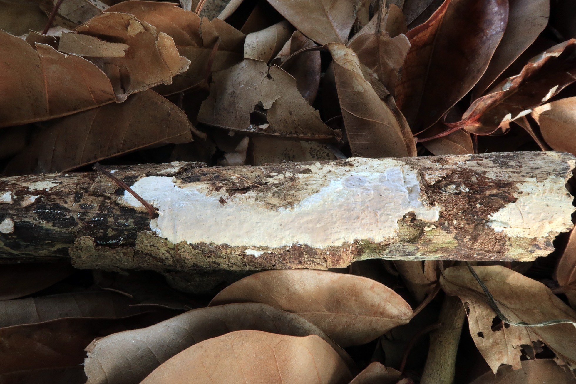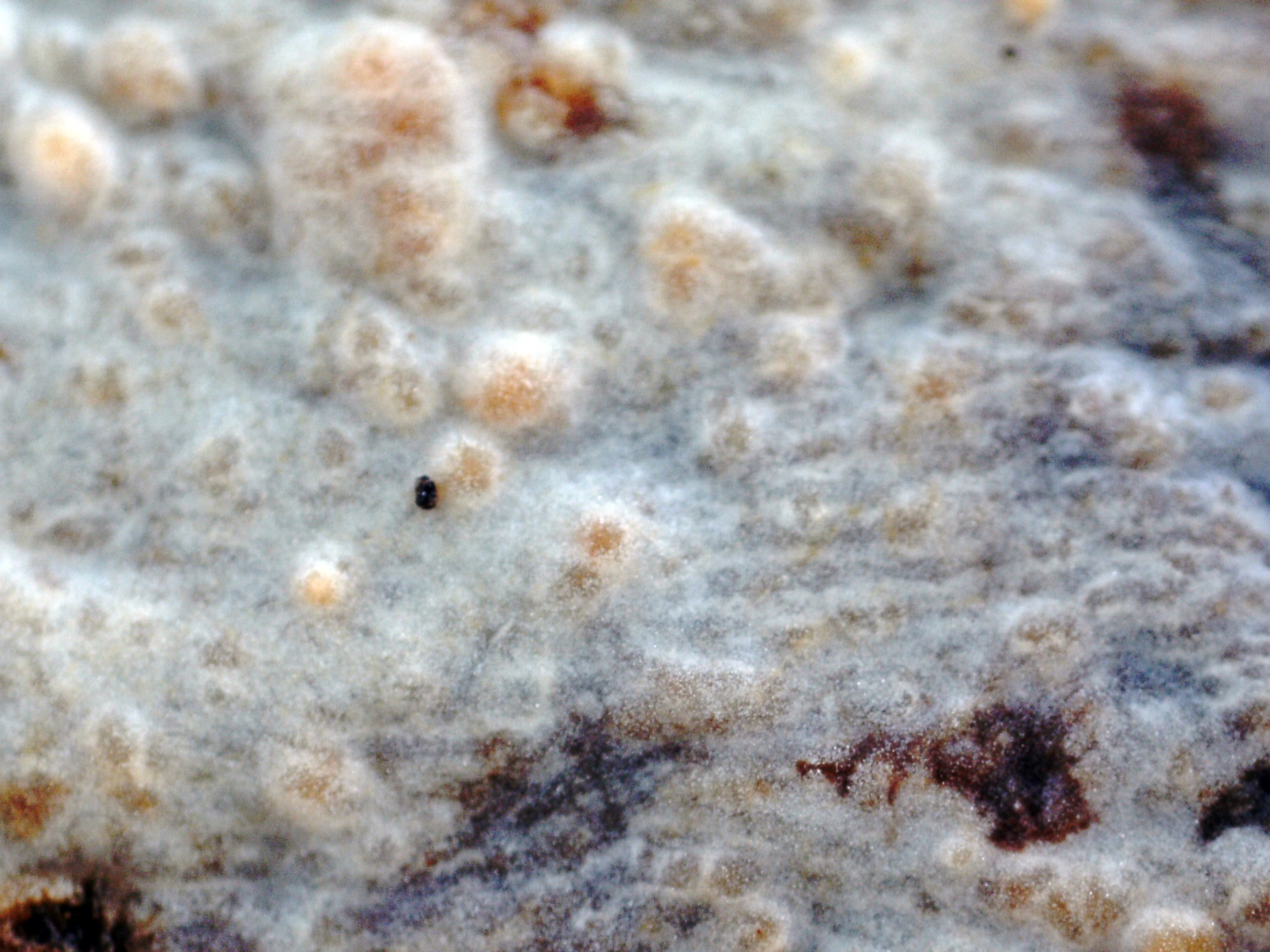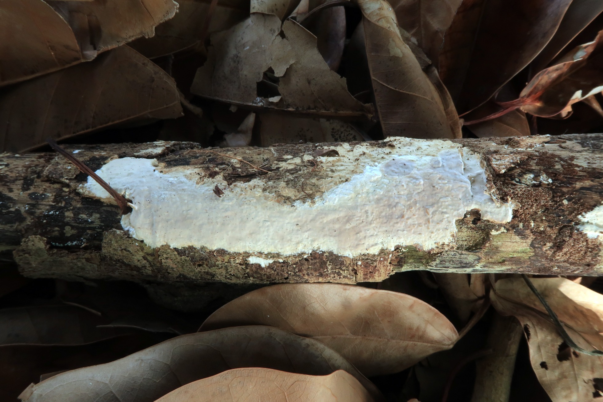 Un Corticial muy fino de color grisáceo y consistencia cérea, bastante extendido por todos los Continentes, la Exidiopsis galzinii.