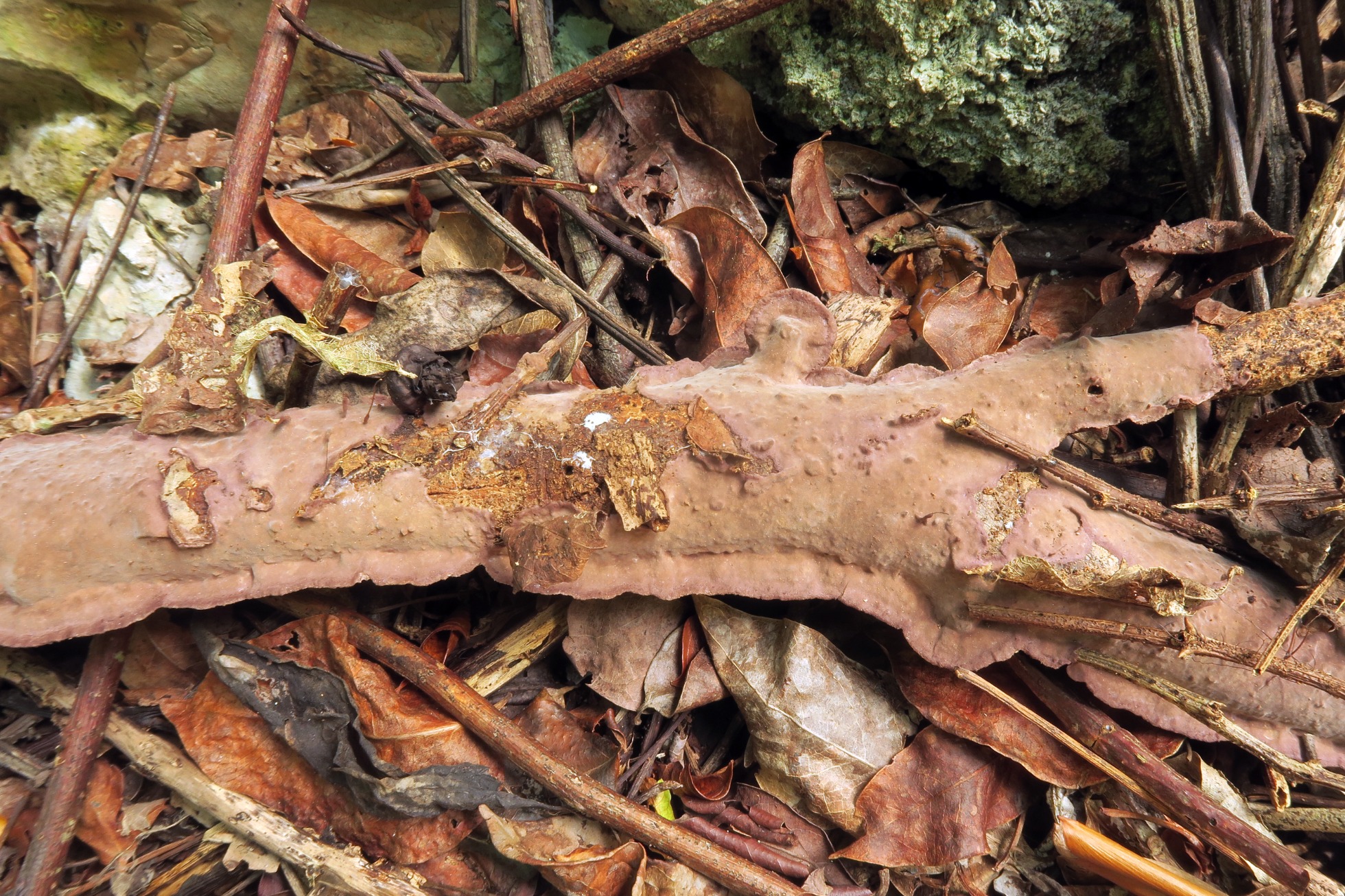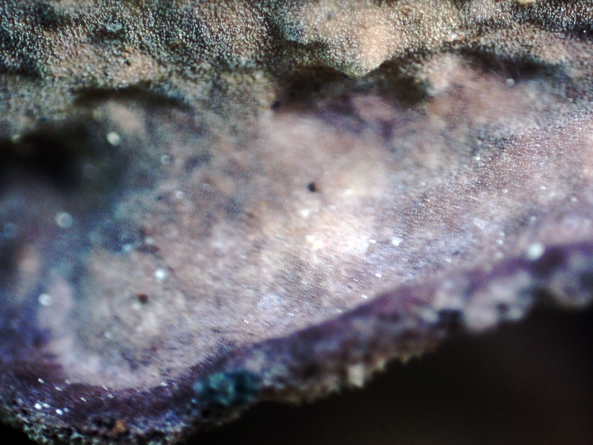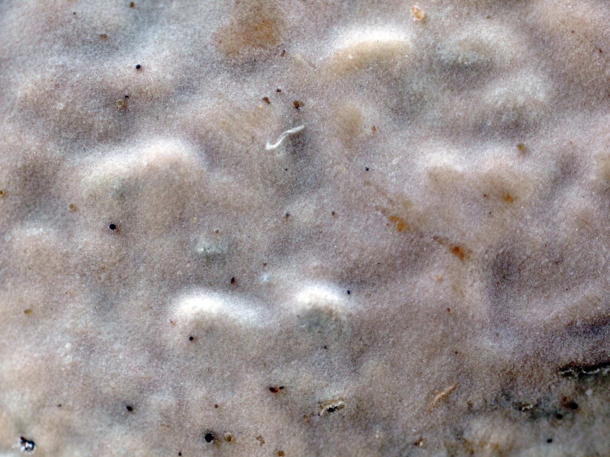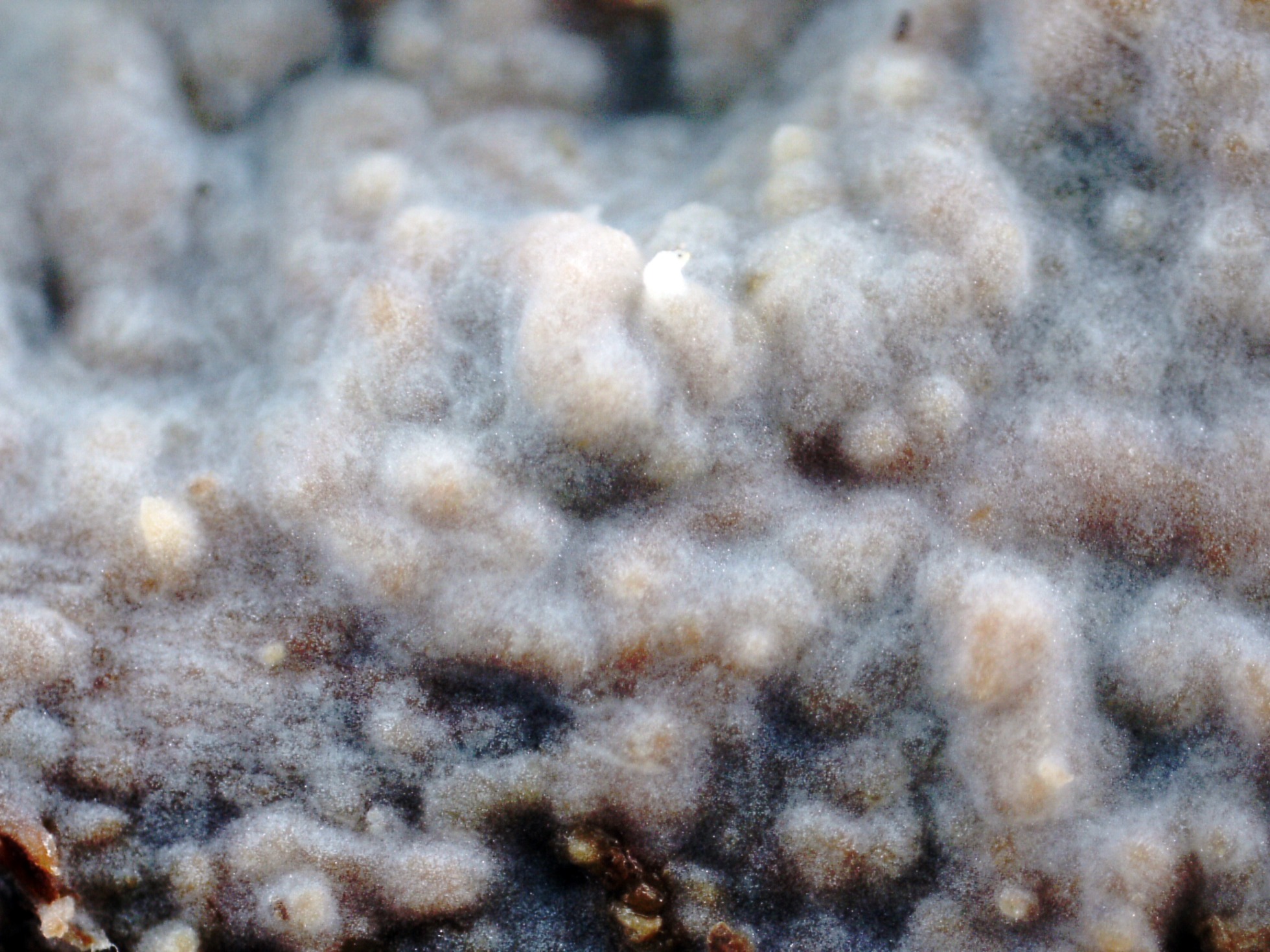 Un Corticial muy fino de color grisáceo y consistencia cérea, bastante extendido por todos los Continentes, la Exidiopsis galzinii.