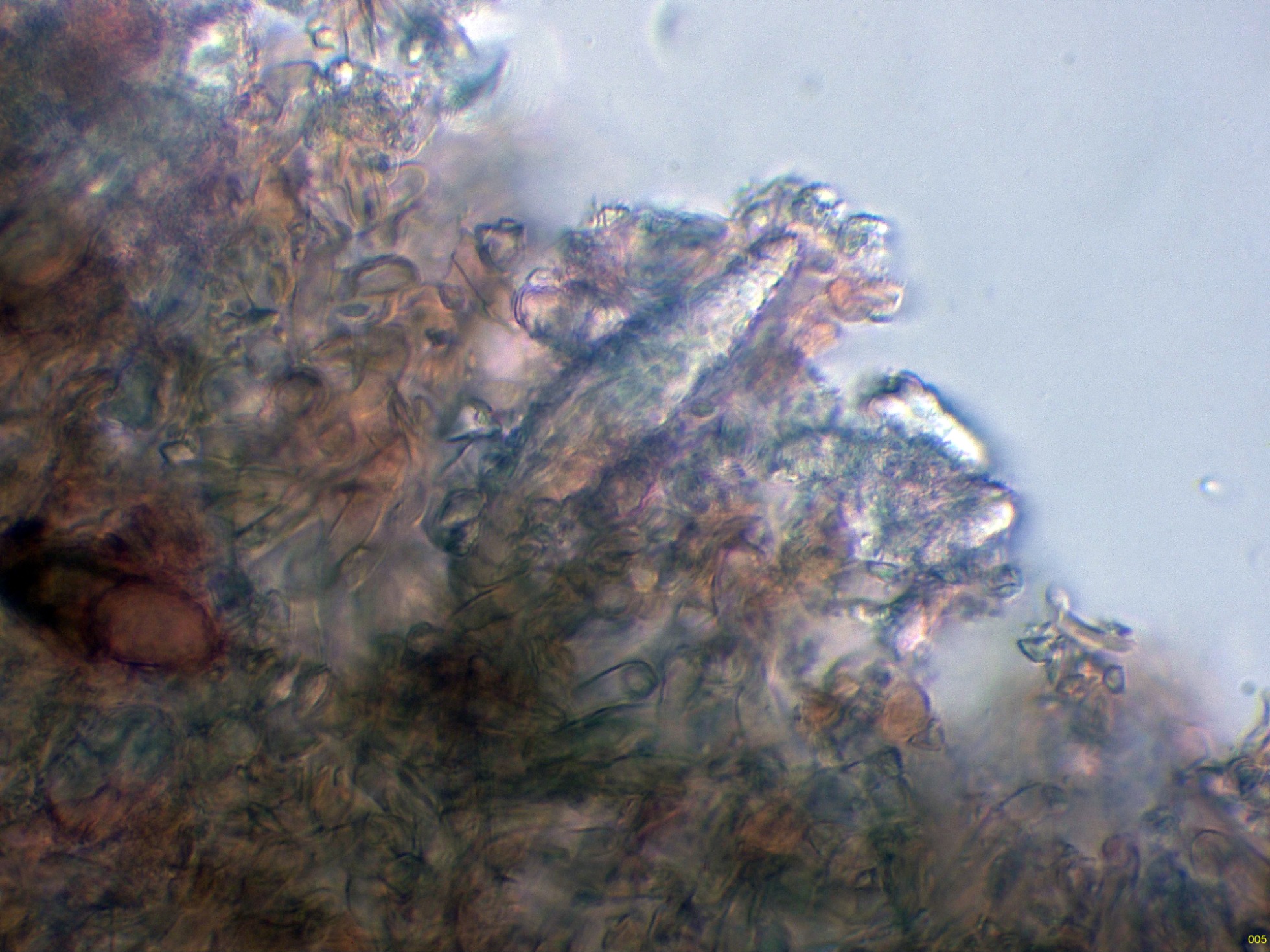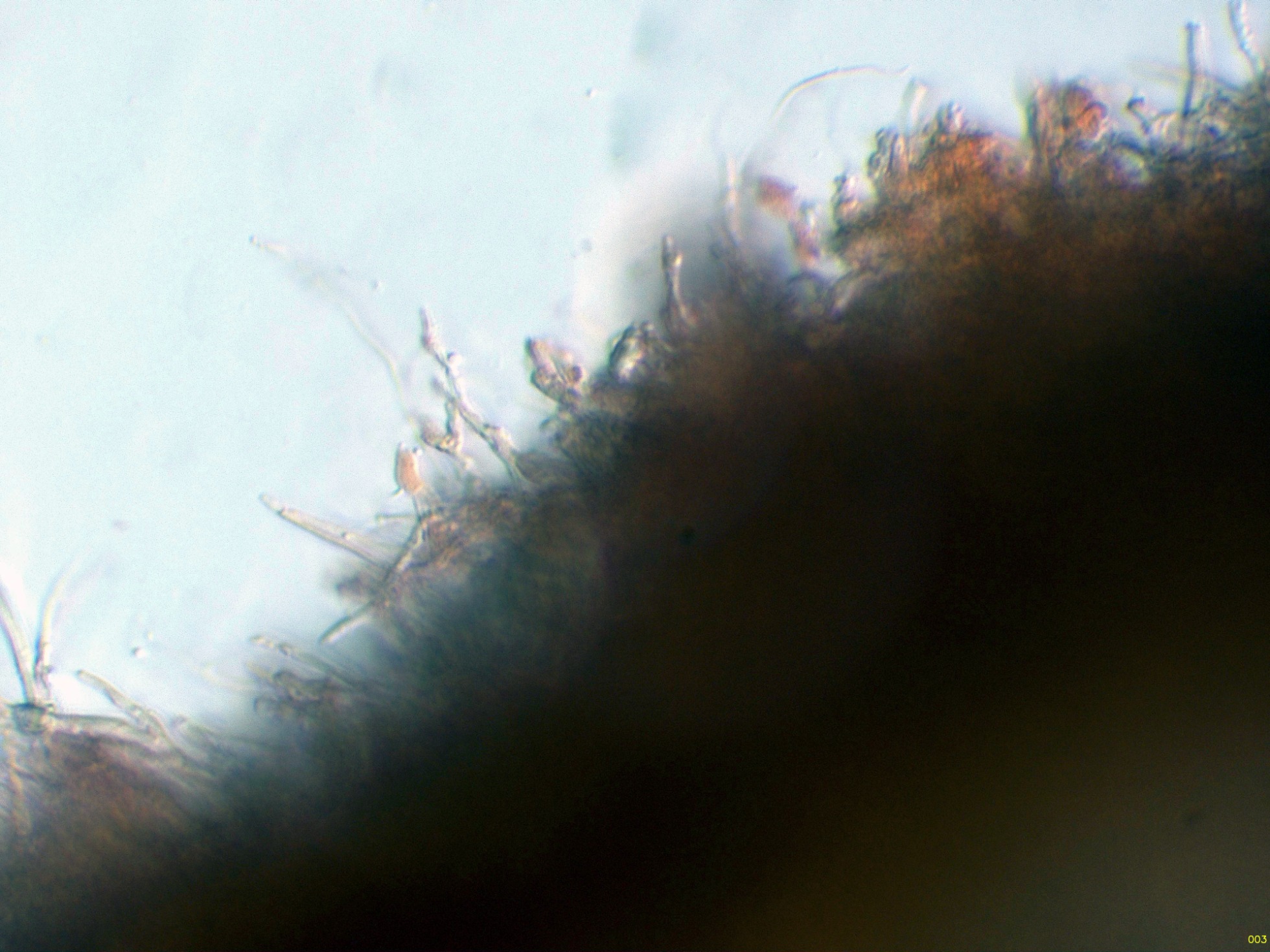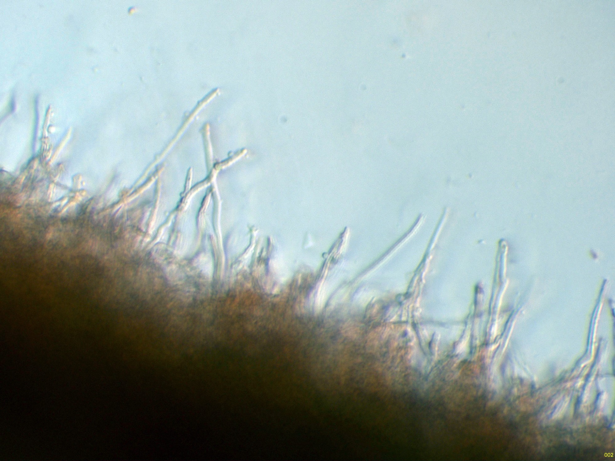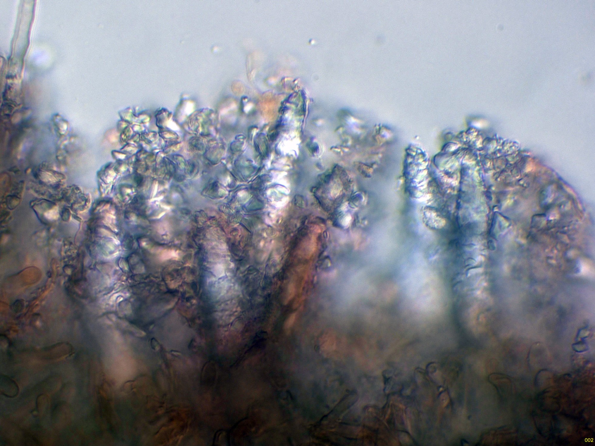 Seguimos con otro Corticial, con grandes cistidios con gruesas cristalizaciones, una más que probable Phlebiopsis, teniendo en cuenta la no reacción frente al KOH, aunque no pude obtener esporas, dejo el tema abierto como la opción más probable, es decir Phlebiopsis cf. papyrina.