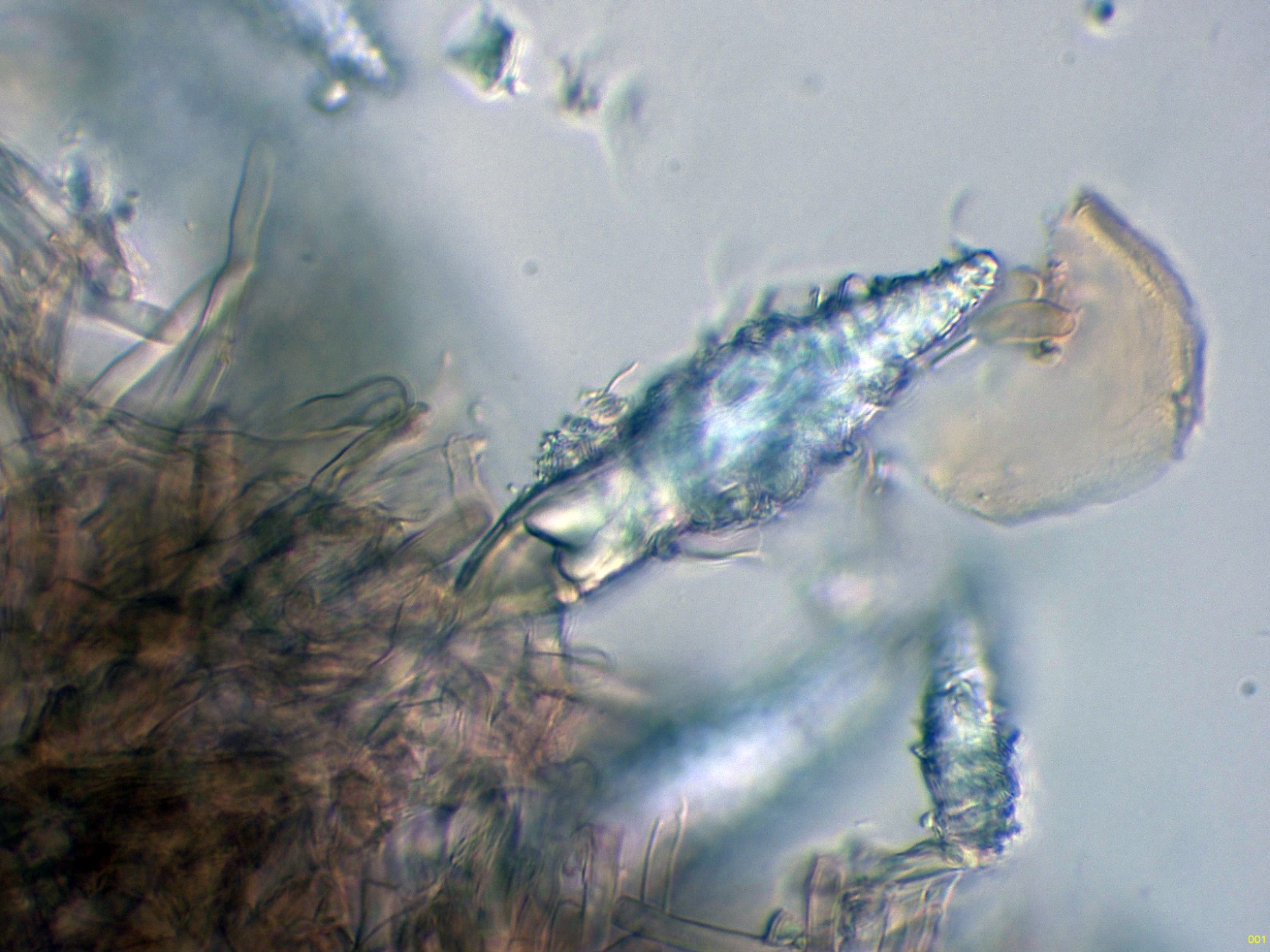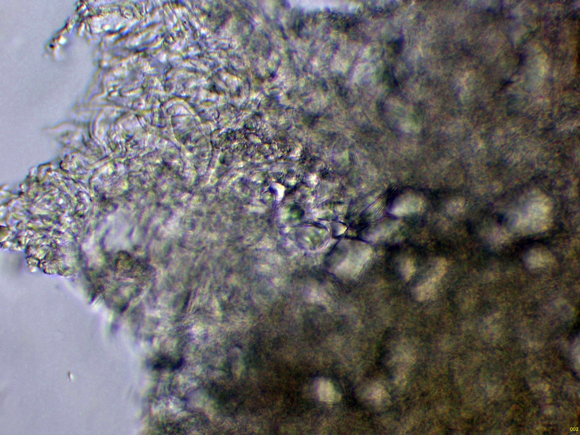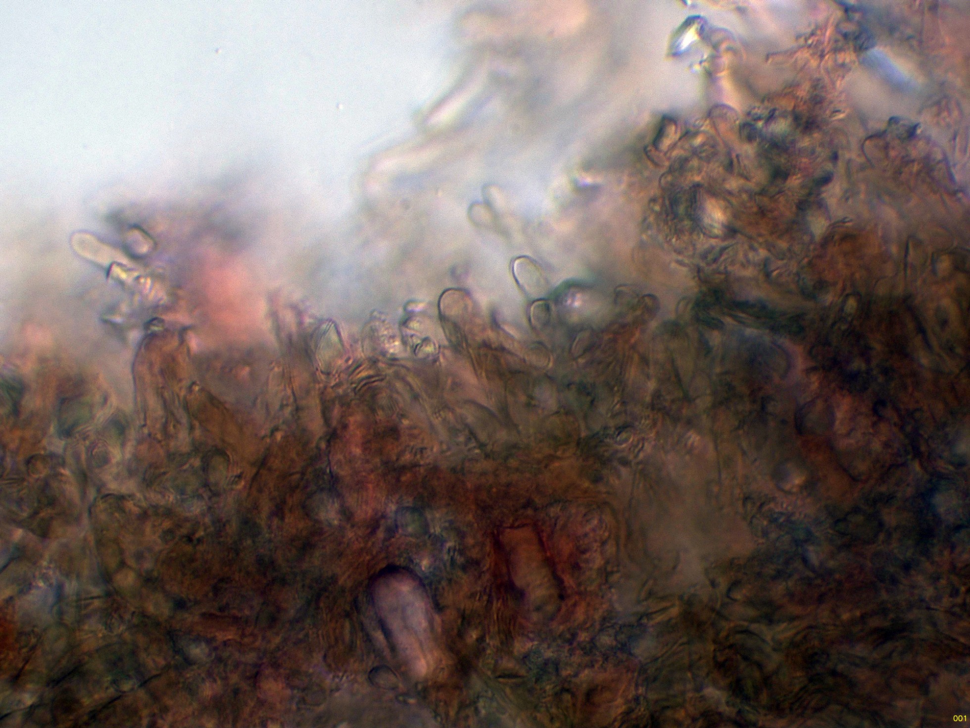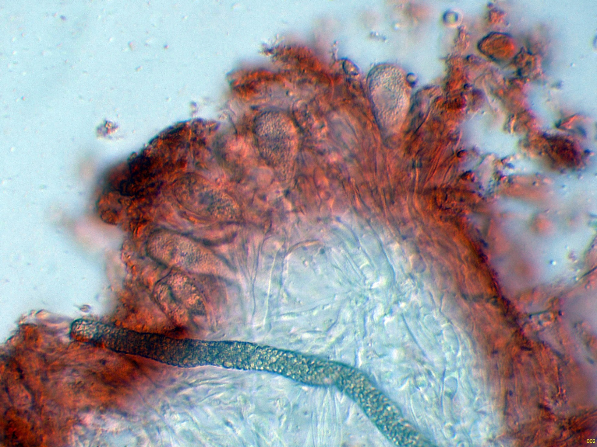 Seguimos con otro Corticial, con grandes cistidios con gruesas cristalizaciones, una más que probable Phlebiopsis, teniendo en cuenta la no reacción frente al KOH, aunque no pude obtener esporas, dejo el tema abierto como la opción más probable, es decir Phlebiopsis cf. papyrina.