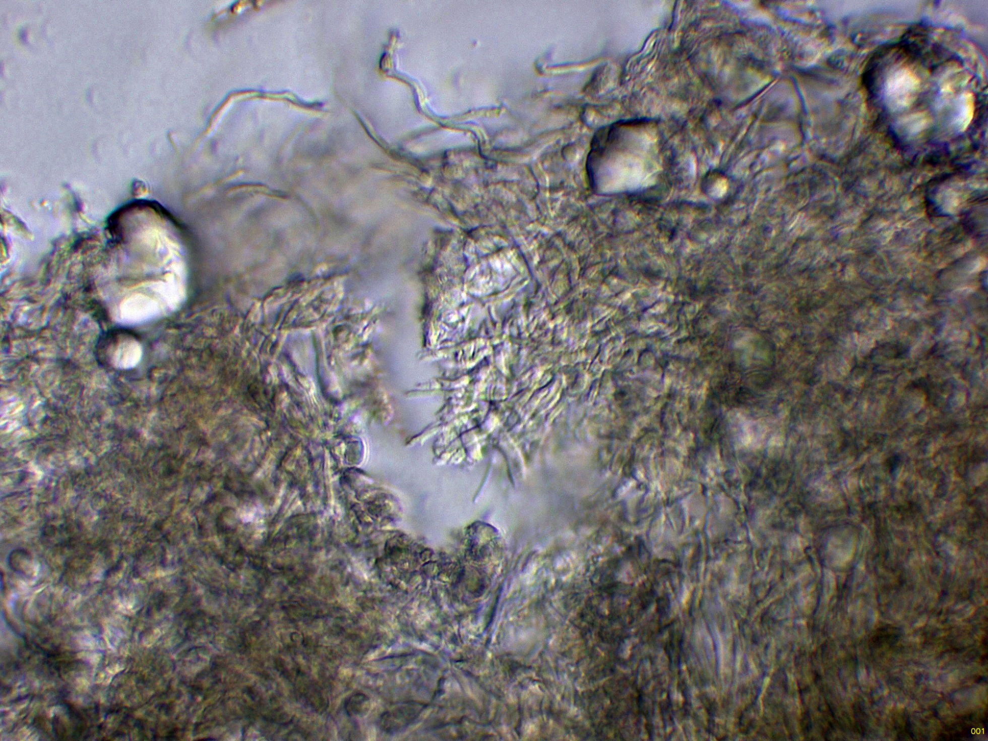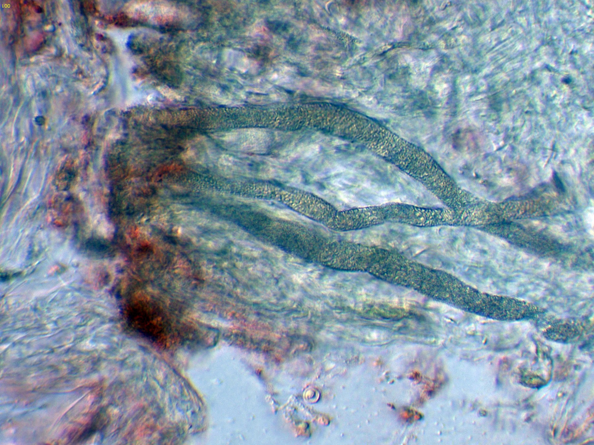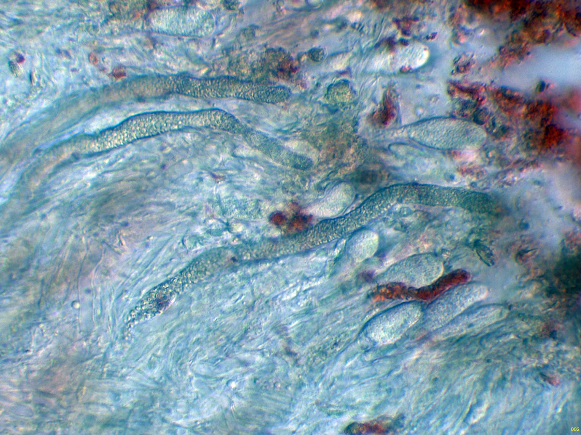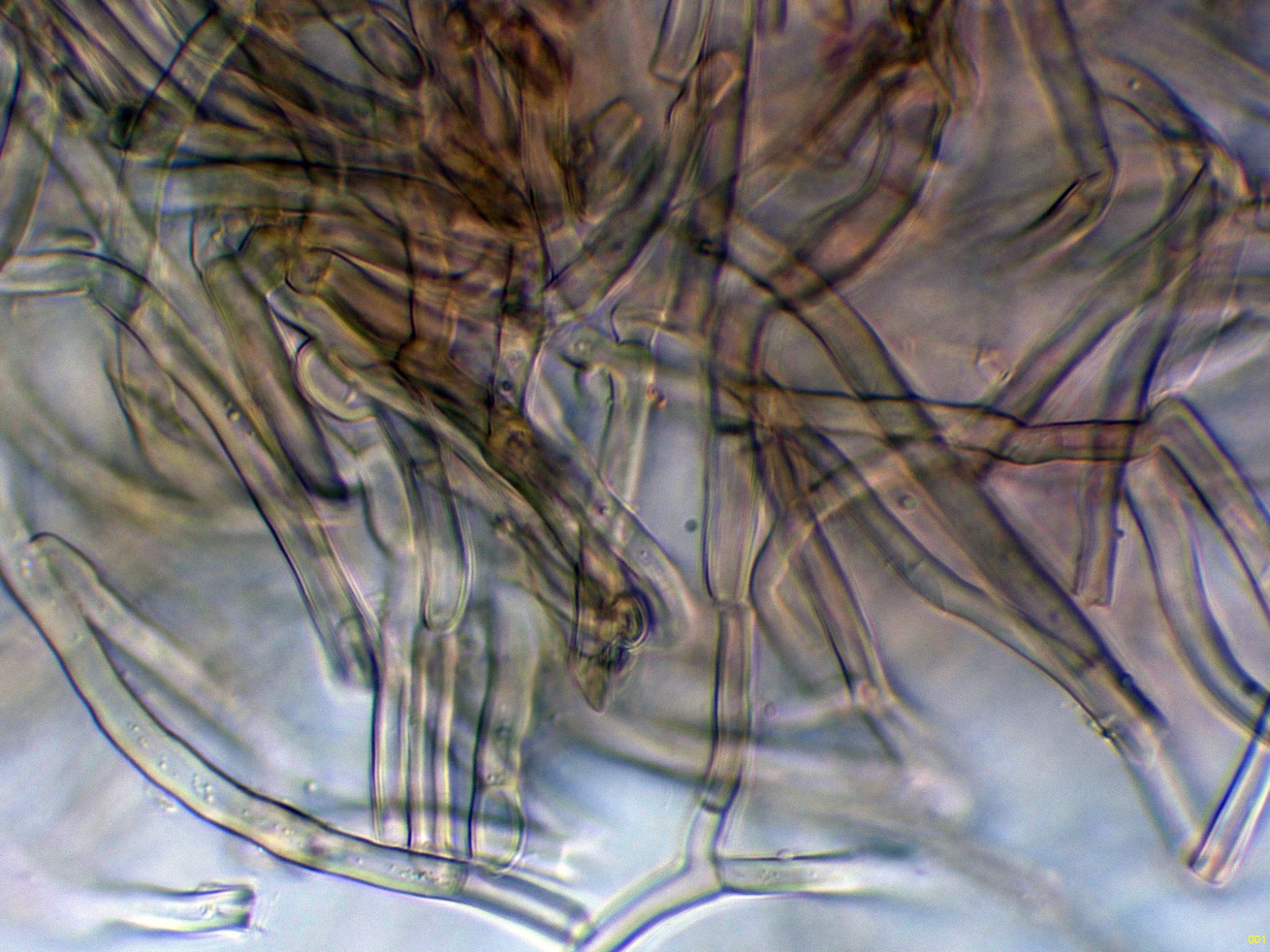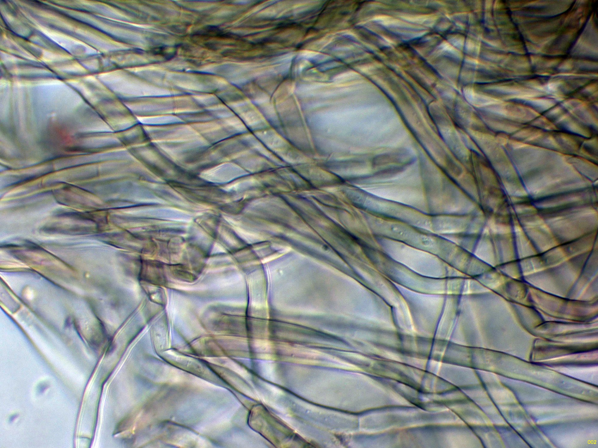 Para terminar, como no hay dos sin tres, otro Corticial, este muy común con hifas muy compactas y ramificadas, esporas esféricas y amiloides, aunque el que aparece en el Continente Americano, según varios autores lo deberíamos llamar como Scytinostroma portentosum, personalmente no le encuentro ninguna diferencia con el Scytinostroma hemidichophyticum Europeo.