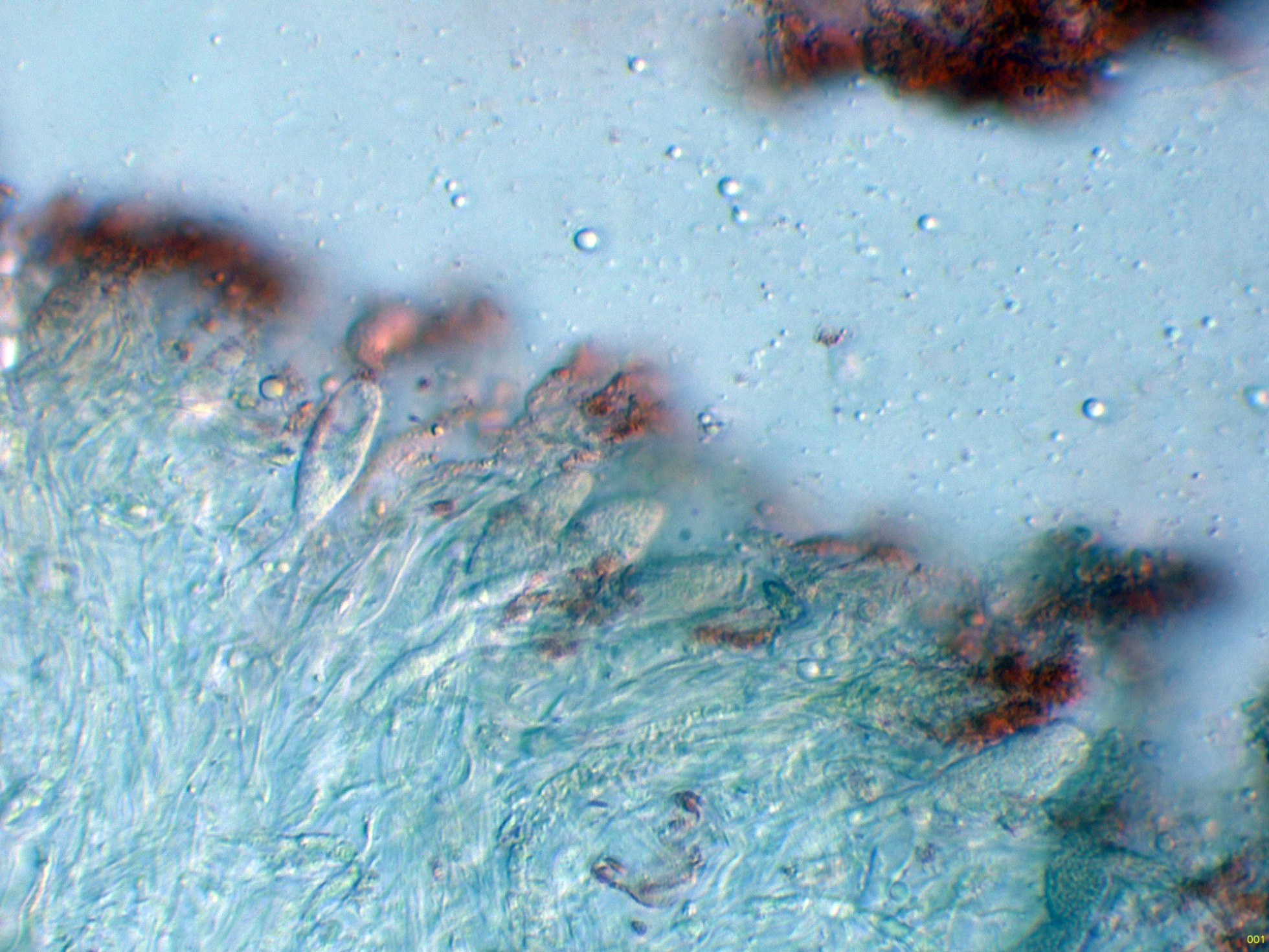 Junto a estos gloeocistidios podemos encontrar los basidios: