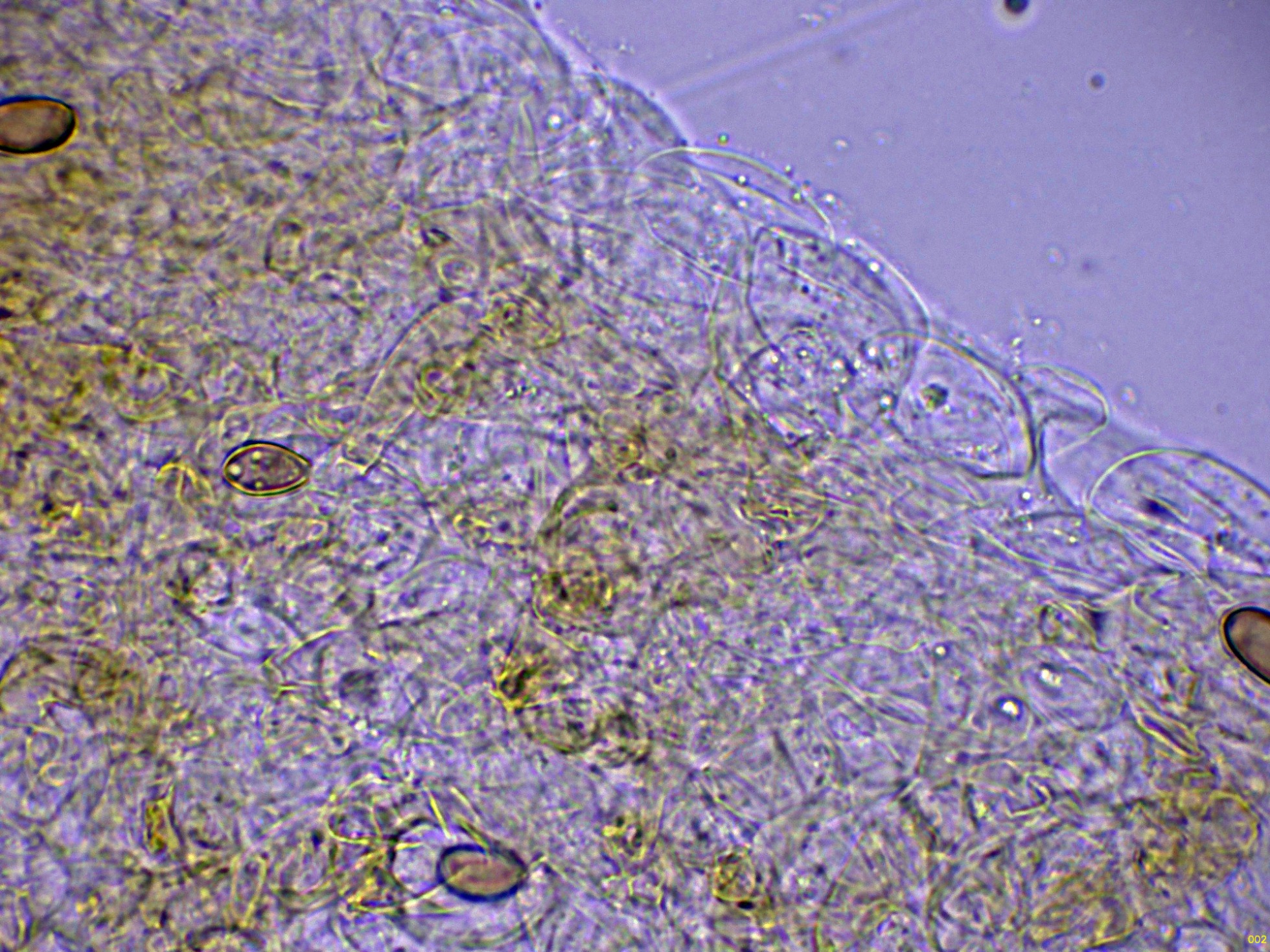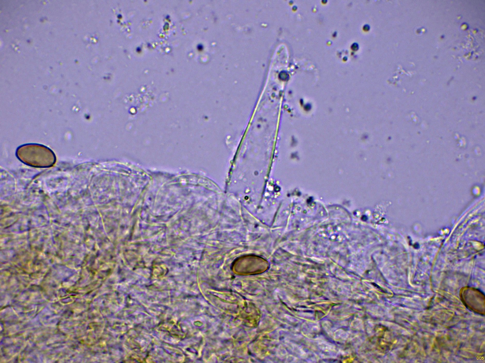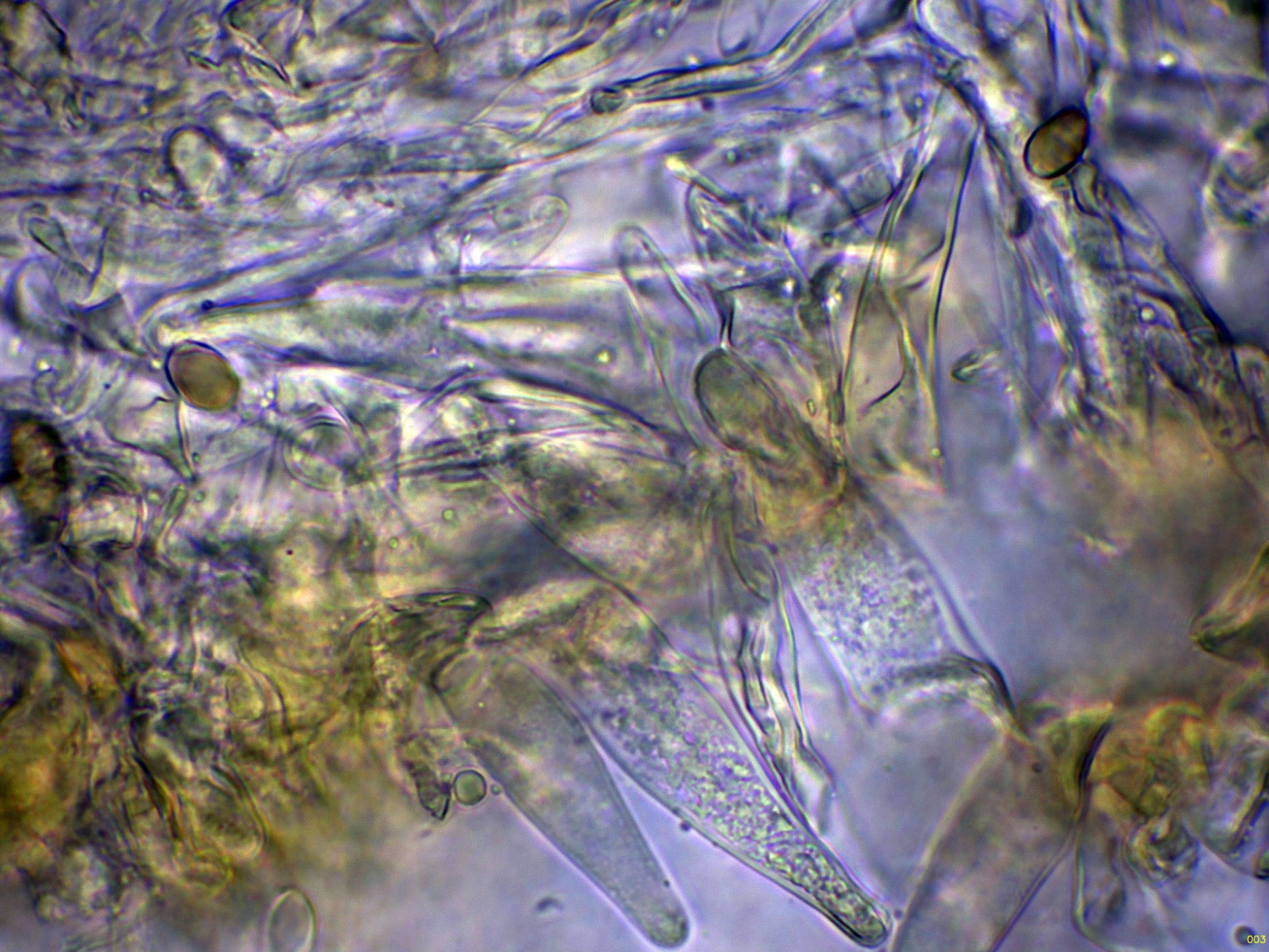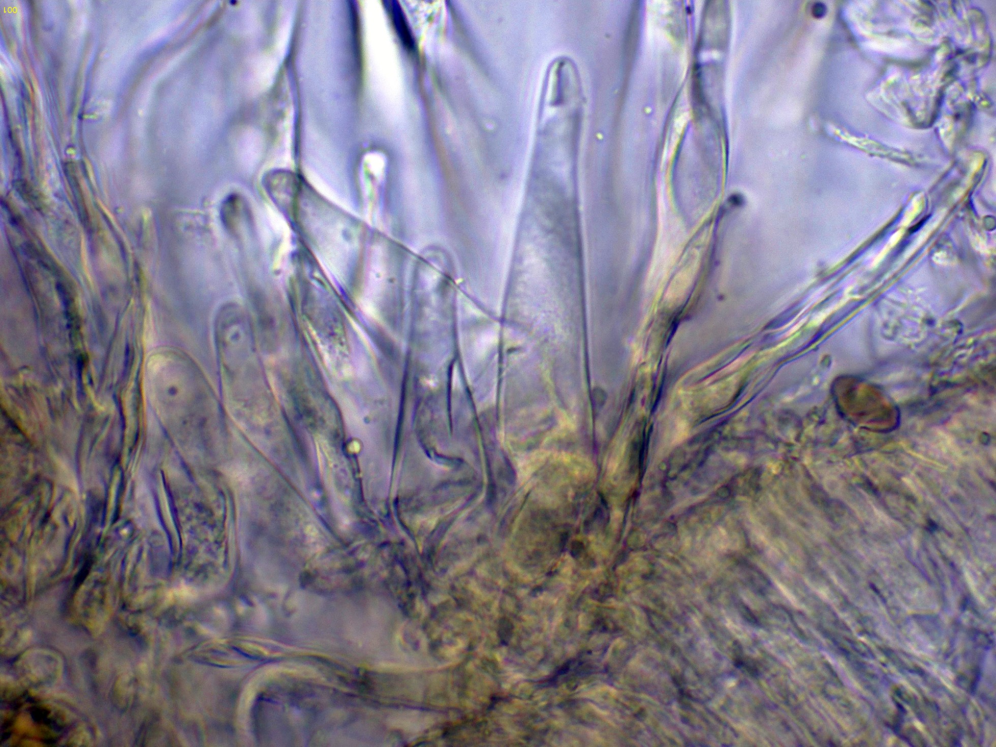 Pileocistidios dispersos sobresaliendo por encima de esta capa de hifas celulósica.