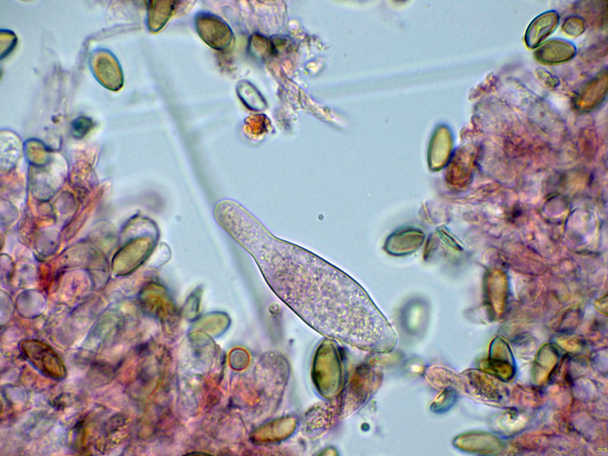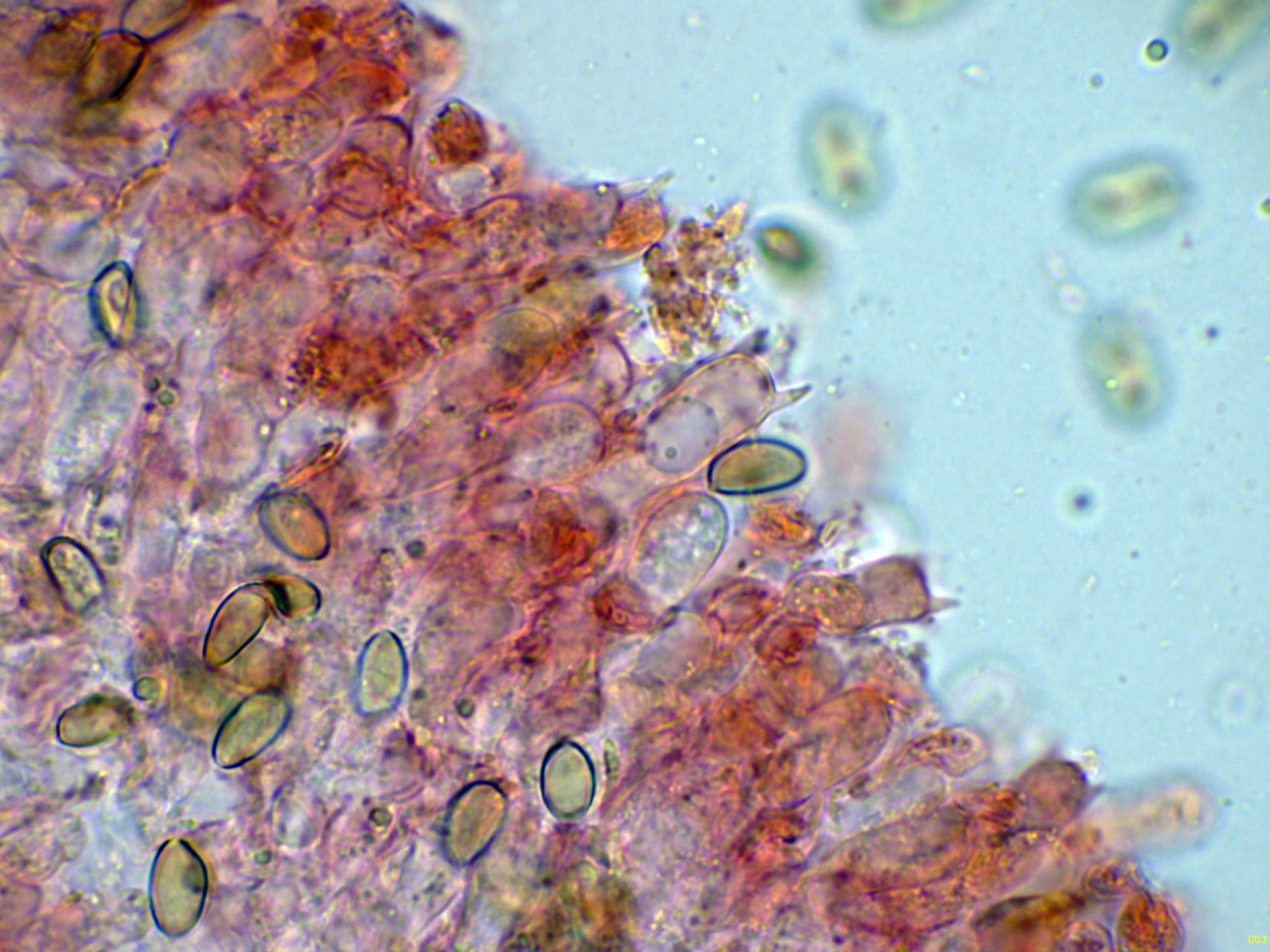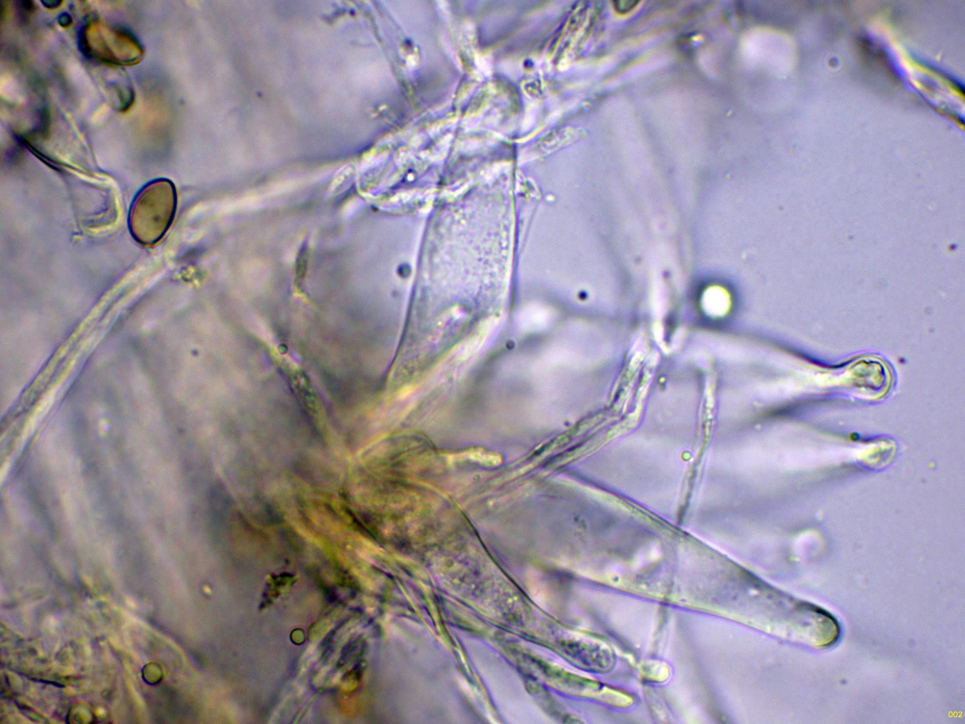 Pileocistidios dispersos sobresaliendo por encima de esta capa de hifas celulósica.