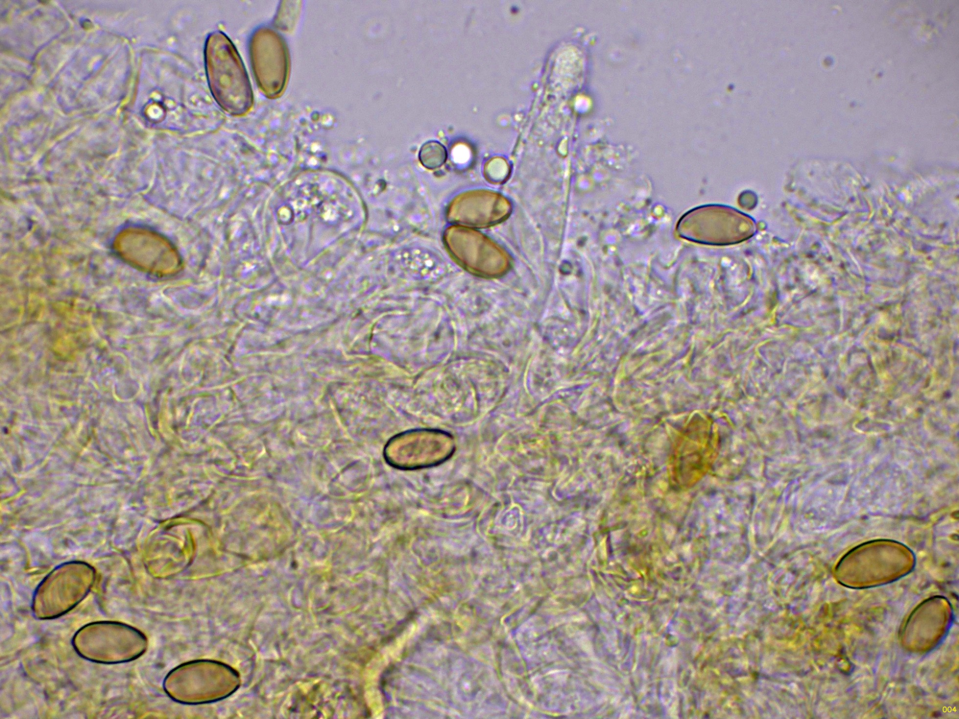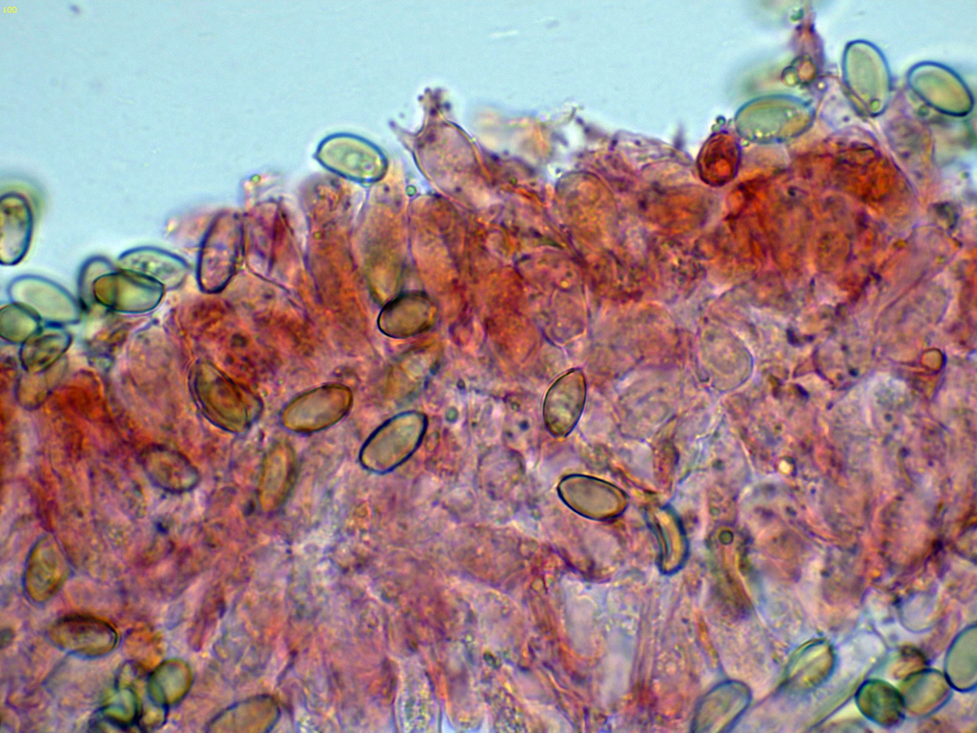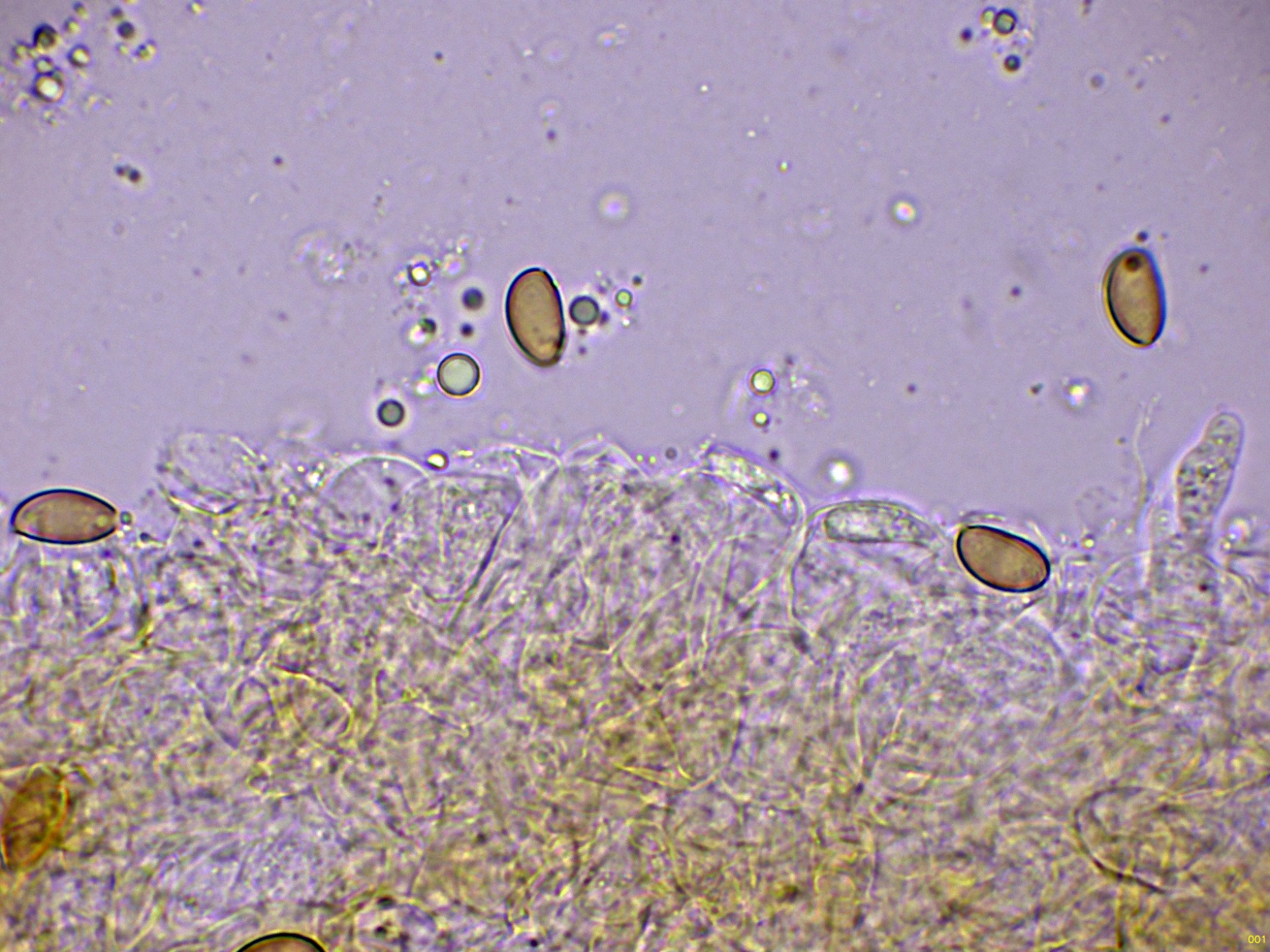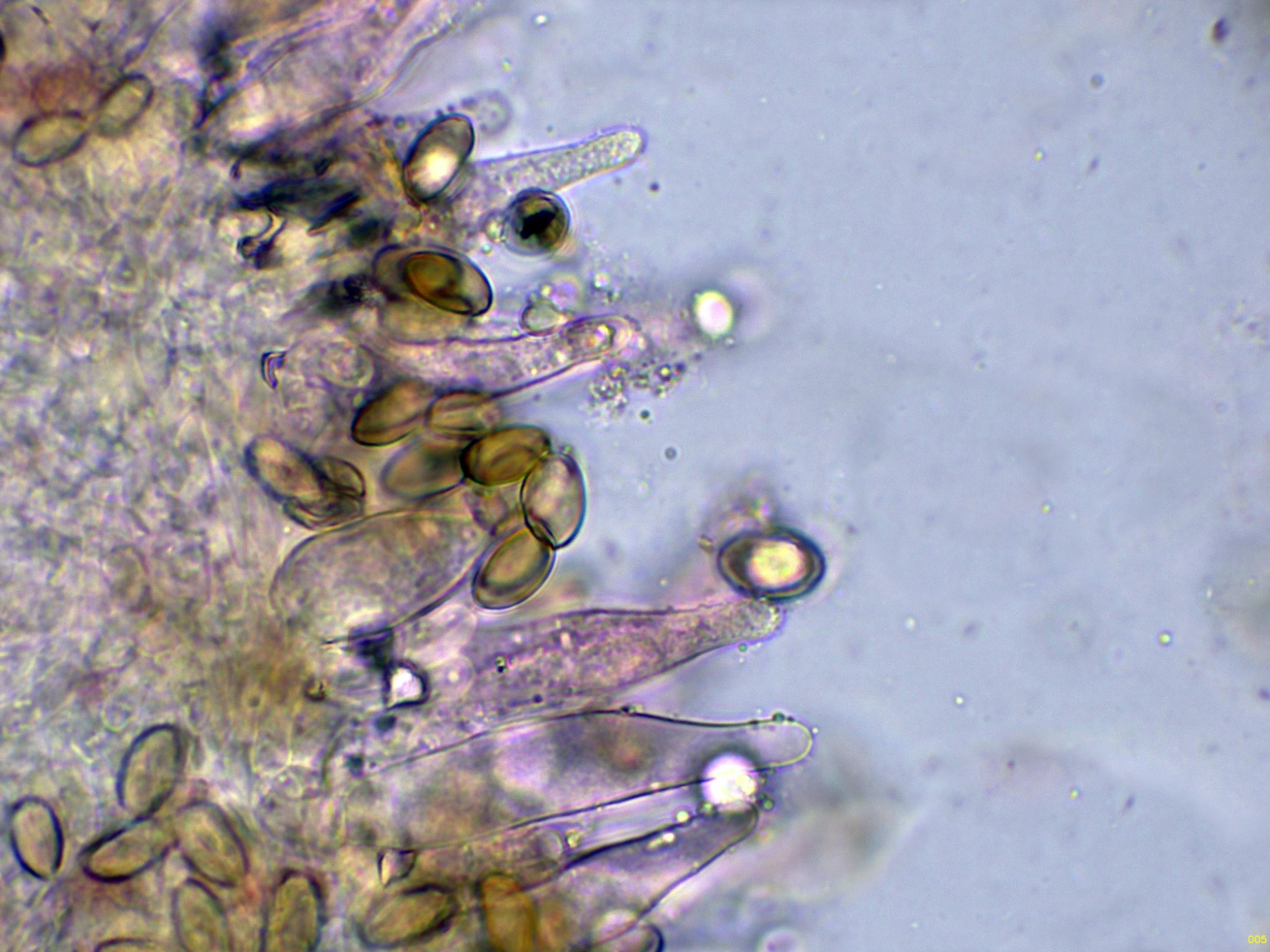 Pileocistidios dispersos sobresaliendo por encima de esta capa de hifas celulósica.