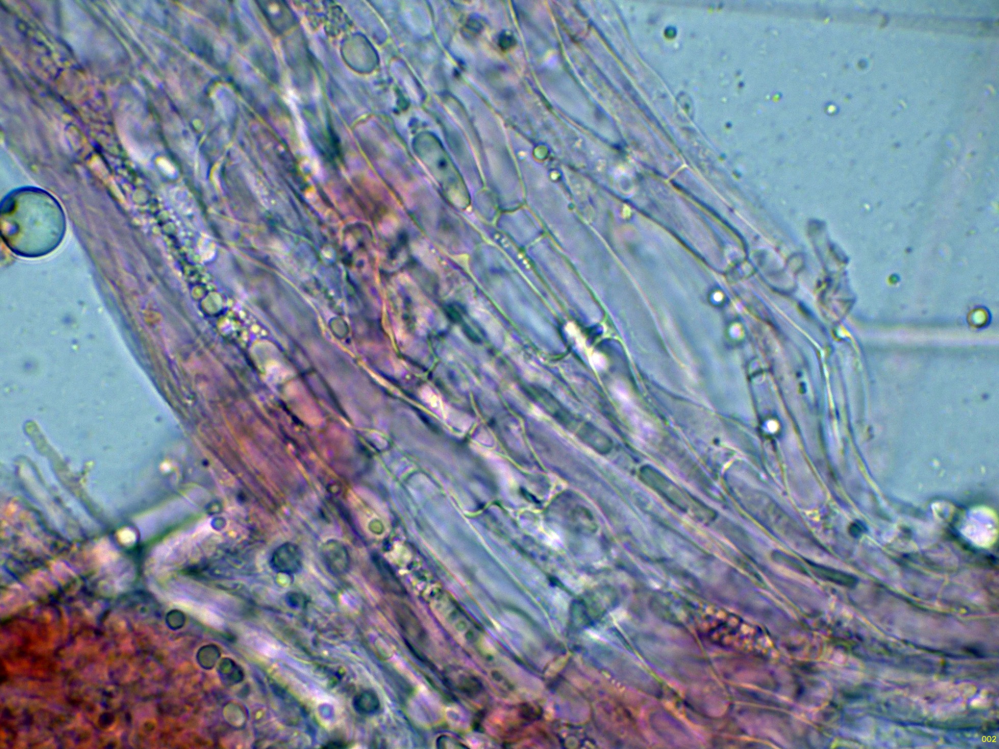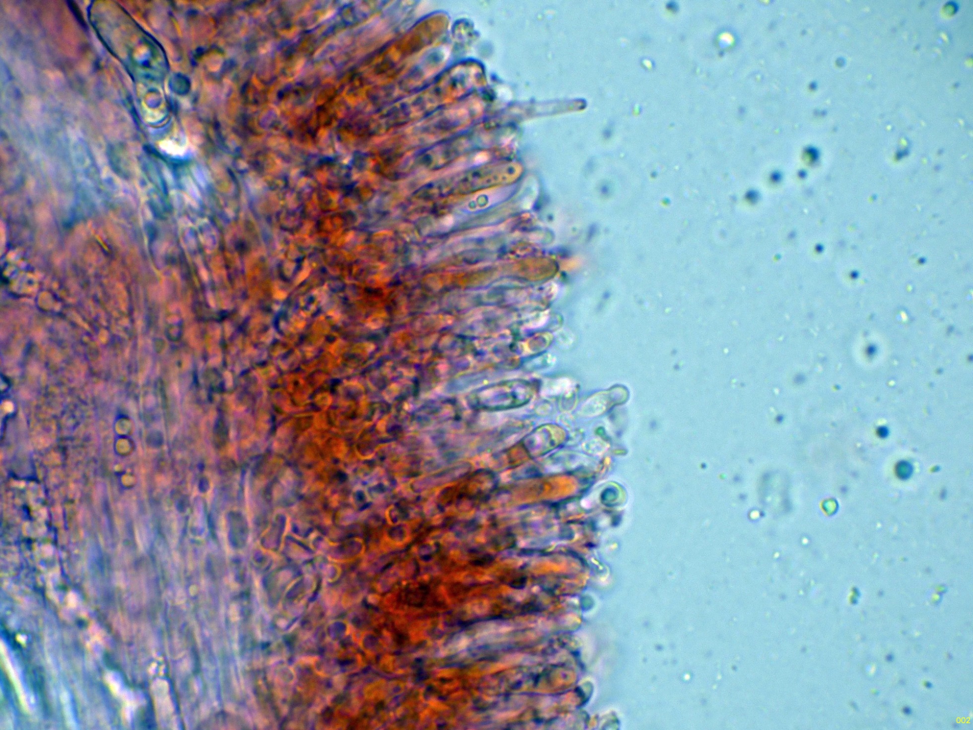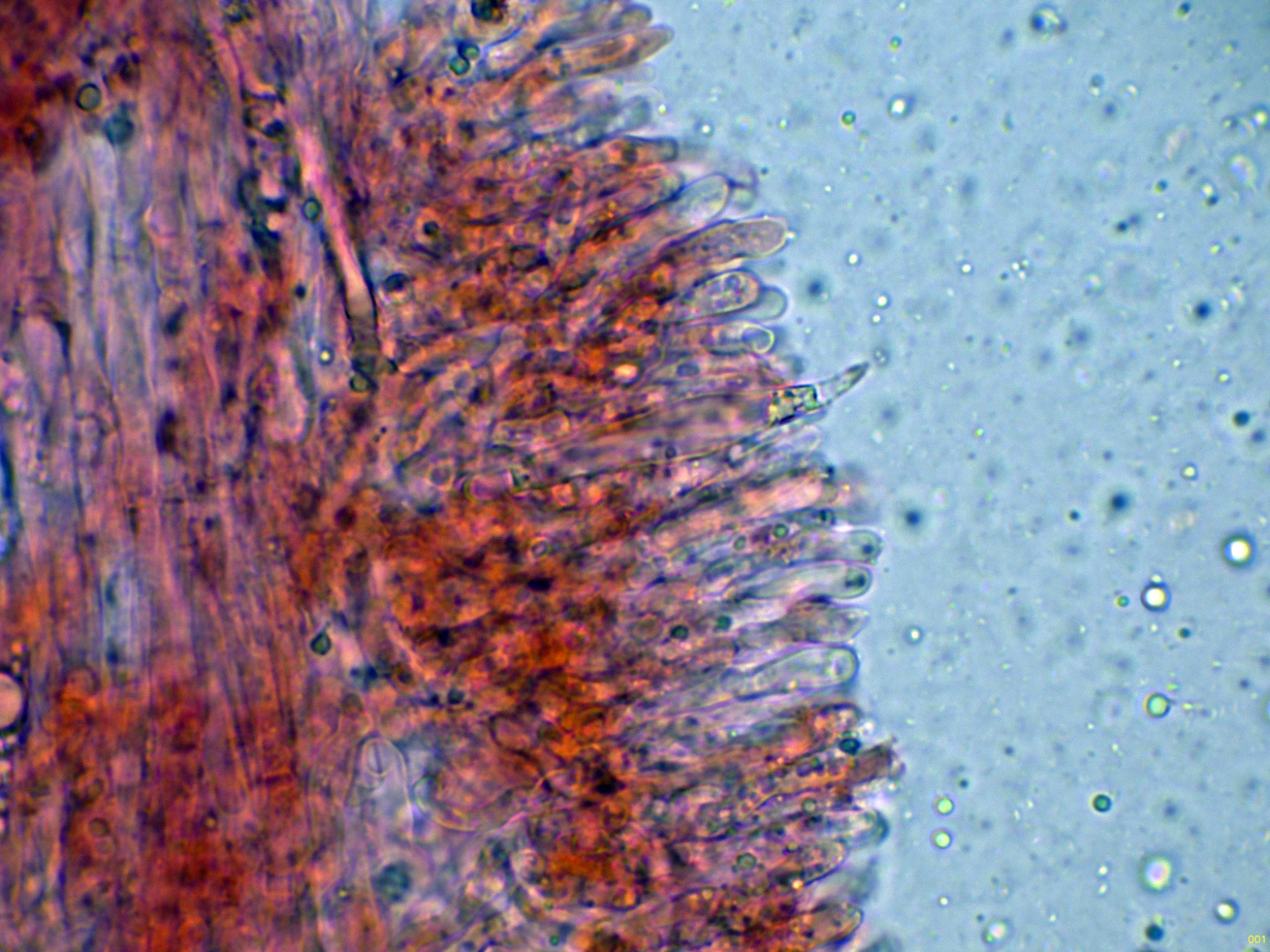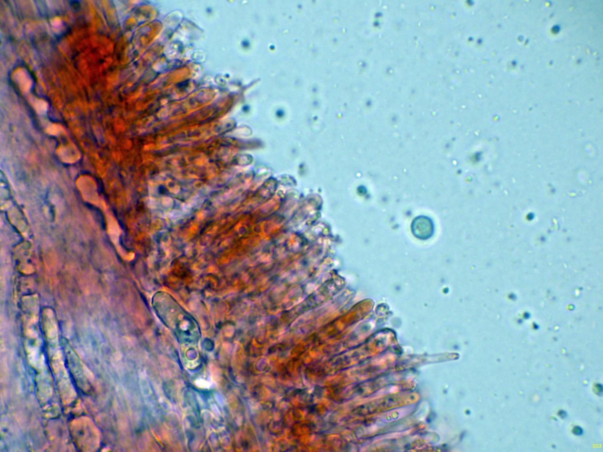 En el himenio algunas hifas terminales lanceoladas a modo de cistidios que sobresalen por encima del nivel de los basidios.