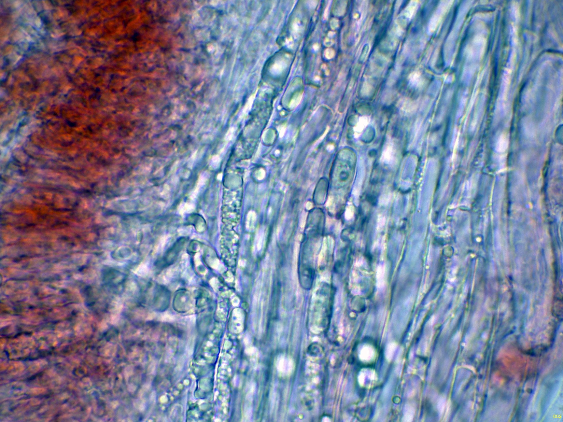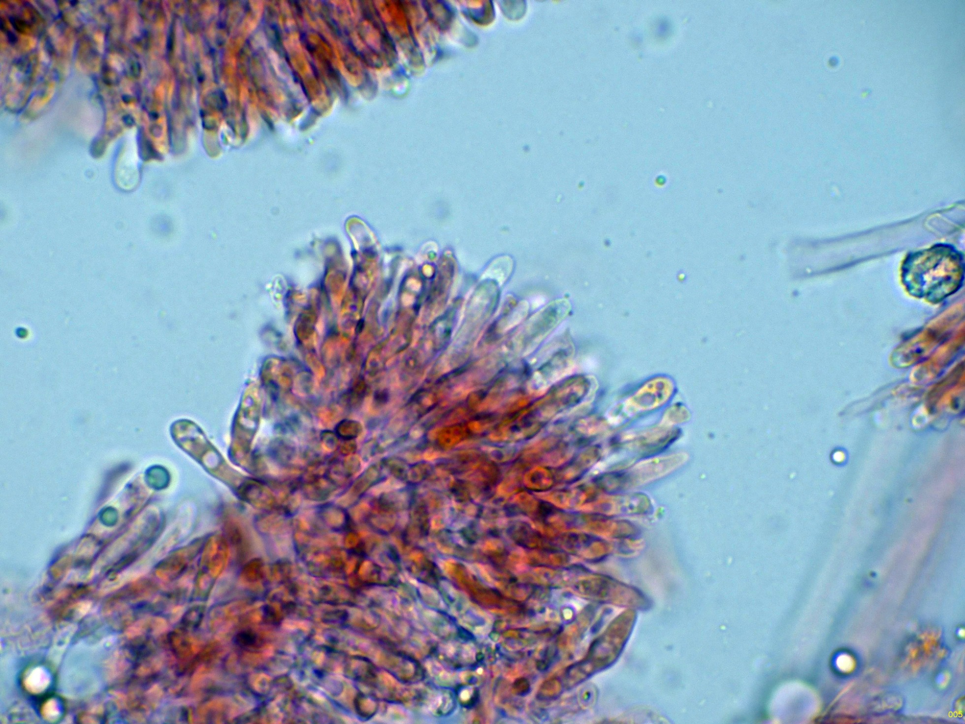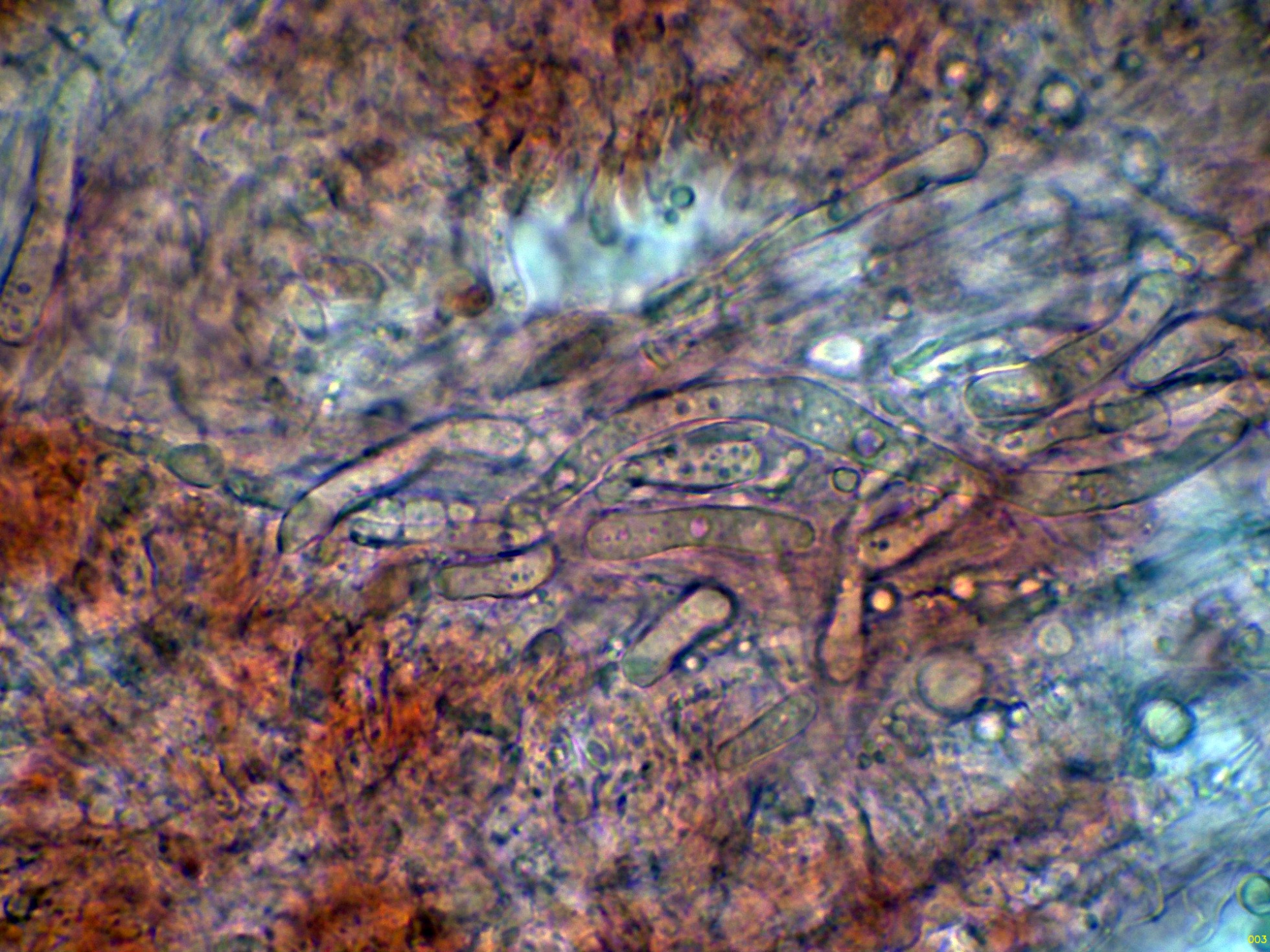 En el himenio algunas hifas terminales lanceoladas a modo de cistidios que sobresalen por encima del nivel de los basidios.