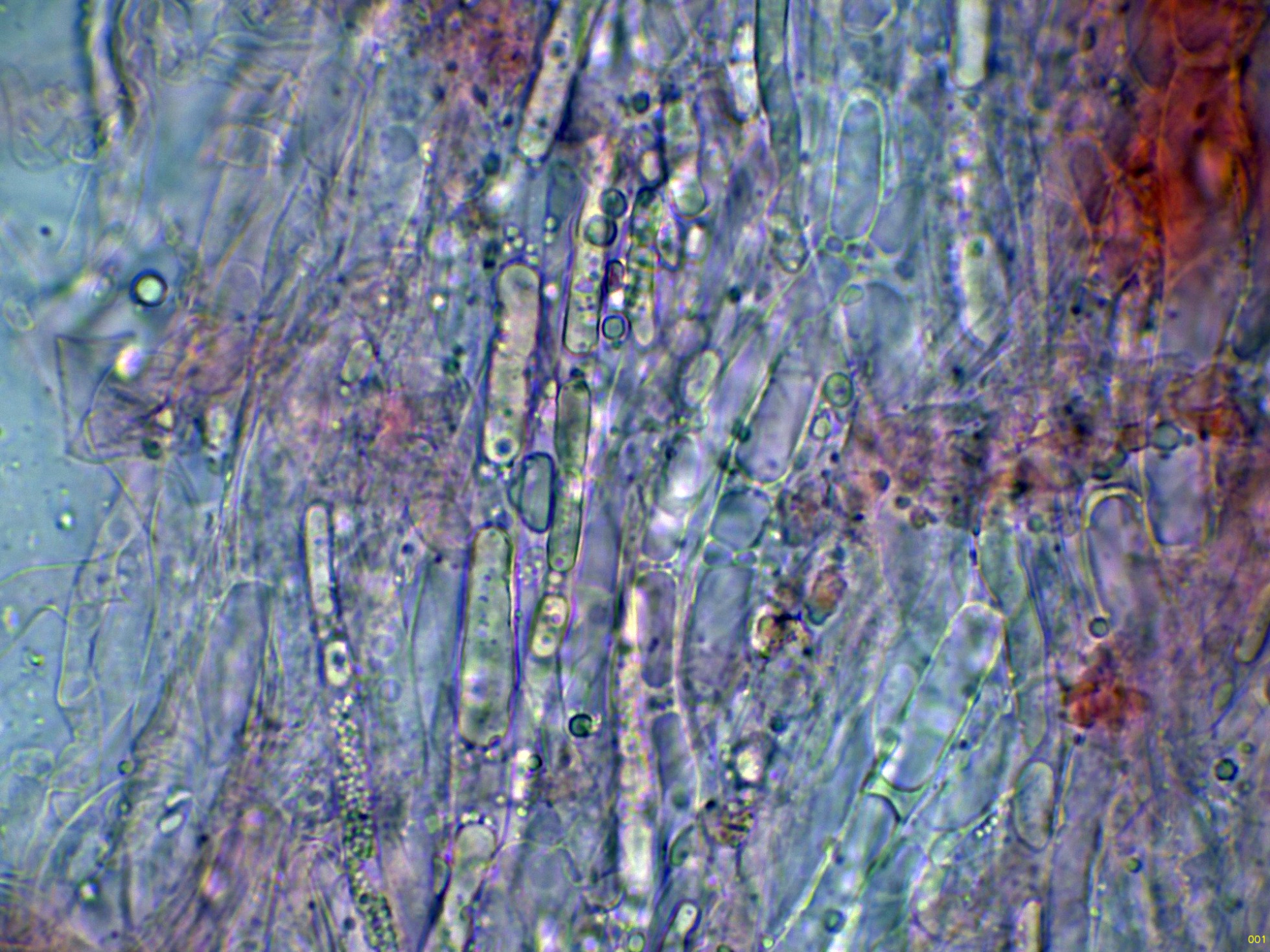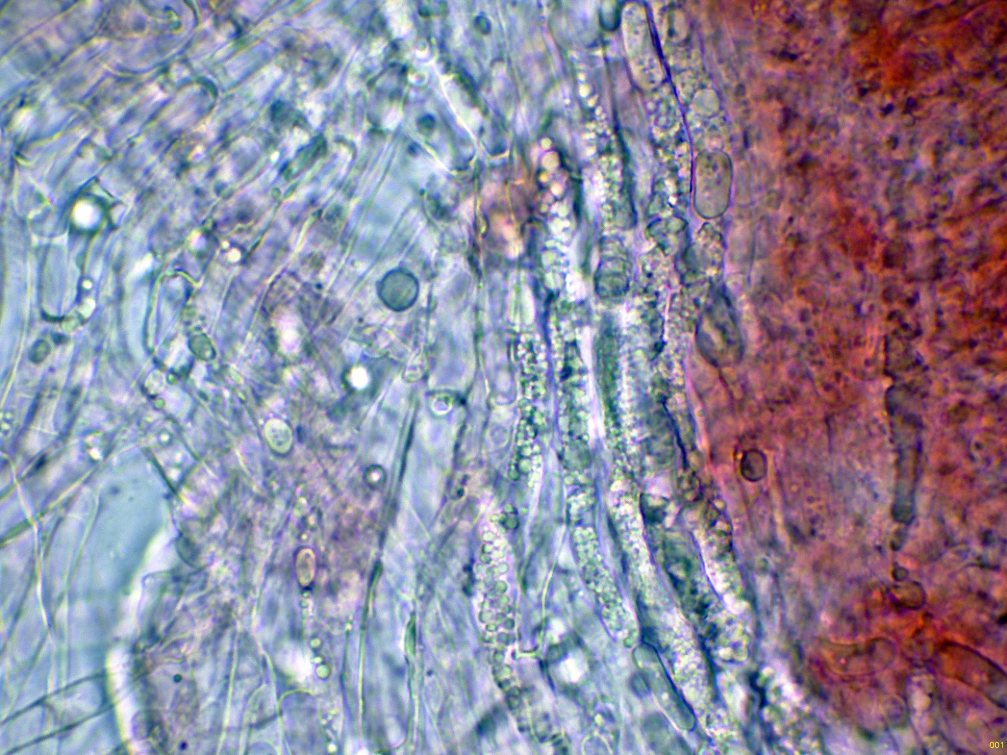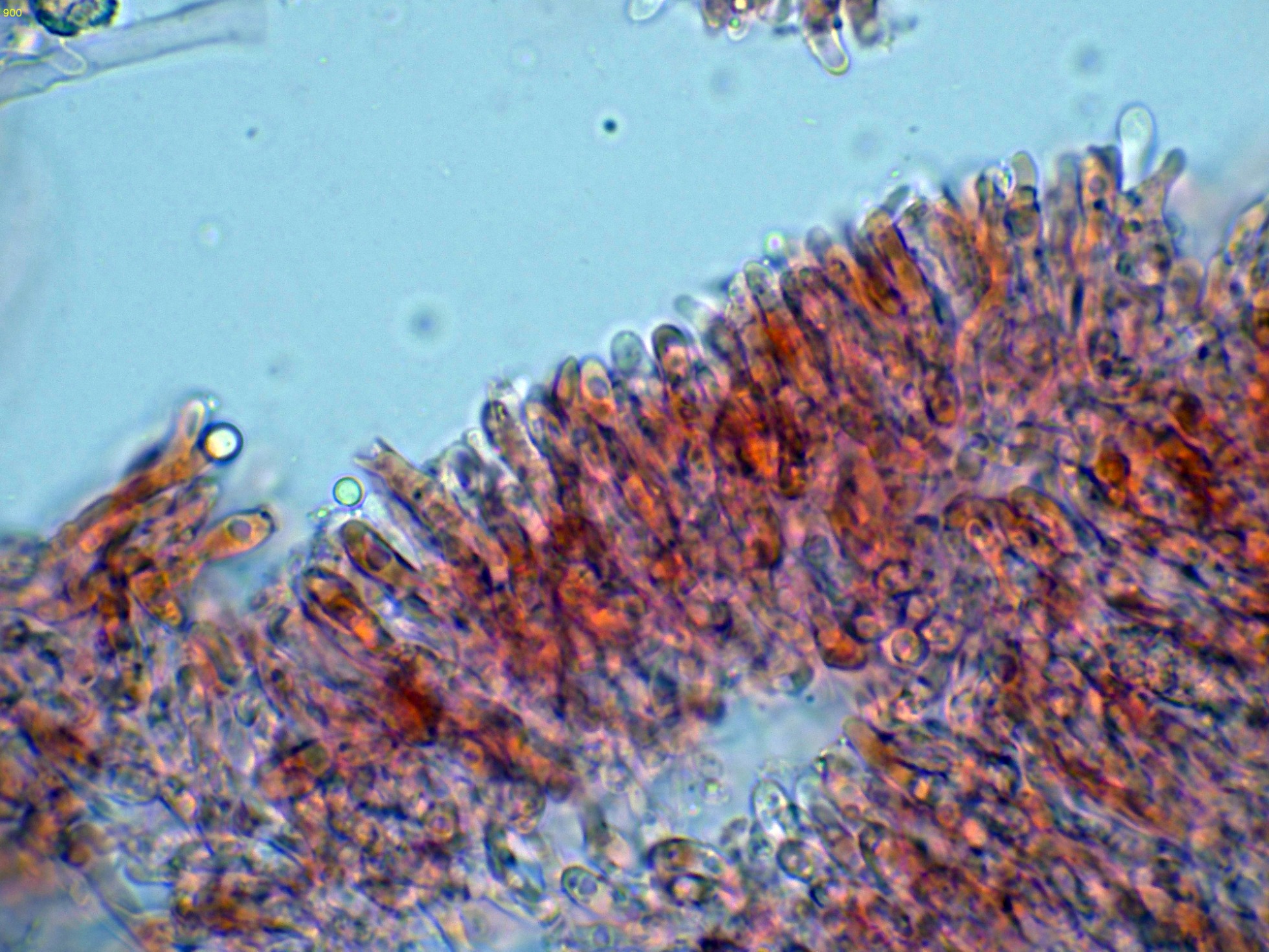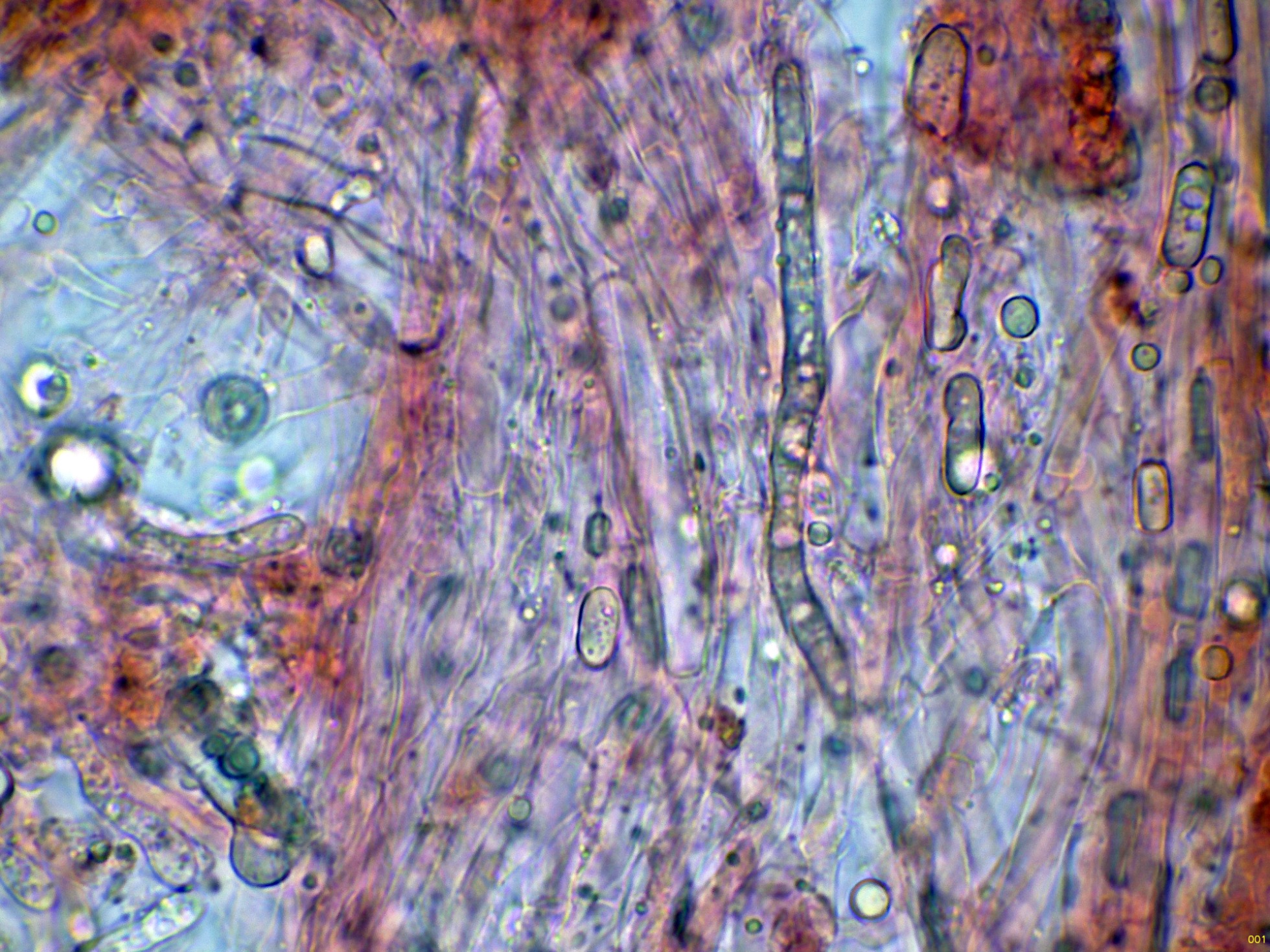 En el himenio algunas hifas terminales lanceoladas a modo de cistidios que sobresalen por encima del nivel de los basidios.