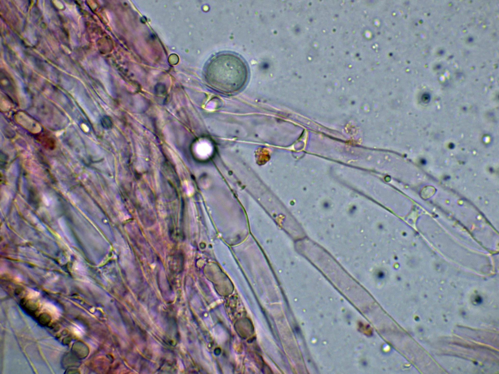 Numerosas hifas oleíferas inmersas en el contexto a modo de gloeocistidios: