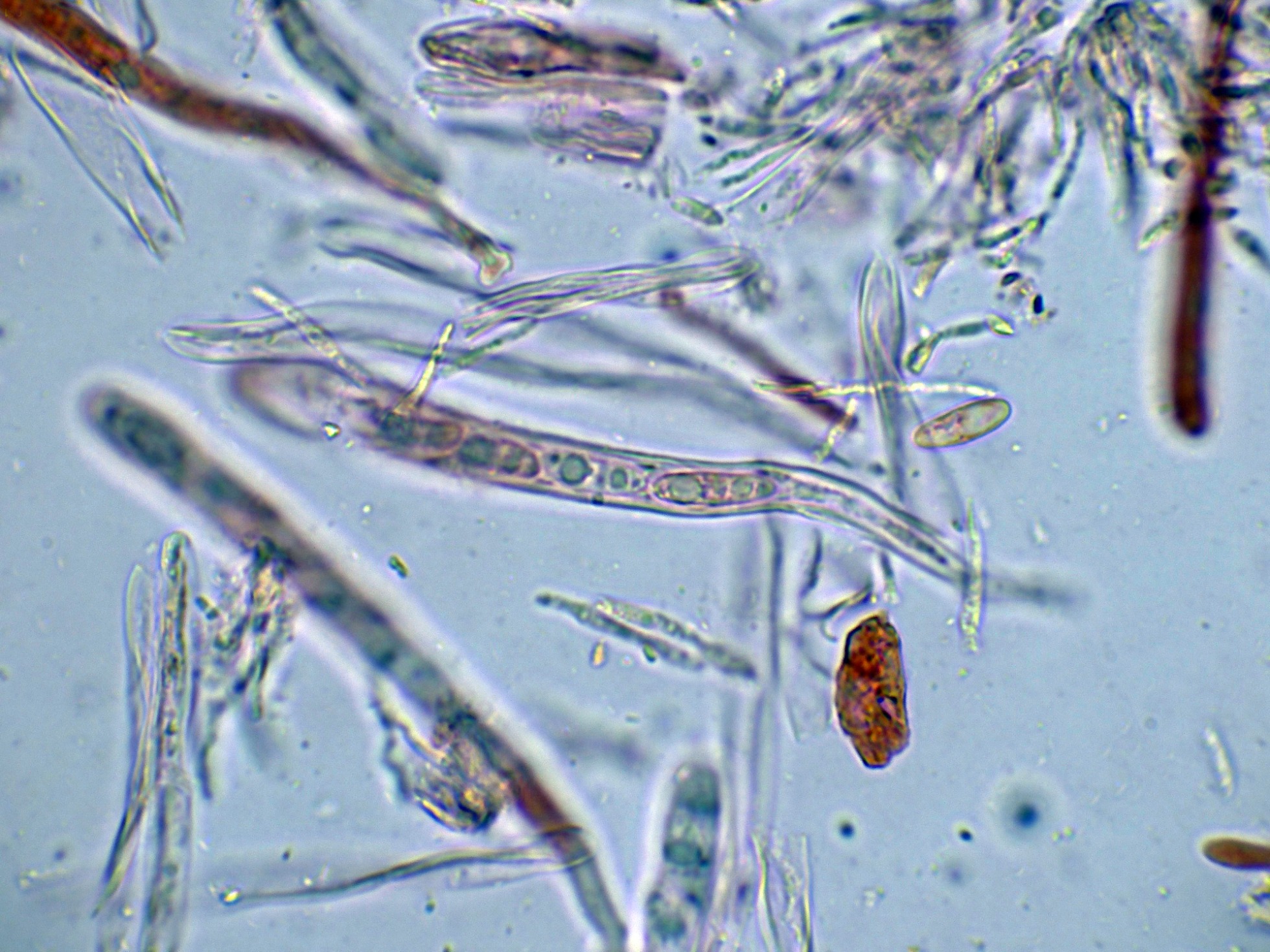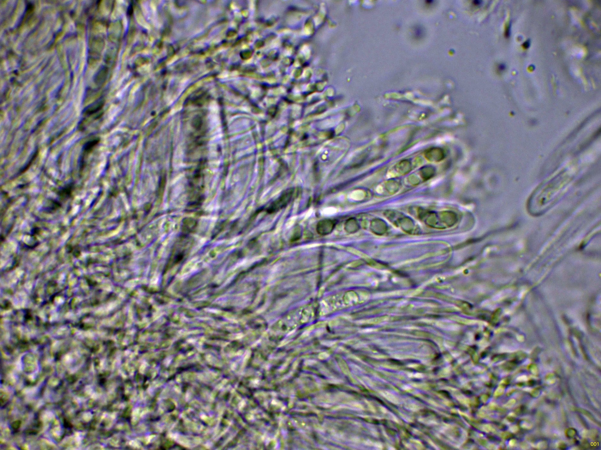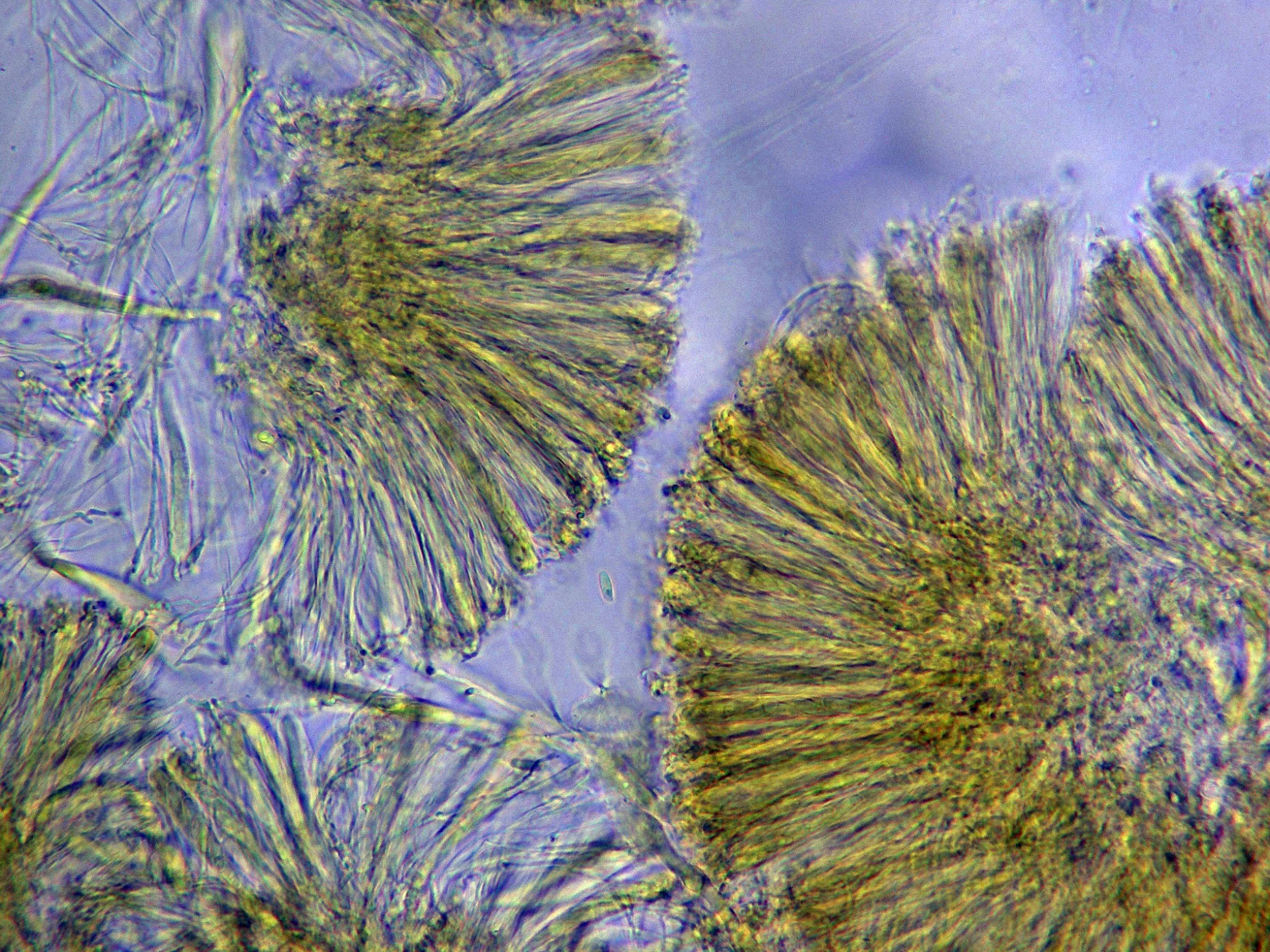 Unos ascomas rehidratados en vista lateral a 20 aumentos: