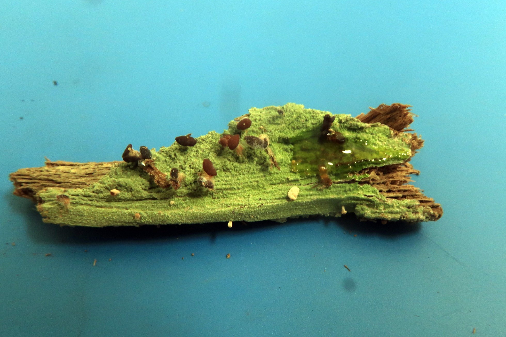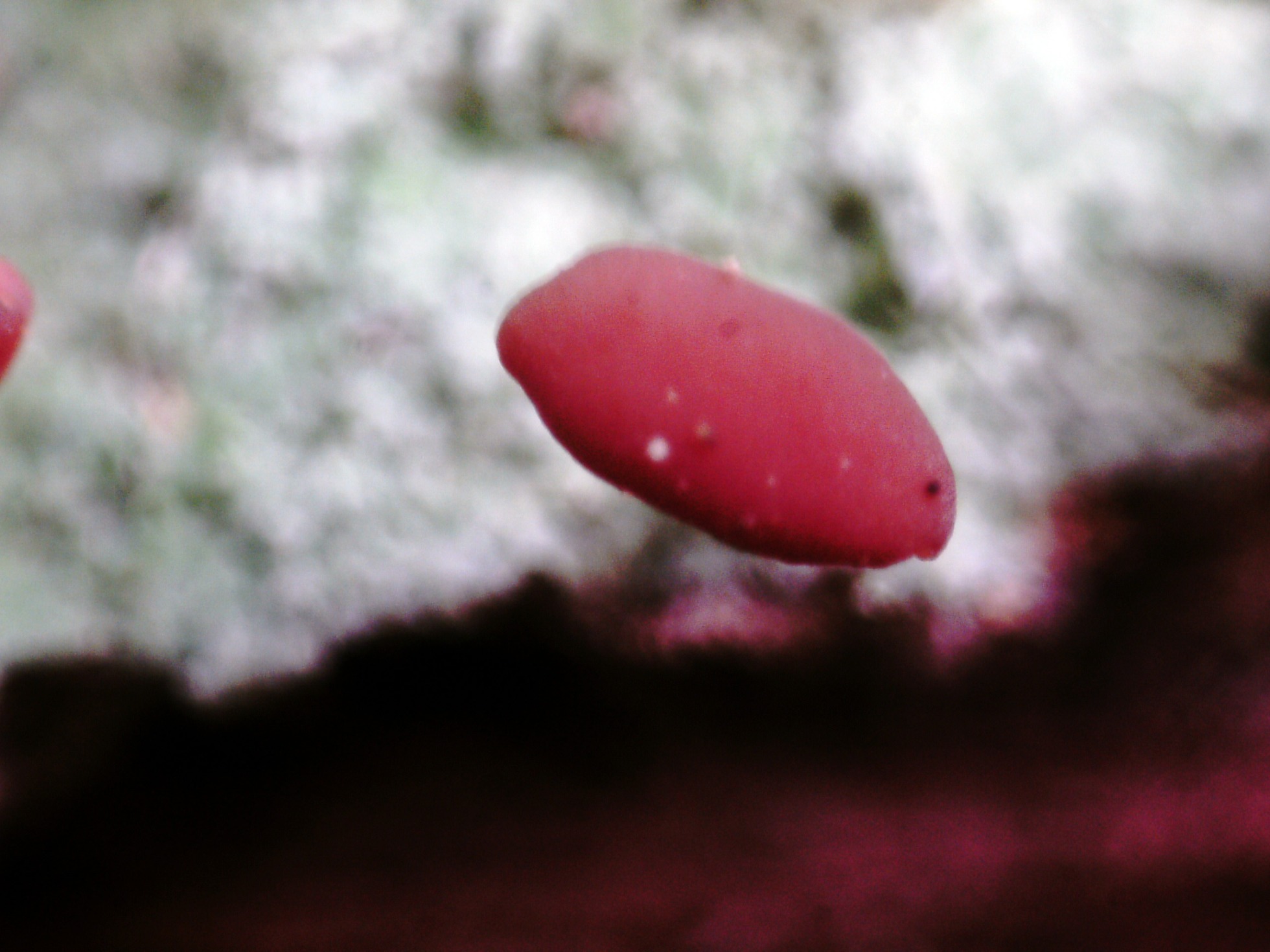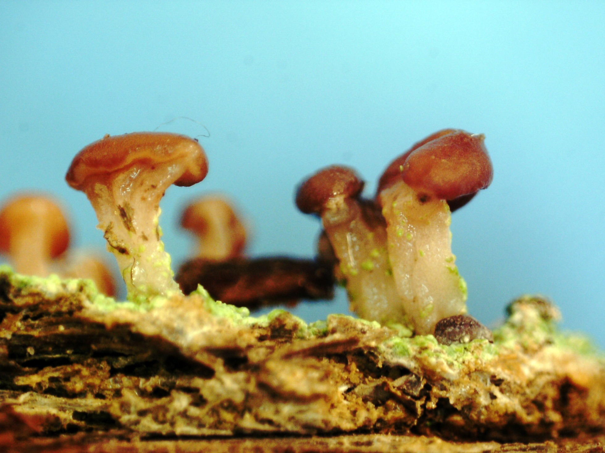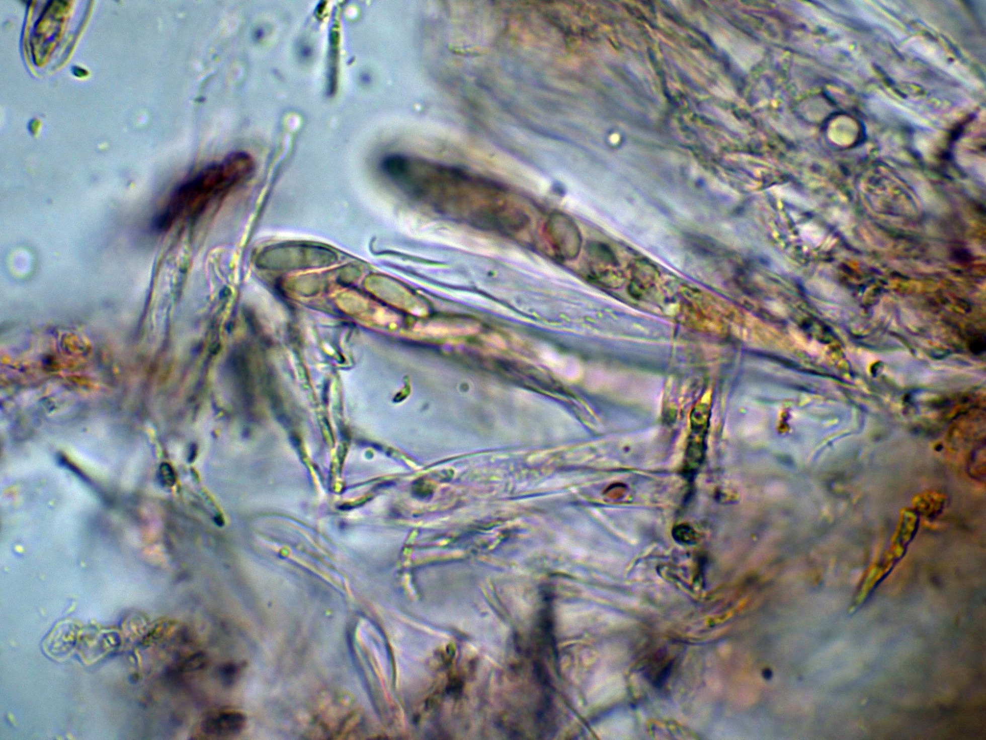 Unos ascomas rehidratados en vista lateral a 20 aumentos: