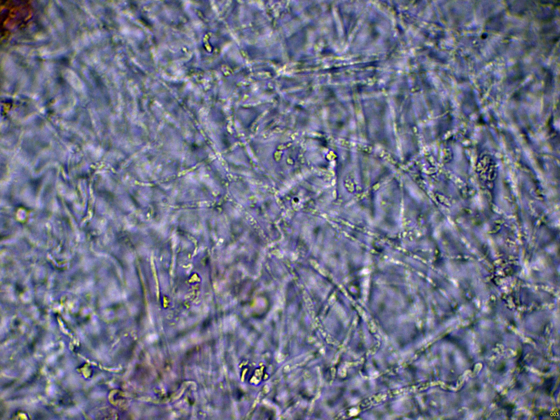 El himenio en solución de KOH a 400 aumentos, sin ninguna reacción aparente: