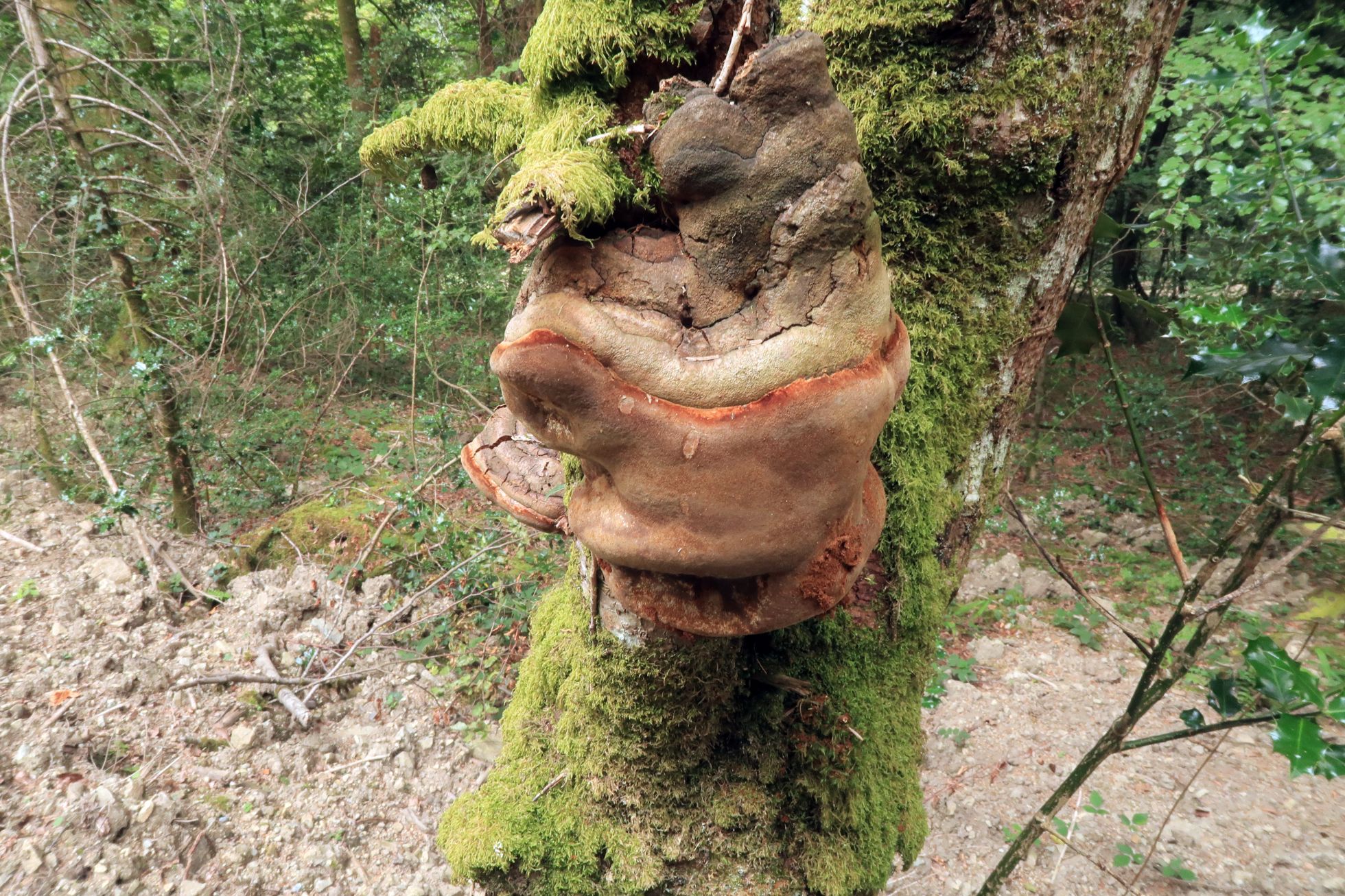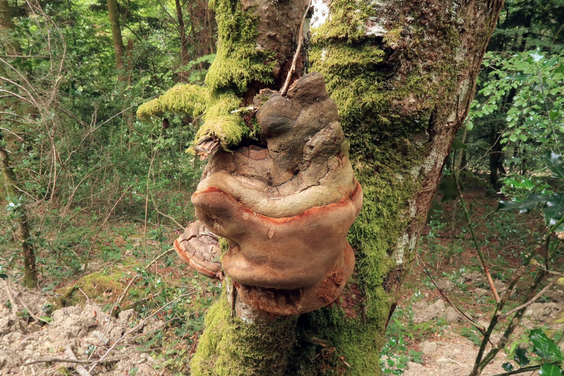 Un Phellinus exclusivo de abetos, fotografiado el 17 de agosto en la Col de Marie-Blanche, brotando sobre un tronco de Abies alba.