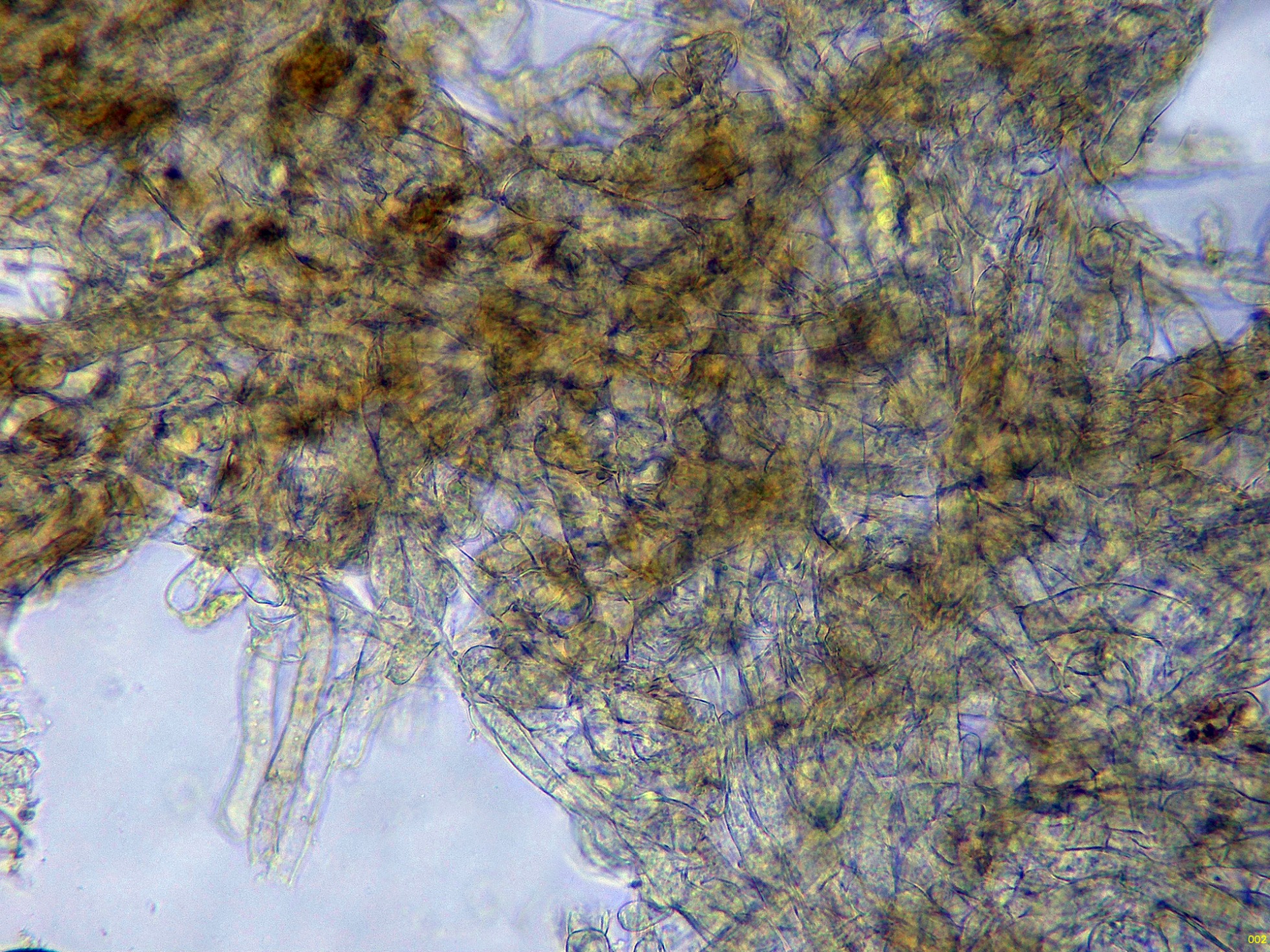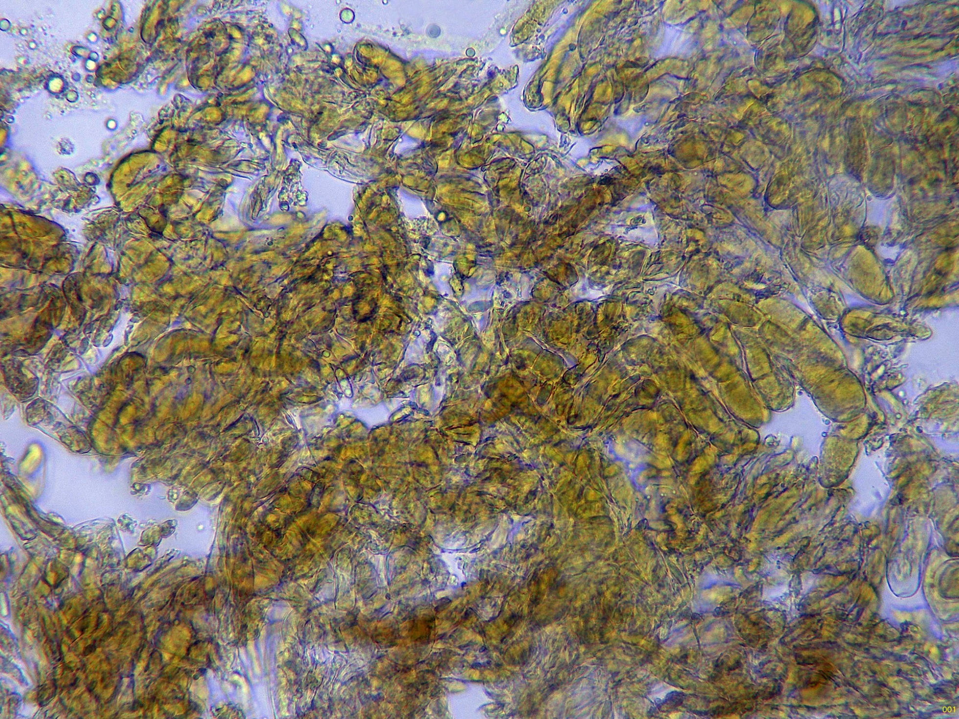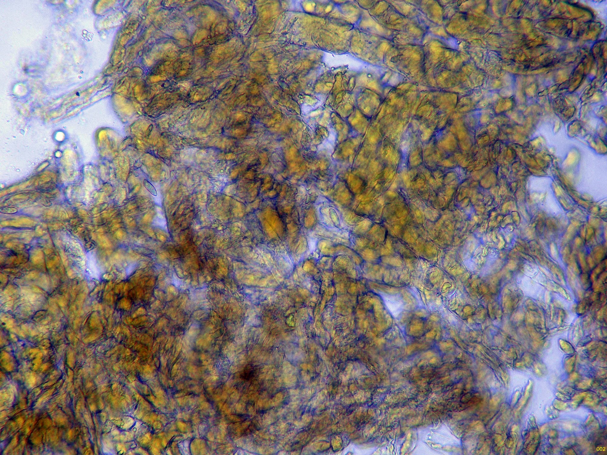 Las hifas de la suprapellis en agua a 400 aumentos, con pigmento intracelular ocráceo:
