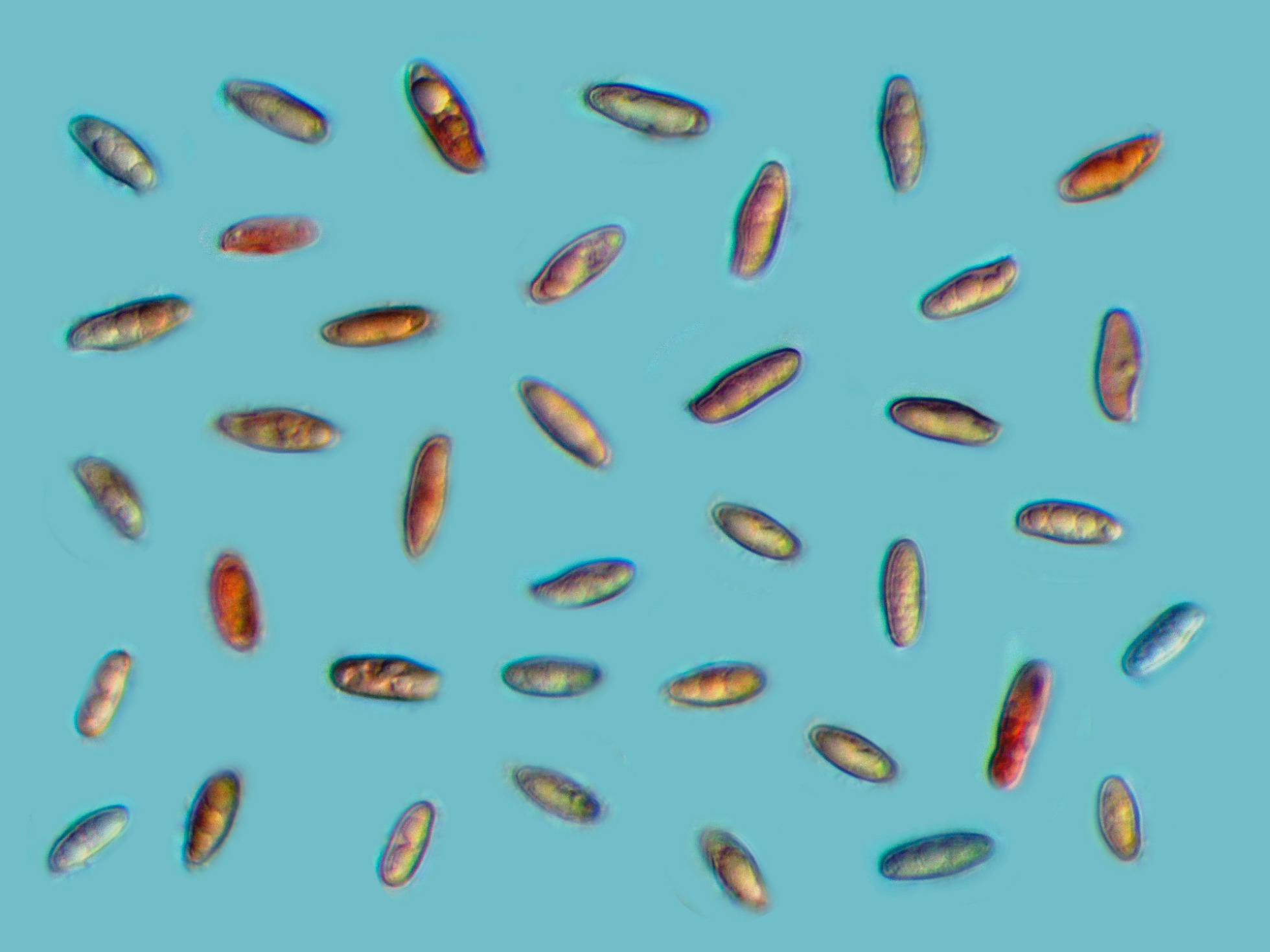 Y por último una imágen de las esporas libres observadas, el basidioma estaba ya muerto y no soltó esporas por medio de la esporulación natural: