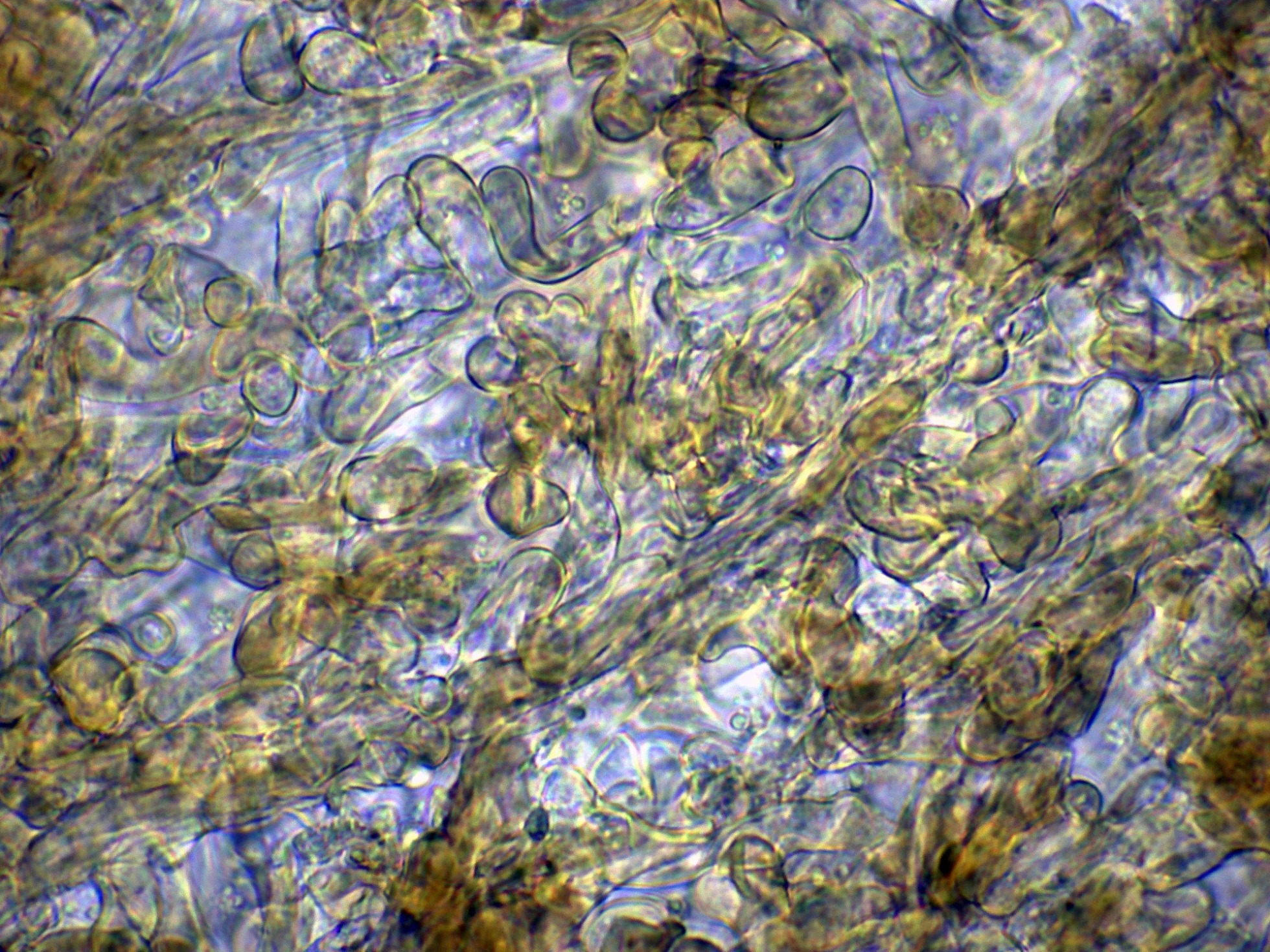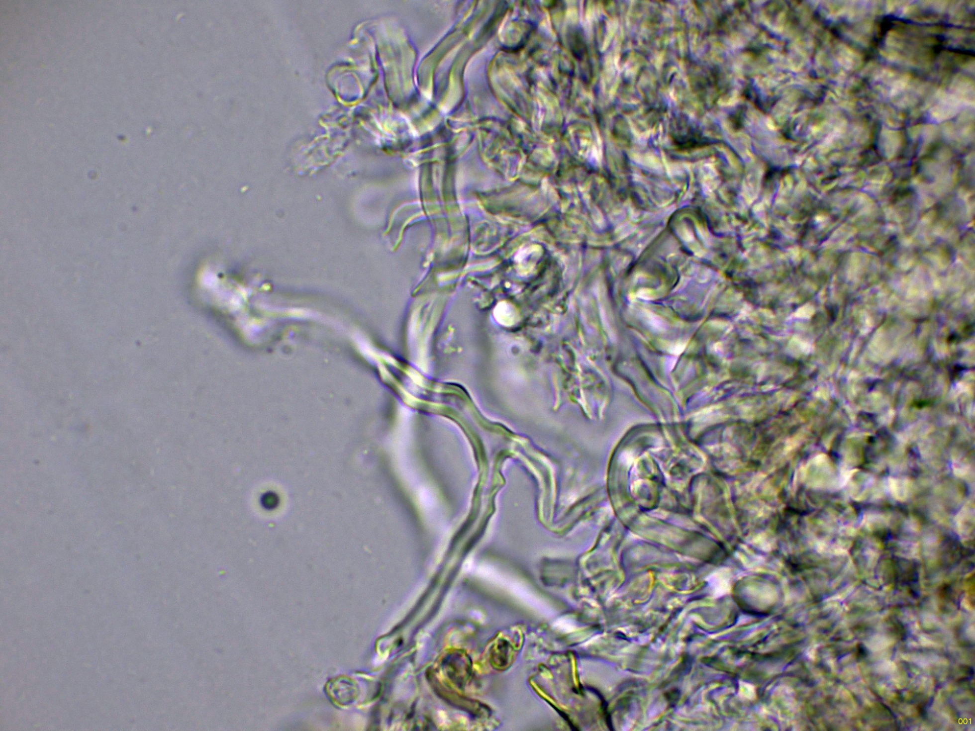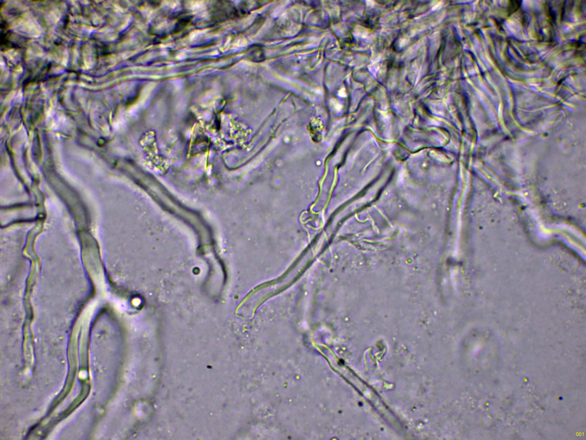 Las mismas hifas en agua, con hifas generativas fibuladas e hifas esqueléticas de pared muy gruesa: