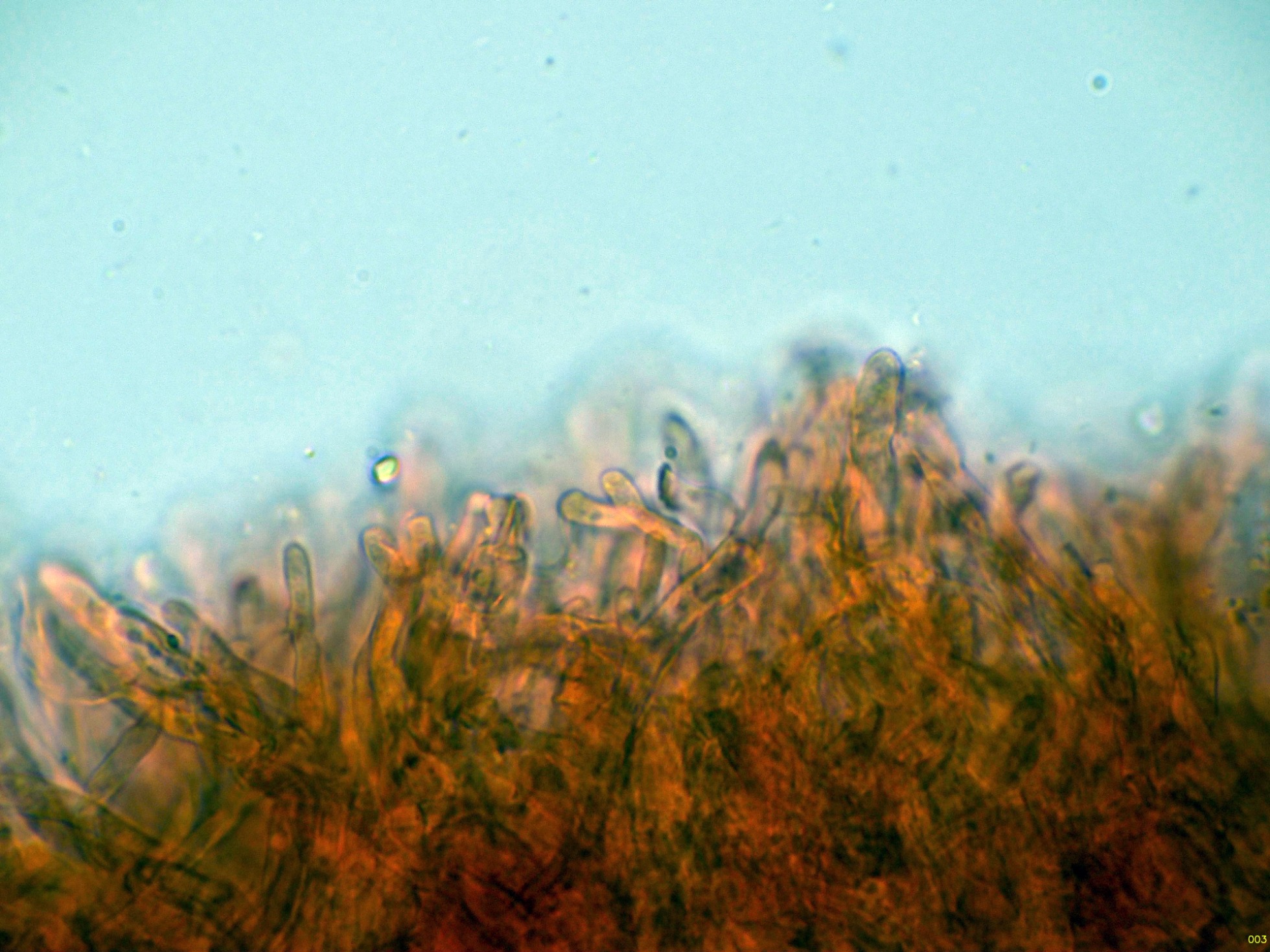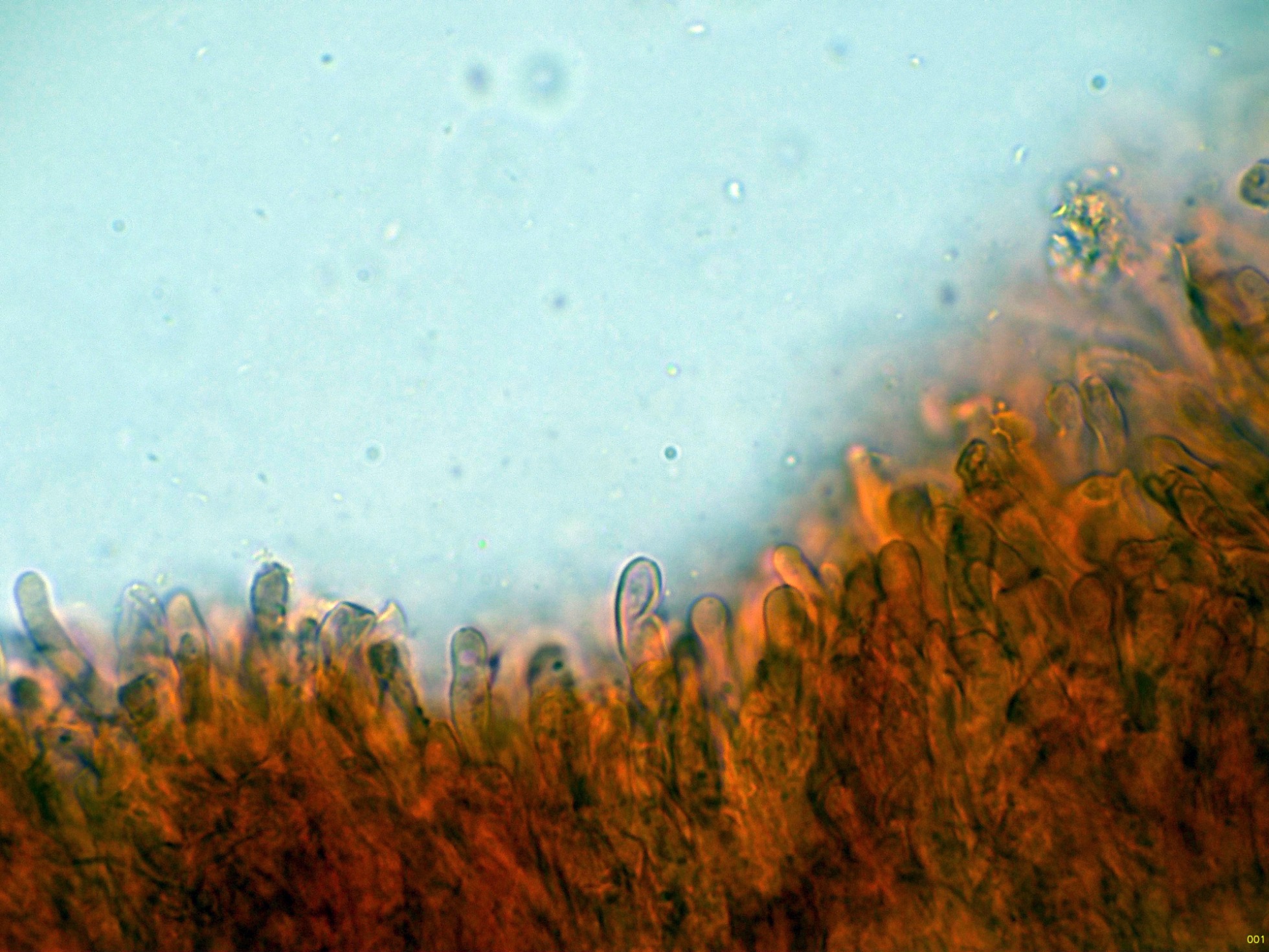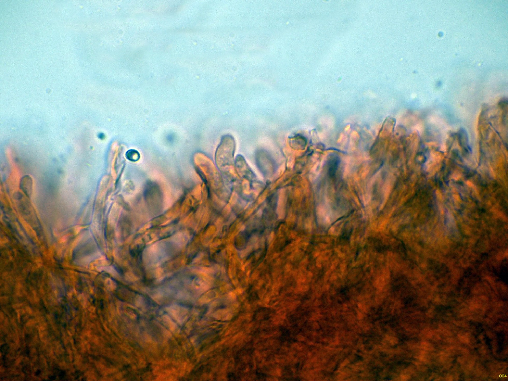 El himenio en solución de Rojo Congo, con solo basidios y basidiolos:
