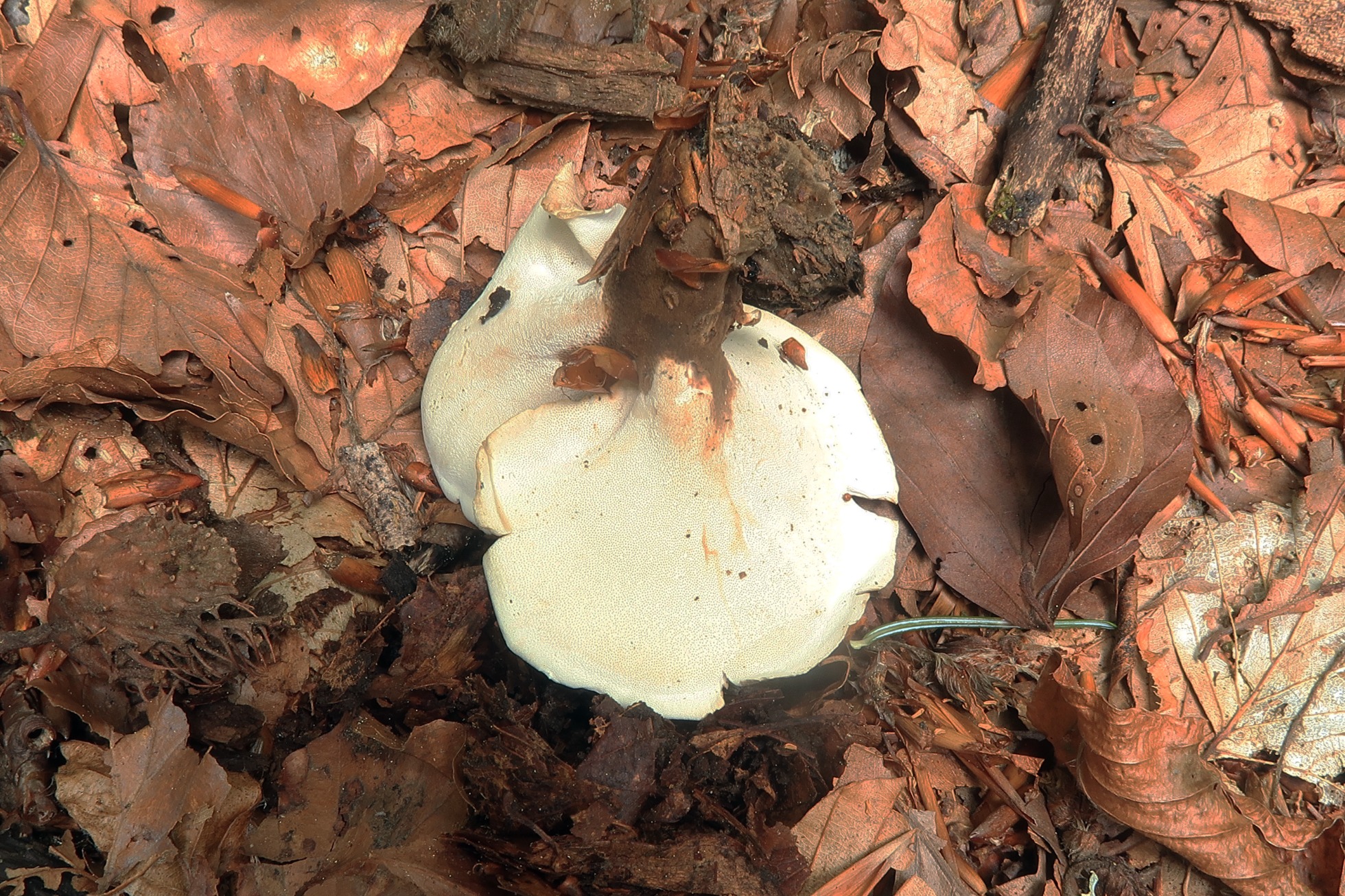Un Polyporal del 15 de agosto pasado, brotando sobre madera del suelo en descomposición, aunque no se trata de una especie que se considere como rara, tampoco es bastante común, el Polyporus melanopus, actualmente: