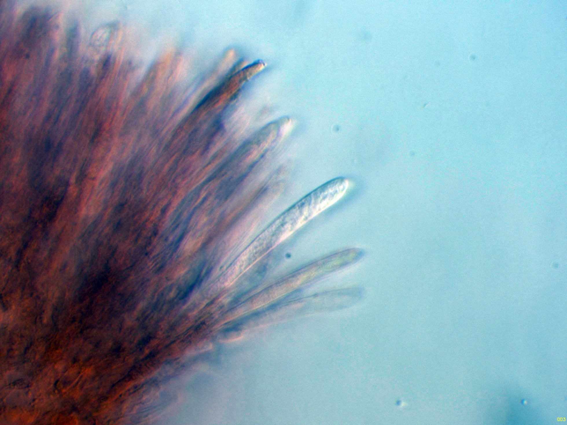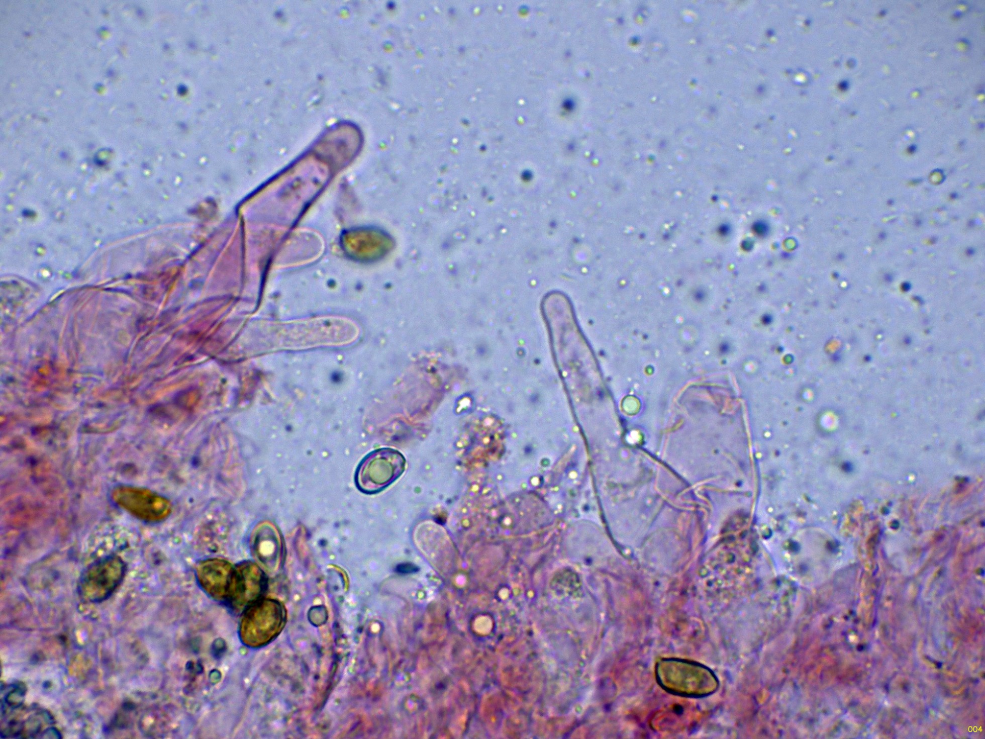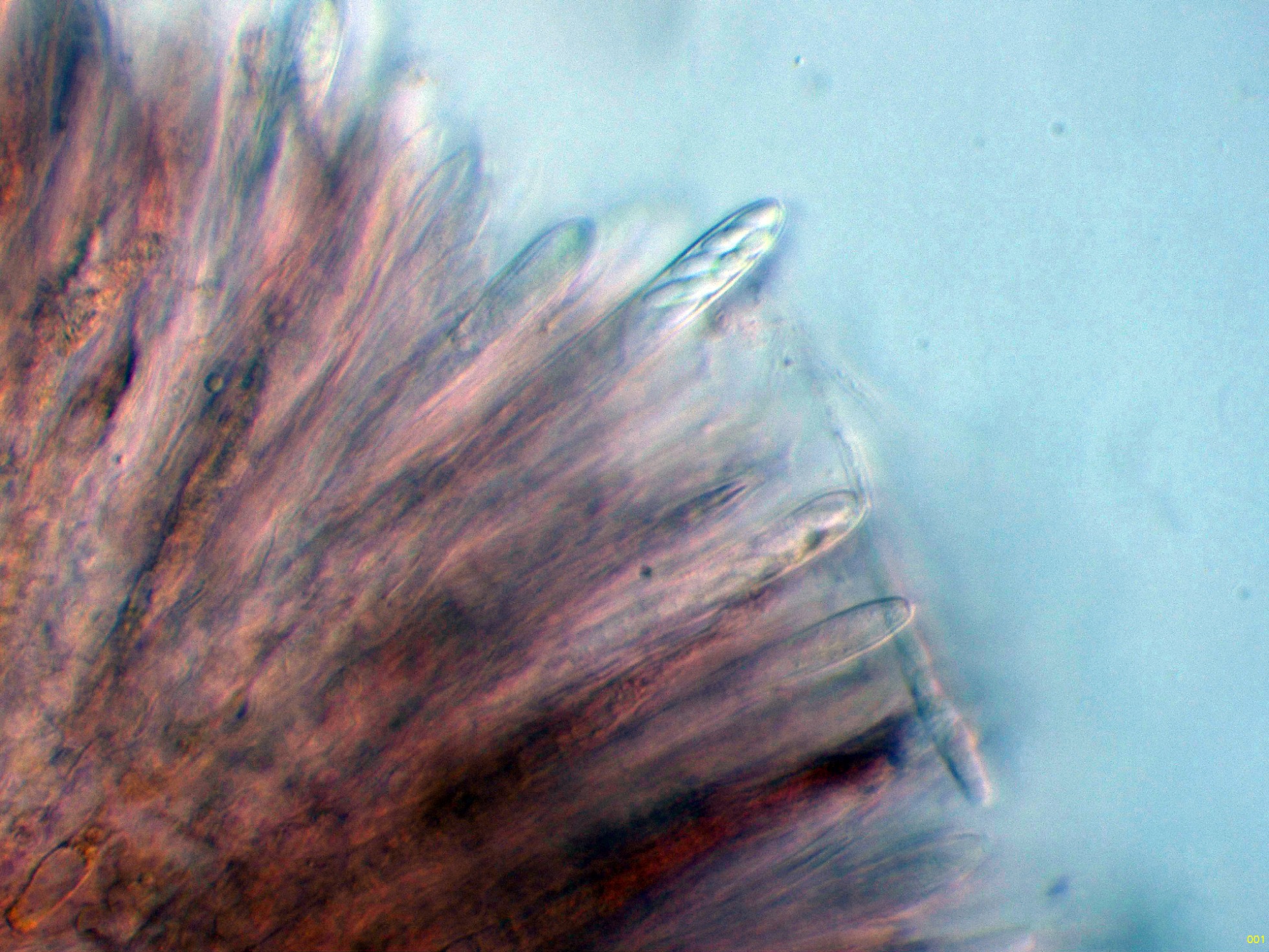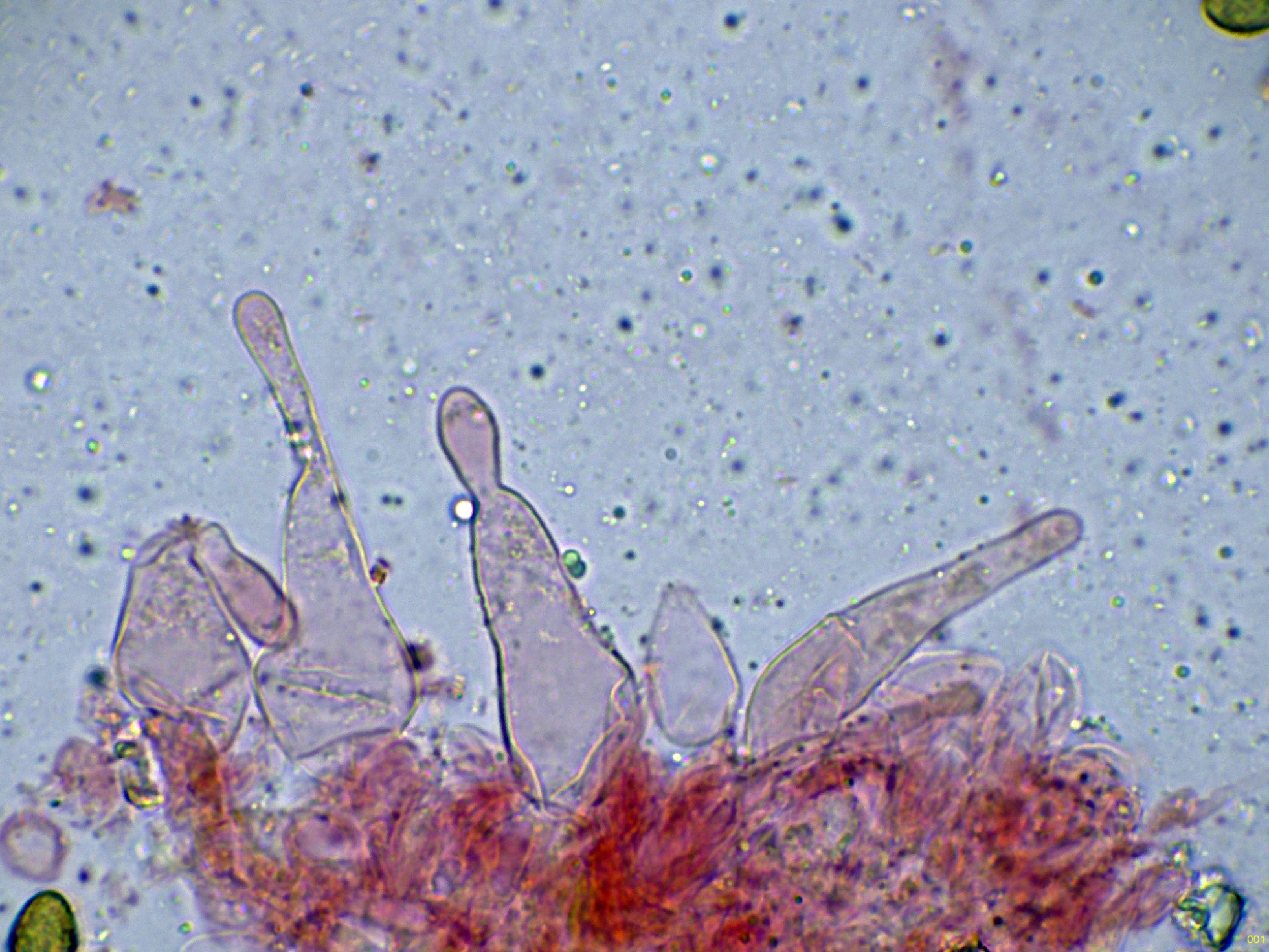 Los queilocistidios con unas medidas de (17.7) 19.3 - 22.2 (24.6), con un diámetro de su cabeza de (3.7) 4 - 4.4 (5) µm.